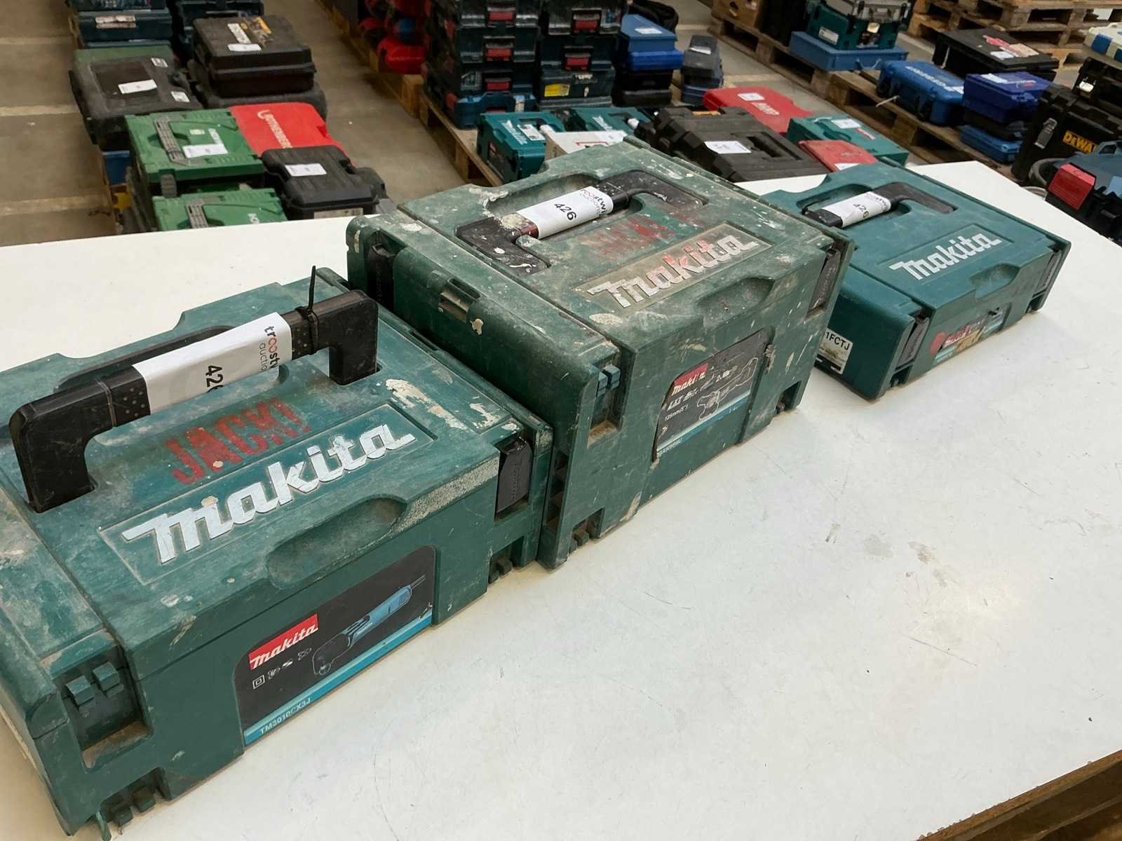 Zijnde: - 4351FCT decoupeerzaag, s/n 168672R - 9565CVR haakse slijpmachine Ø135mm, s/n 26757R - TM3010C multitool, s/n 0211136Y Merk: Makita Aansluiting: 230V Met koffer: true