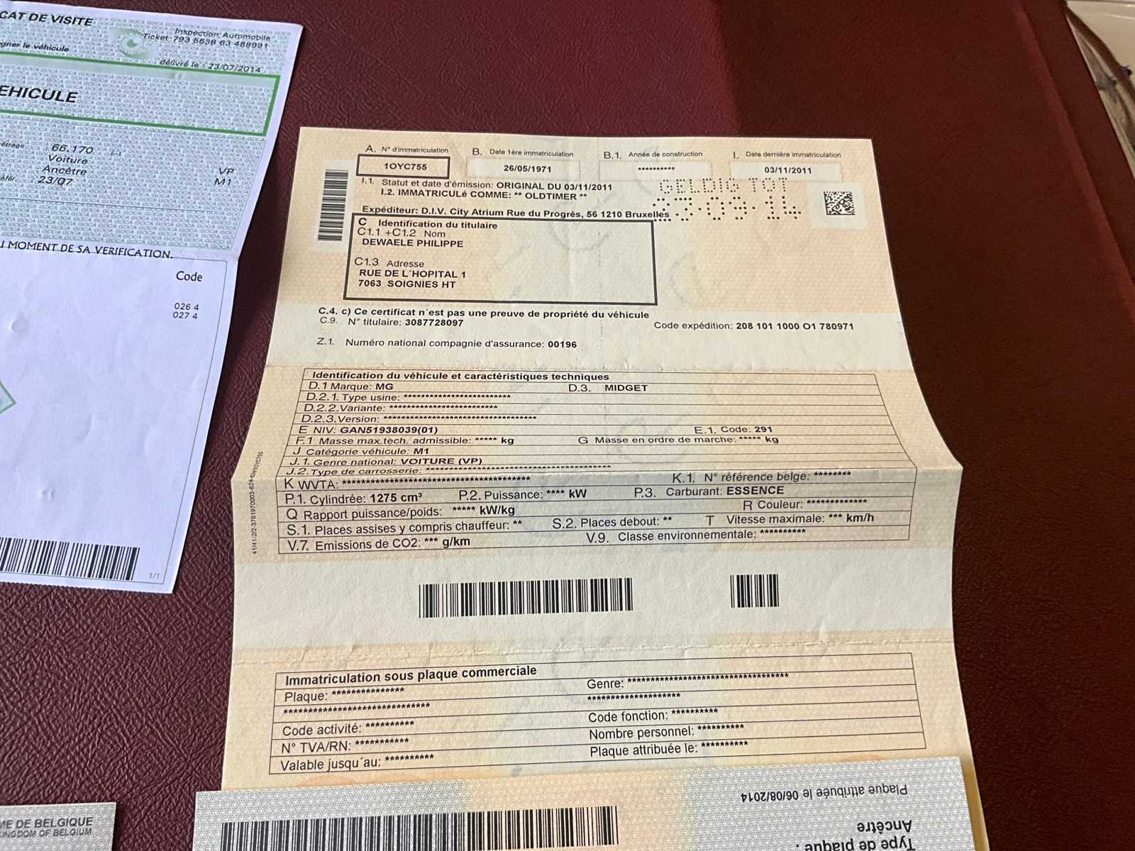 Start en rijdt mits boosten Merk: MG Type: Midget Bouwjaar: 1971 Chassisnummer: GAN51938039 Afgelezen mijlenstand: 67892mi Brandstof: Benzine Datum eerste inschrijving: 26/05/1971 Transmissie: Manueel Aantal deuren: 2 Aantal zitplaatsen: 2 Aantal sleutels: 1 Cilinderinhoud: 1275 Inschrijvingsbewijs - deel 1 : Aanwezig Inschrijvingsbewijs - deel 2: Aanwezig