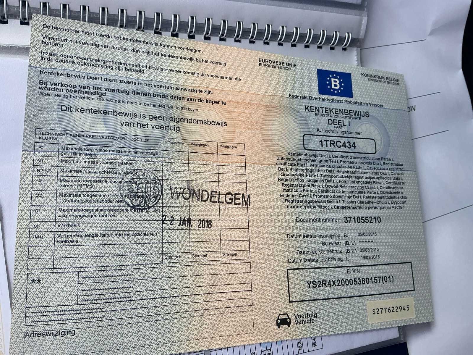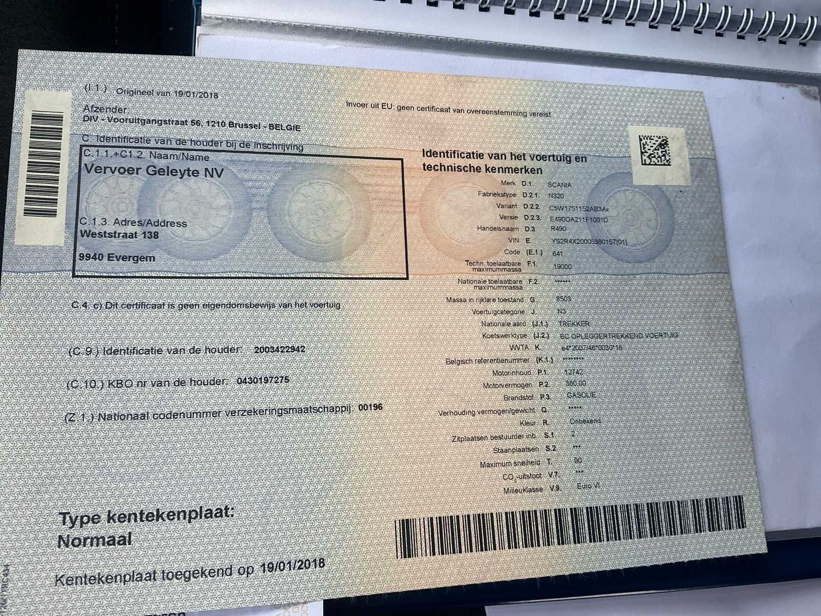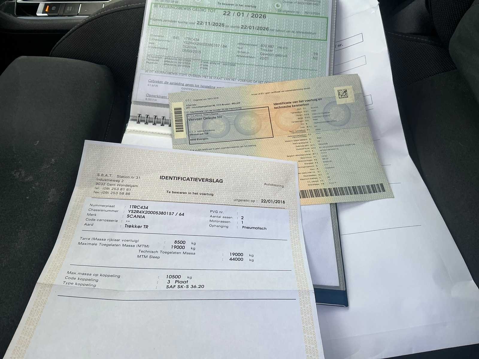 Boorddocumenten: inschrijvingsbewijs deel I en II, gelijkvormigheidsattest, identificatieverslag aanwezig, MTM19000kg, MTM SLEEP 44000kg Kenteken: 1TRC434 Merk: Scania Type: Super R490 Bouwjaar: 2015 Chassisnummer VIN: YS2R4X20005380167 Cilinderinhoud: 12742cc Kilometerstand bij opname: 935493km Datum eerste toelating: 05/03/2015 Type transmissie: Automatisch Aantal assen: 2 Fuel Type: Diesel Emissieklasse: EURO VI Slaapcabine: true Automaat: true Diesel: true