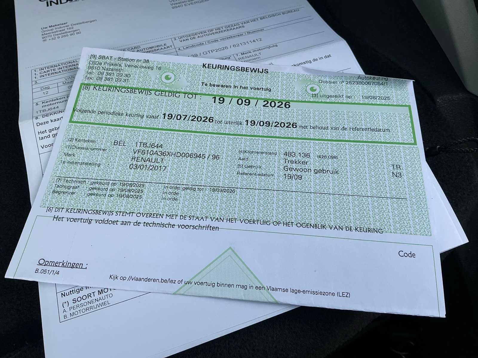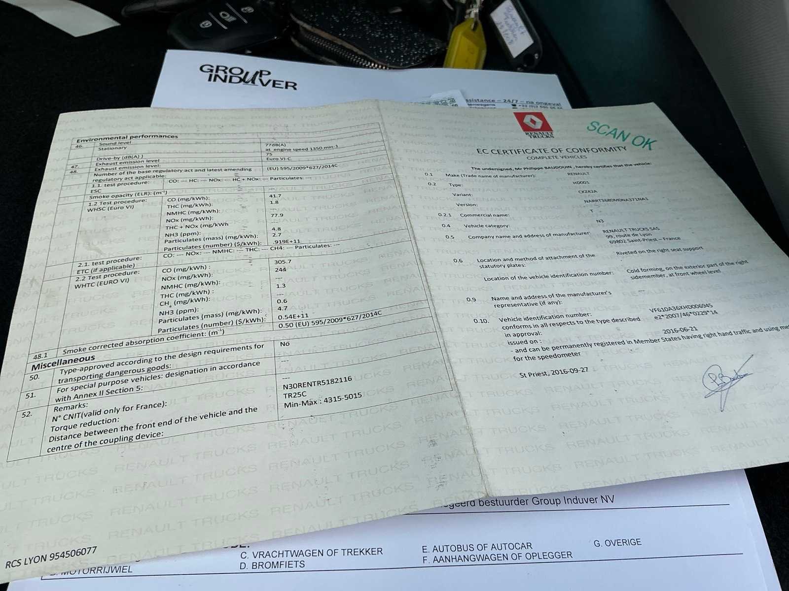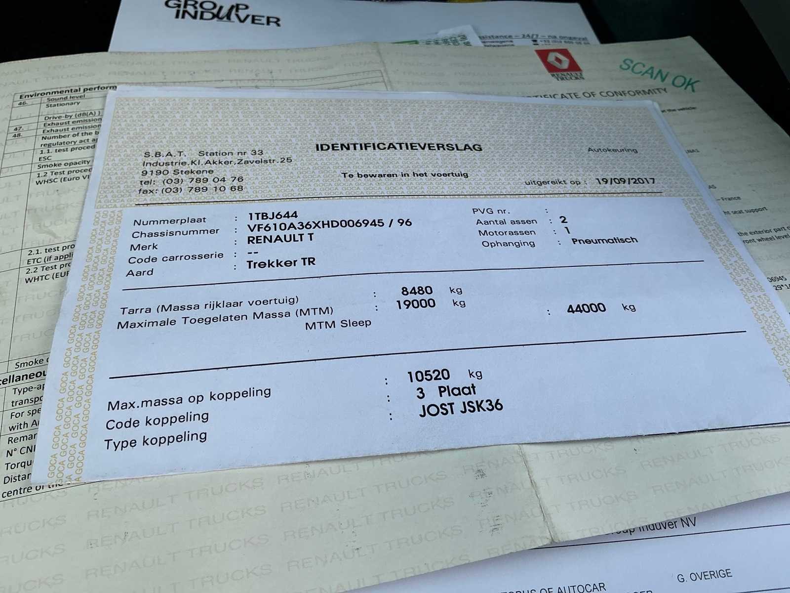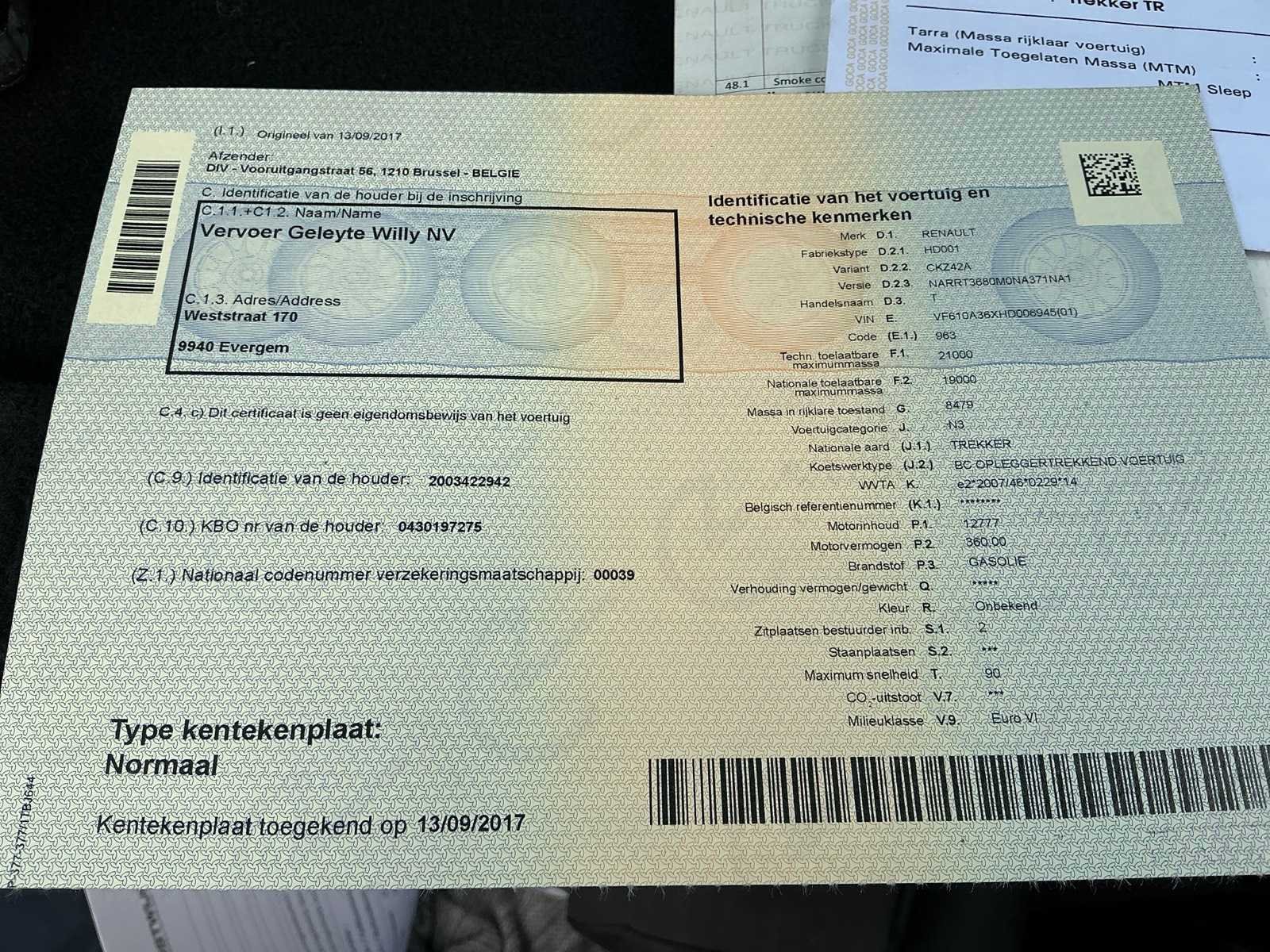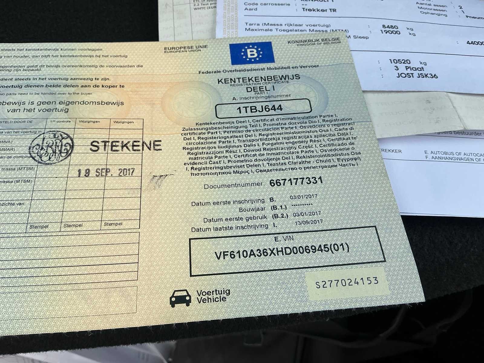 Boorddocumenten: inschrijvingsbewijs deel I en II, gelijkvormigheidsattest en identificatieverslag aanwezig, MTM19000kg, MTM SLEEP 44000kg Kenteken: 1TBJ644 Merk: Renault Type: T480 Comfort THD001 HIGH EDITION Bouwjaar: 2017 Chassisnummer VIN: VF610A36XHD006945 Cilinderinhoud: 12777cc Kilometerstand bij opname: 496021km Datum eerste toelating: 03/01/2017 Type transmissie: Automaat Aantal assen: 2 Emissieklasse: EURO VI Slaapcabine: true Automaat: true Diesel: true