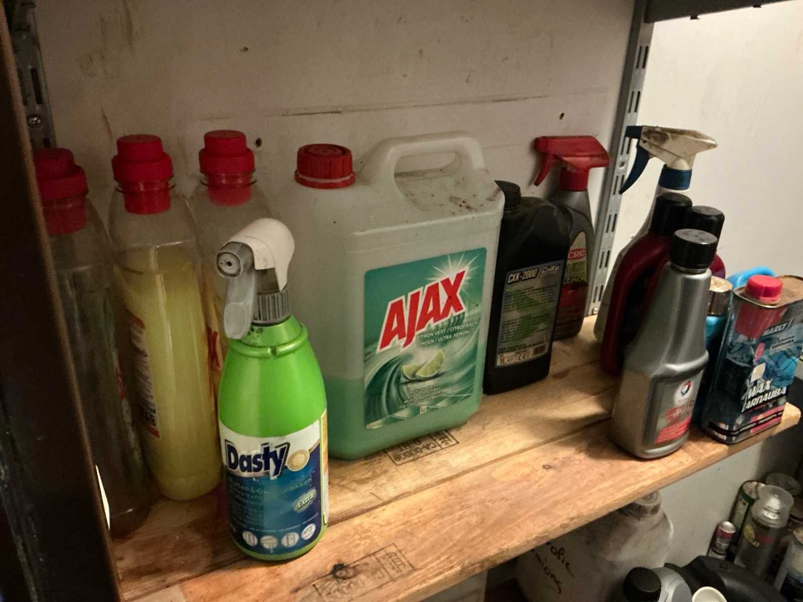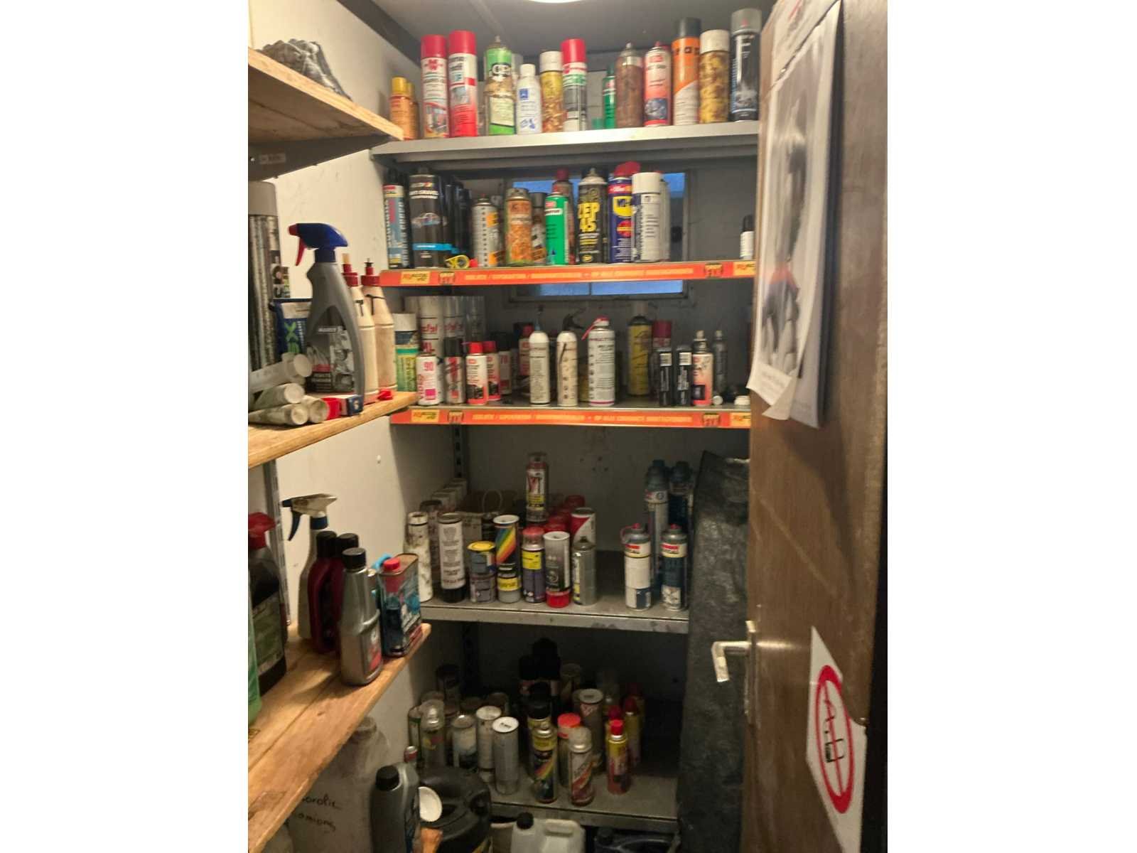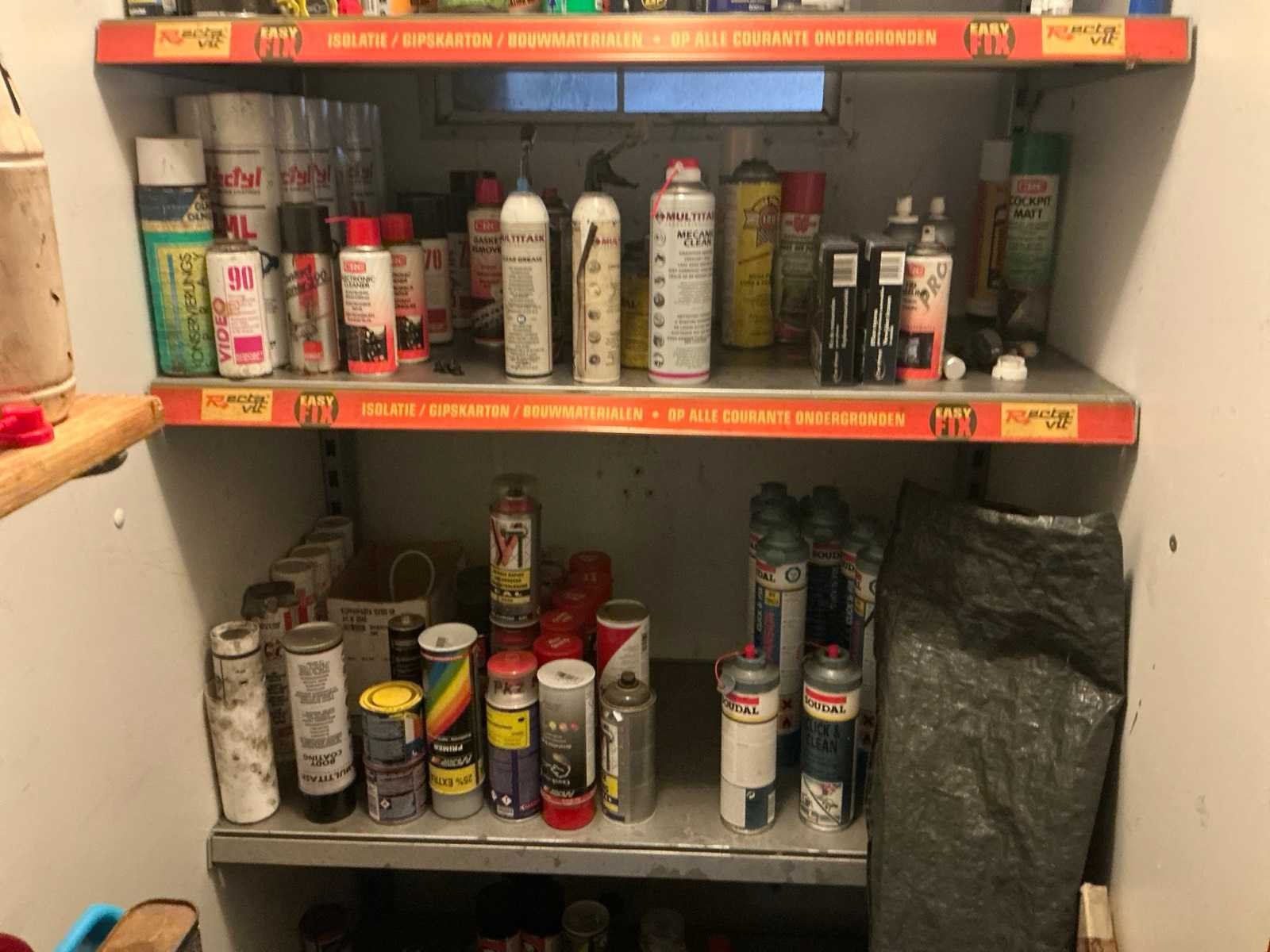 Bestaande uit diverse spuitbussen met reinigingsmiddelen en verf.