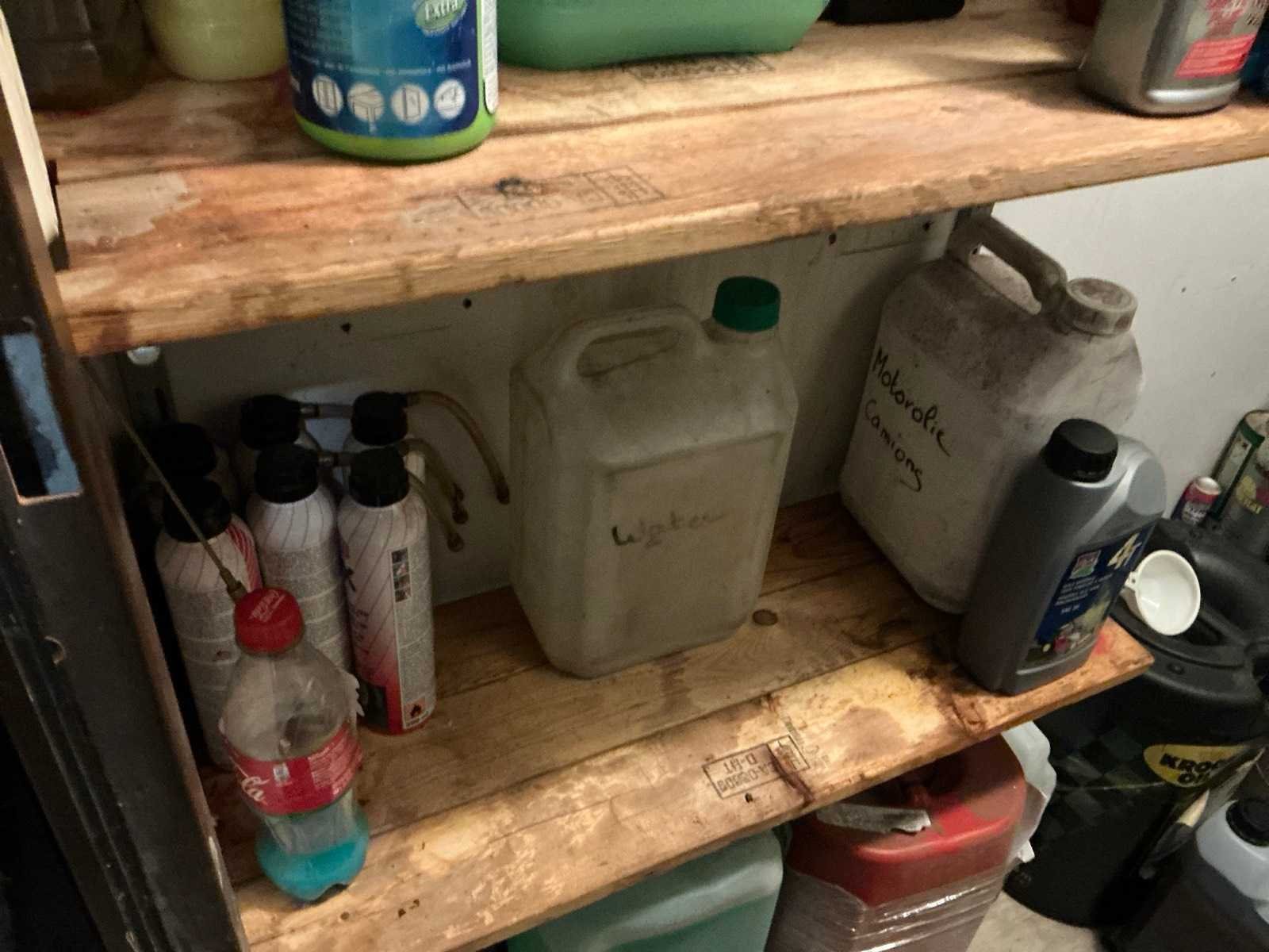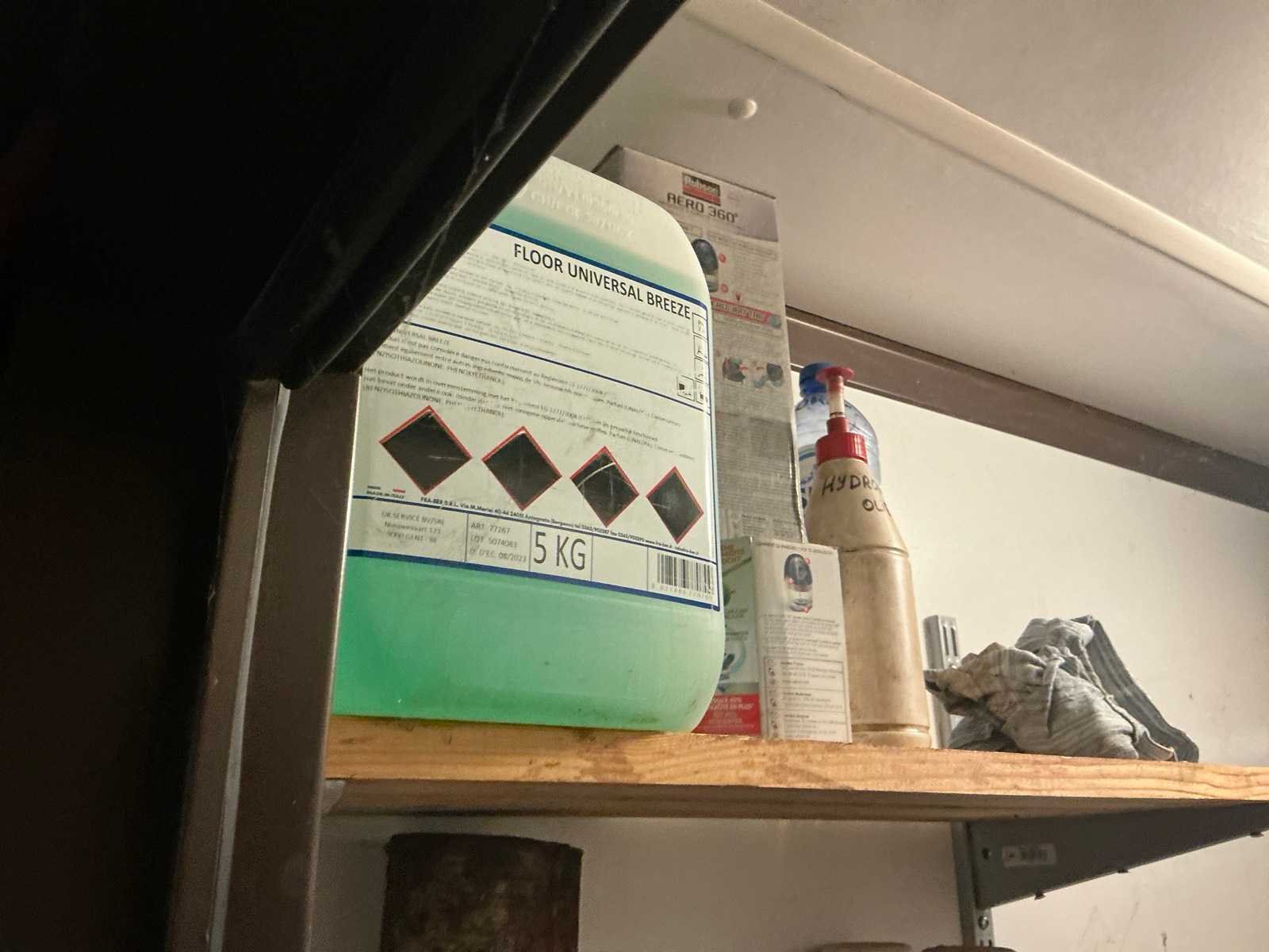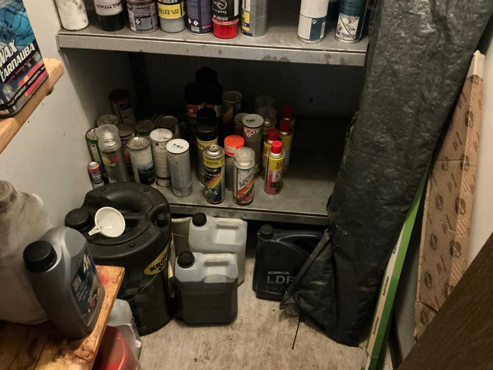 Bestaande uit diverse spuitbussen met reinigingsmiddelen en verf.