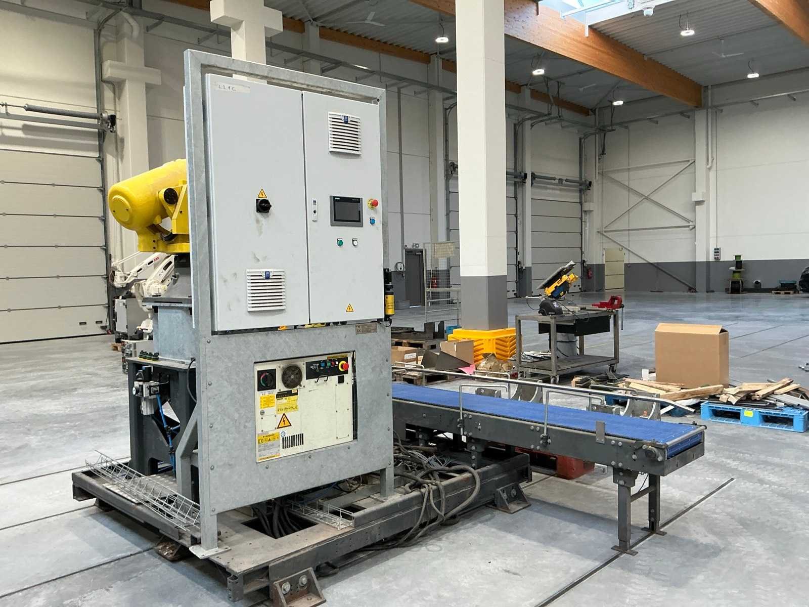 Voorzien van : elektrisch aangedreven transportband met aangebouwde kleine rollerbaan/ met inbegrip van controller Fanuc type System R-30iB/ 2 aanrijbeveiligingselementen Merk: Fanuc Model: R-2000iB 125L Lengte: 350cm Breedte: 300cm Hoogte: 335cm