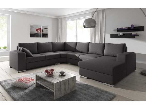 Type: Willy; afmeting L: 280 cm; B: 360 cm; hoeksalon bestaande uit: 3 zitten, hoek, 2 zitten, longchair, kleur: grijs stof; poten: 16; staat: in verpakking;