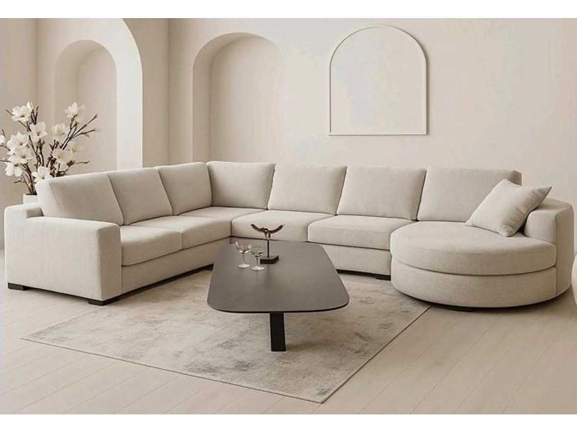 Type: Willy; afmeting L: 280 cm; B: 380 cm; hoeksalon bestaande uit: 3 zitten, hoek, 2 zitten, longchair, kleur: beige stof; poten: 16; staat: in verpakking;