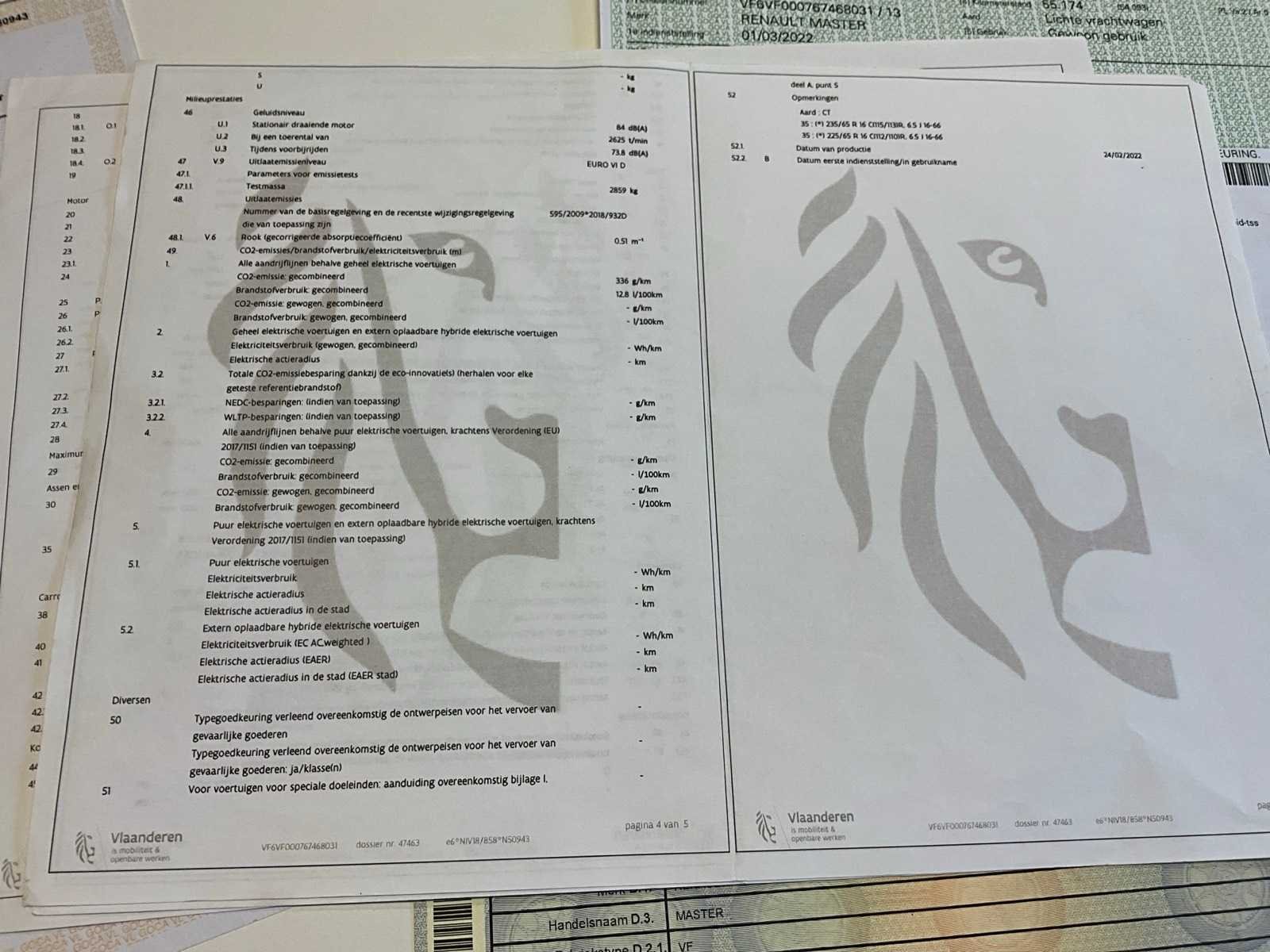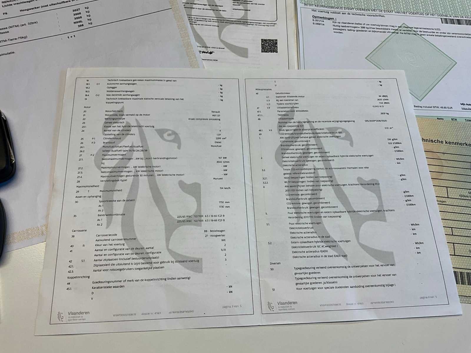 • inschrijvingsbewijs: deel 1 en deel 2 aanwezig • COC: aanwezig • identificatieverslag: aanwezig • MTM: 3500Kg Voorzien van hoogtewerker: • Klubb, KL32 • bouwjaar: 2022 • werkhoogte: 10,5 meter • handleiding aanwezig Opmerkingen: • voorruit gebarsten • code niet aanwezig • gebruikssporen Merk: Renault Type: Master Chassisnummer: VF6VF000767468031 Afgelezen kilometerstand: 75726km Cilinderinhoud: 2299cc Vermogen (kW): 107kW Brandstof: diesel Datum eerste inschrijving: 01/03/2022 Transmissie: Handgeschakeld Aantal zitplaatsen: 2 Nationaliteit documenten: B Aantal sleutels: 2 Ledig gewicht: 3027kg Emissieklasse: Euro 6 Boorddocumenten aanwezig?: true