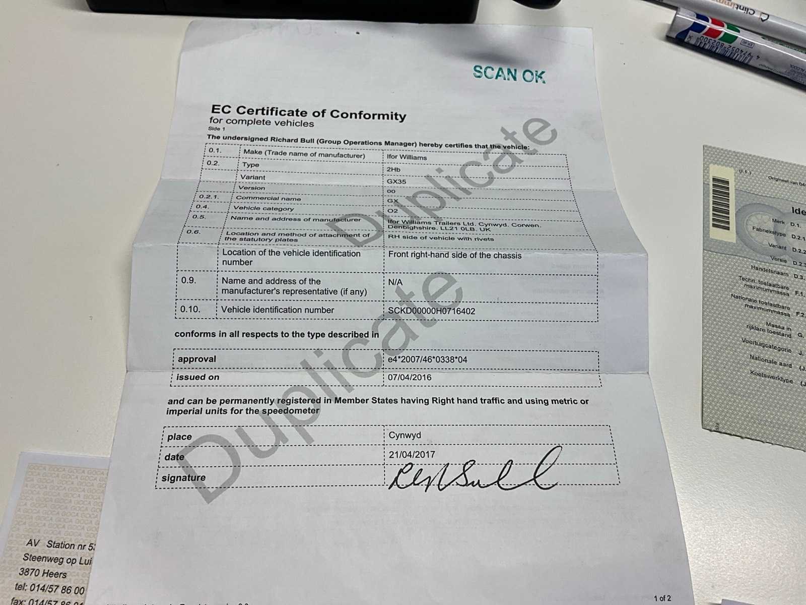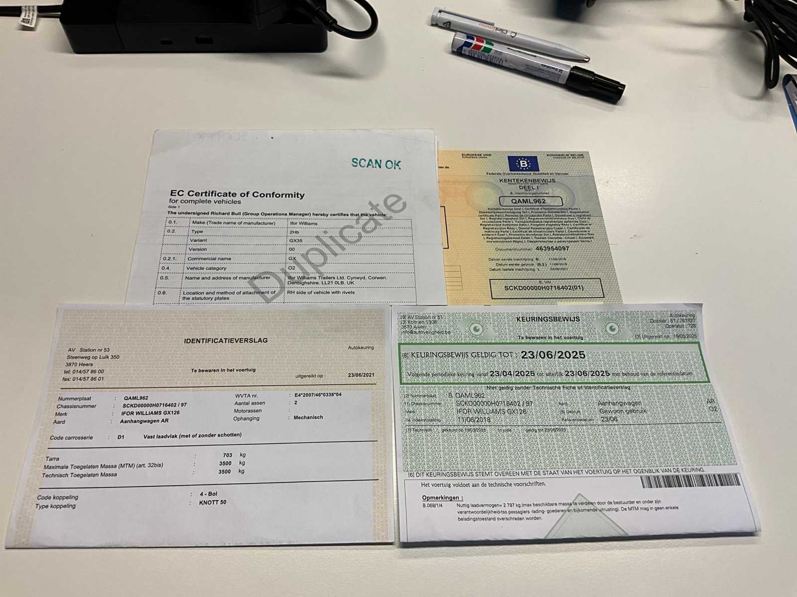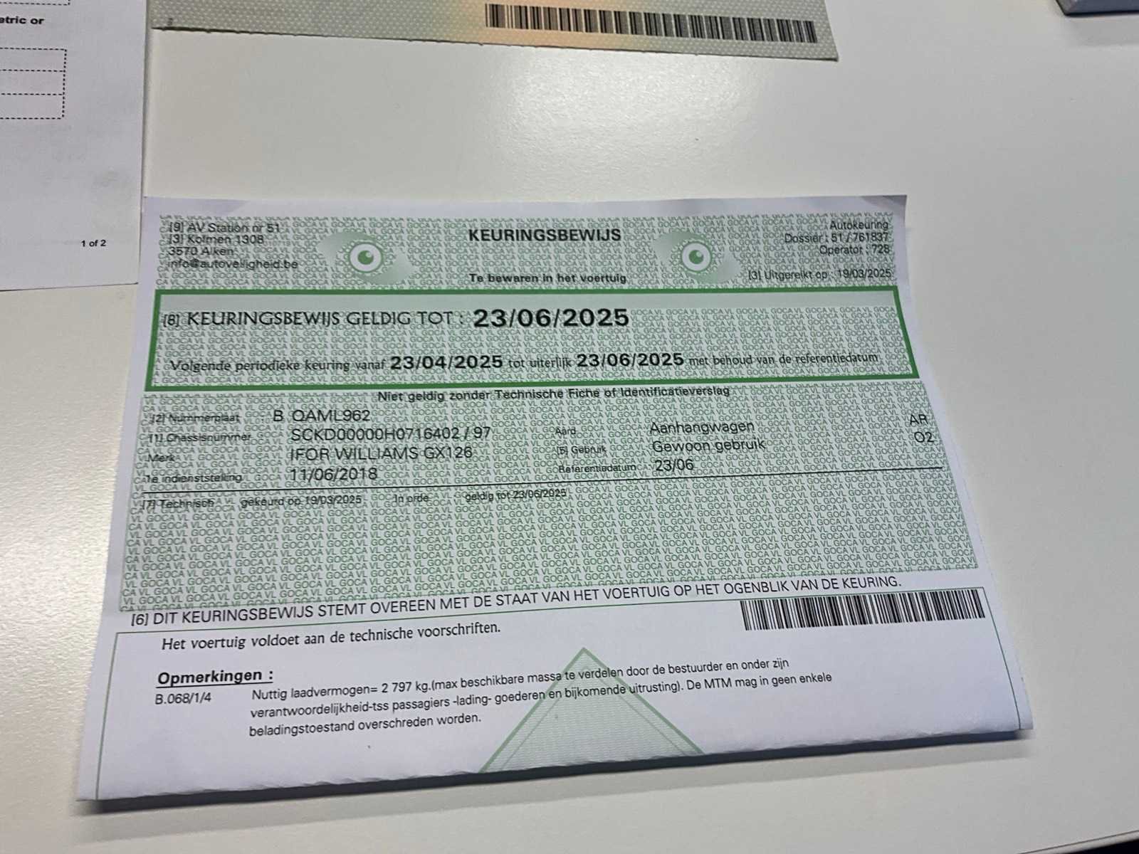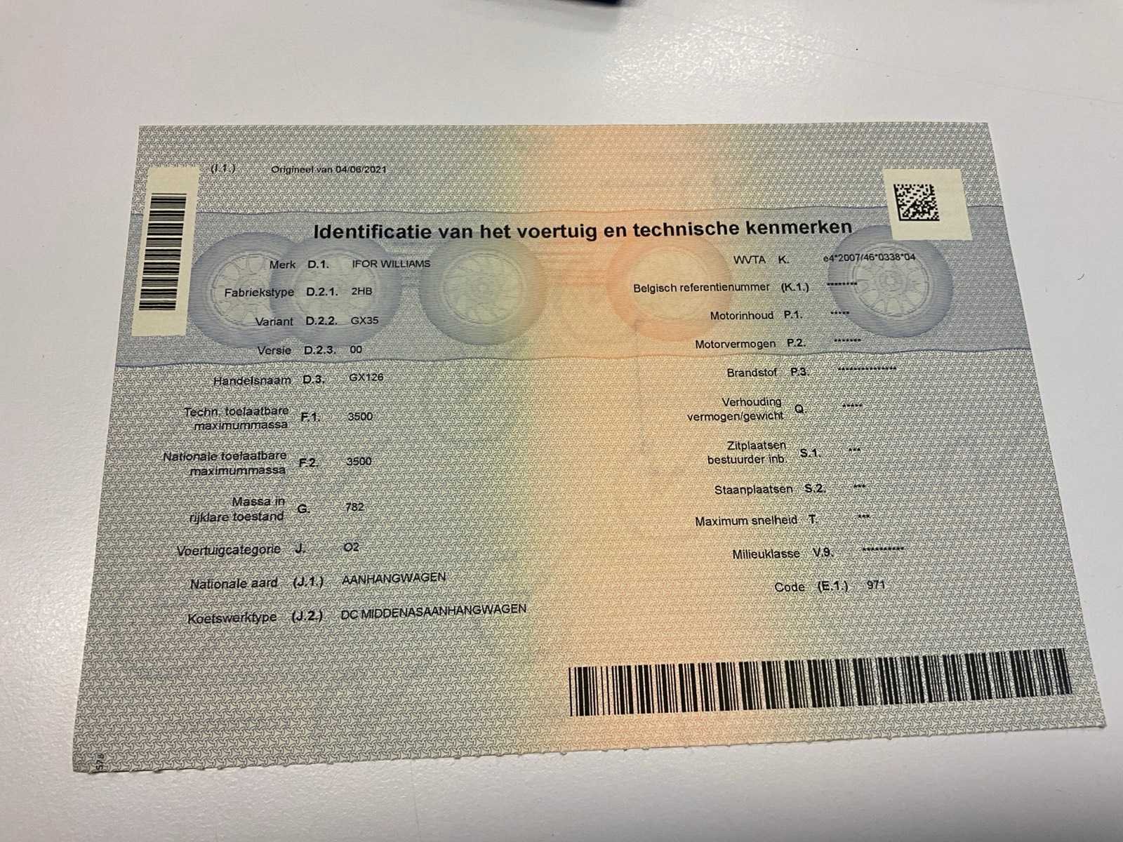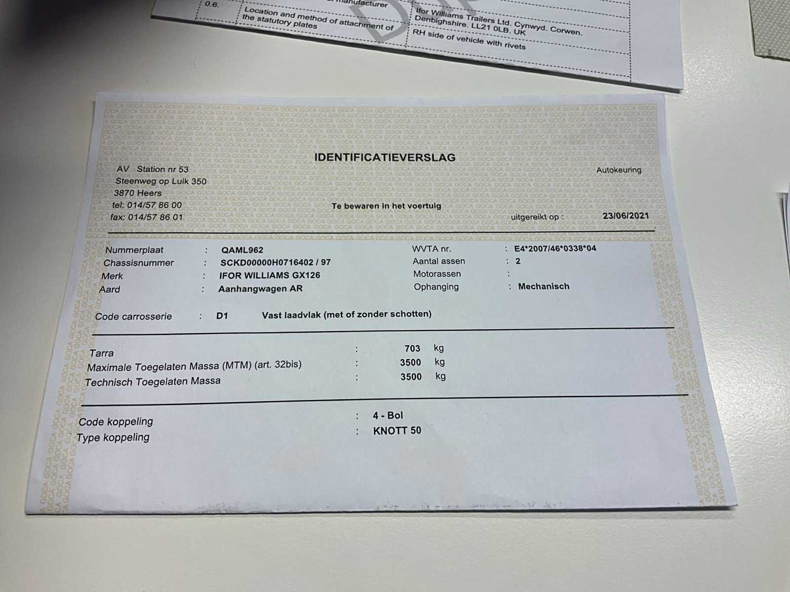 • MTM: 3500kg • manueel neerklapbaar achterbord • inschrijvingsbewijs: deel 1 aanwezig • identificatieverslag: aanwezig • COC: aanwezig Merk: Ifor Williams Type: 2HB GX35 Chassisnummer: SCKD00000716402 Aantal assen: 2 Laadbak afmeting l: 370cm Laadbak afmeting b: 185cm Ledig gewicht: 703kg Datum eerste toelating: 11/06/2018 Nationaliteit documenten: B