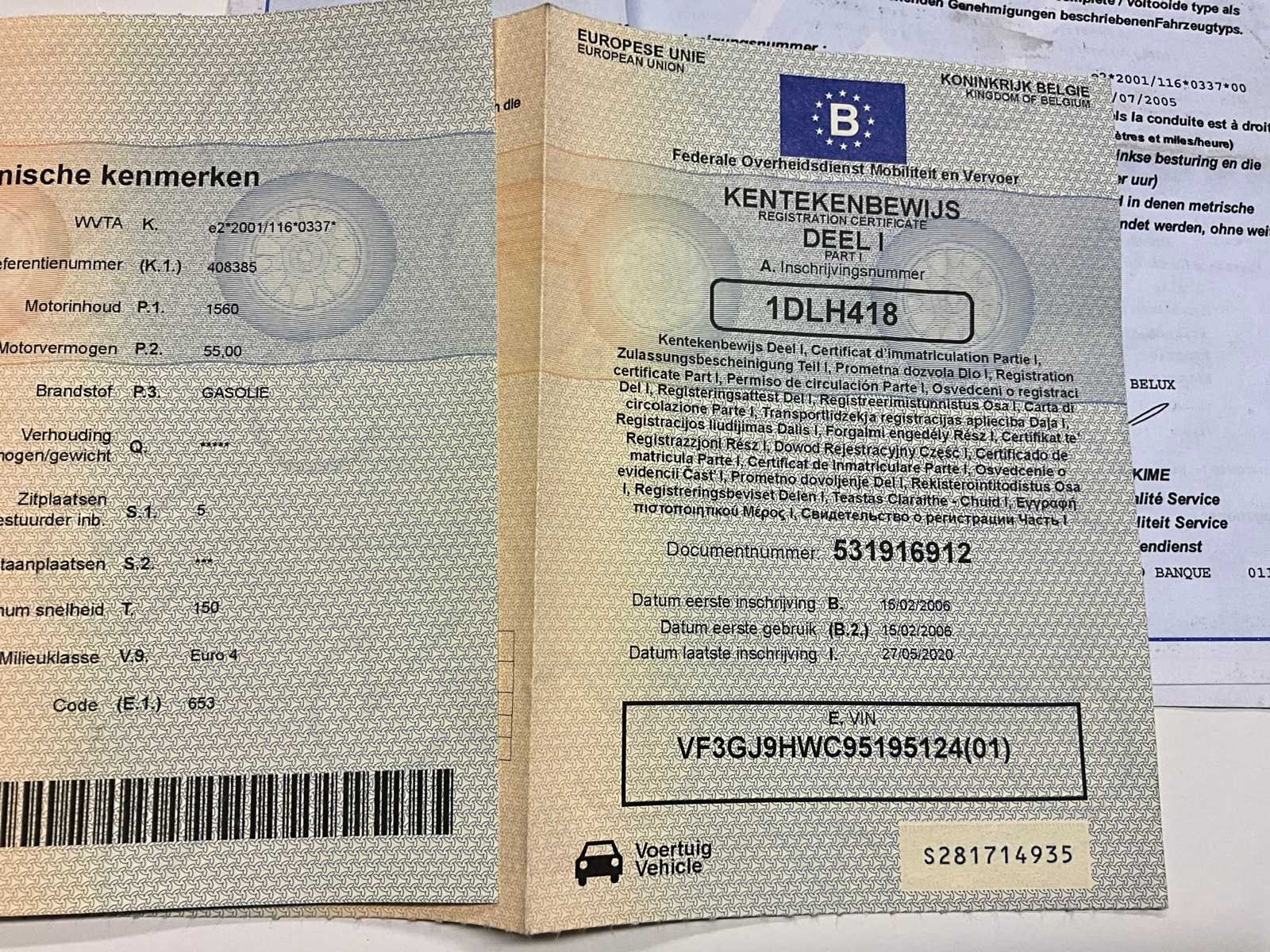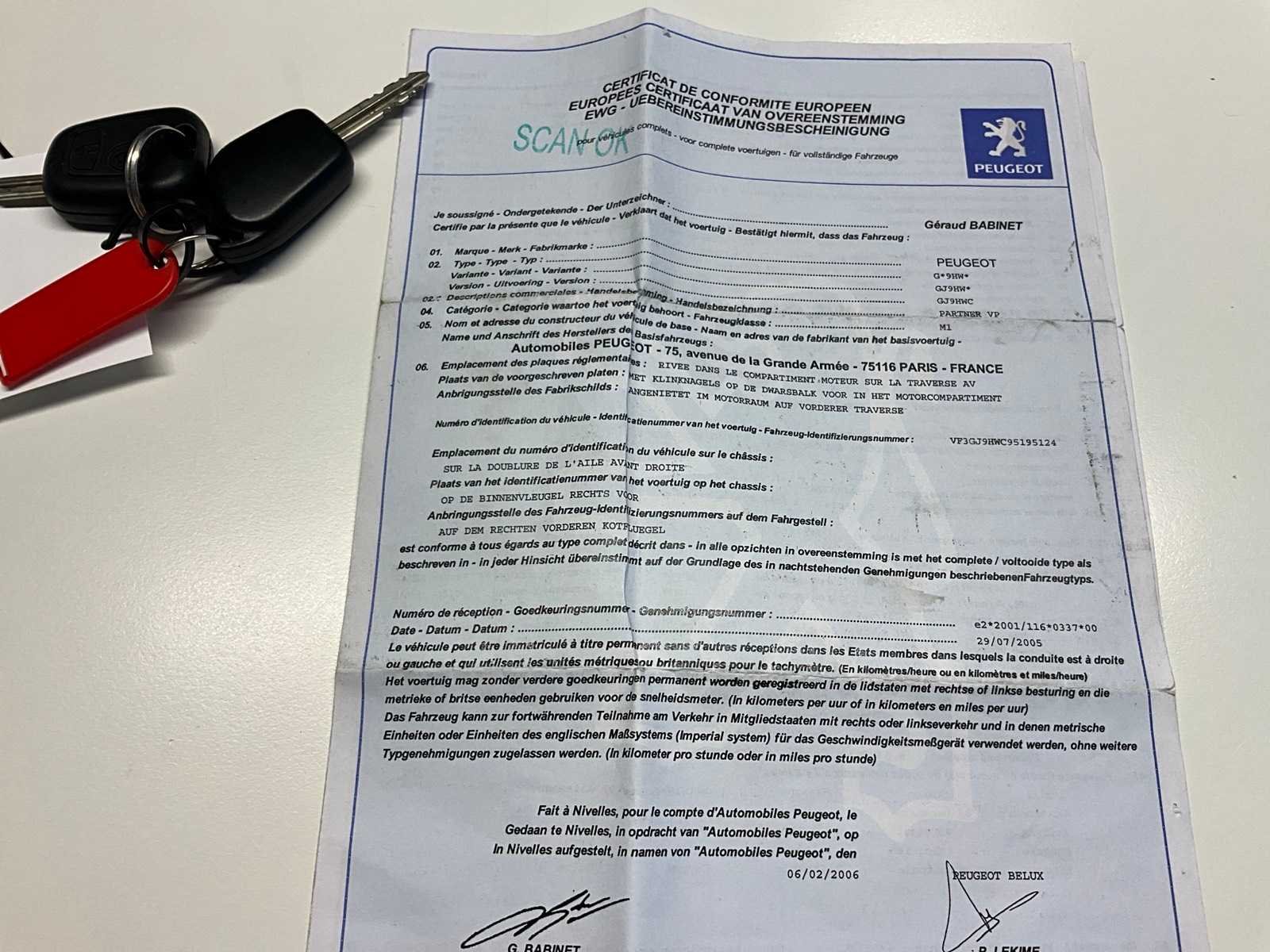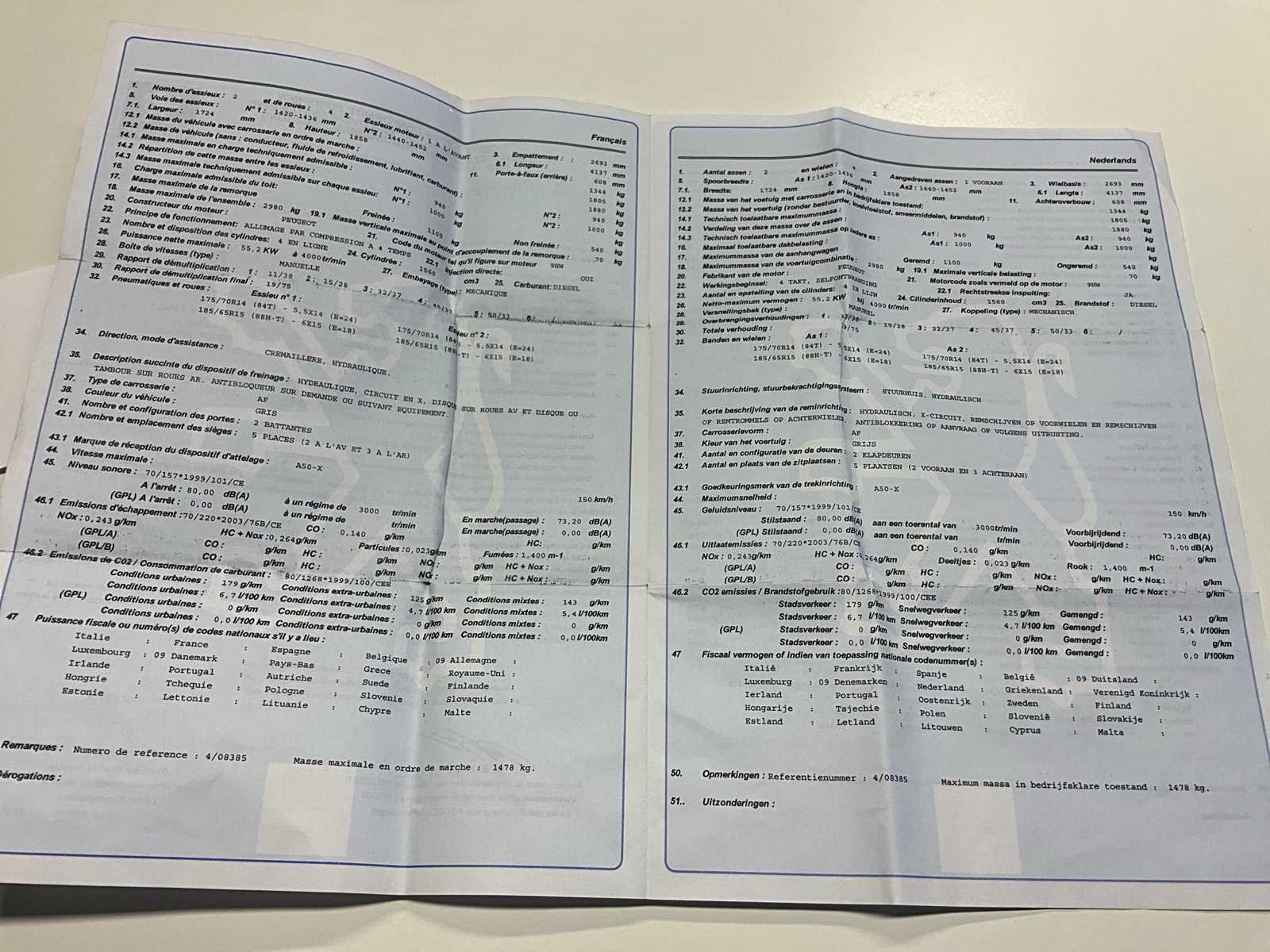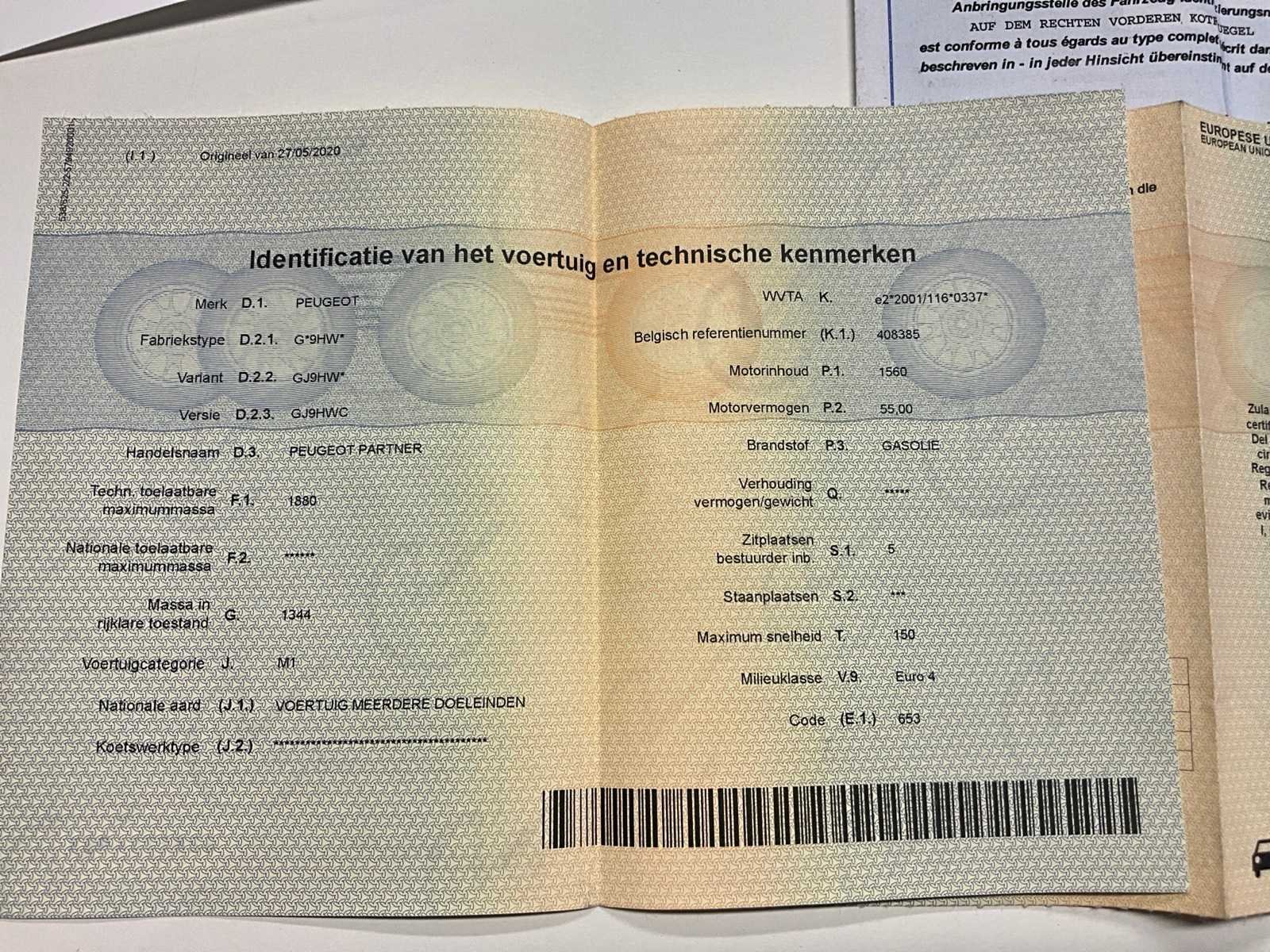 • Inschrijvingsbewijs: deel 1 en deel 2 aanwezig • COC: aanwezig Merk: Peugeot Type: Partner Chassisnummer: VF3Gj9HWC95195124 Afgelezen kilometerstand: 213165km Cilinderinhoud: 1560cc Vermogen (kW): 55kW Brandstof: diesel Datum eerste inschrijving: 15/02/2006 Transmissie: Handgeschakeld Aantal zitplaatsen: 5 Nationaliteit documenten: B Aantal sleutels: 2 Emissieklasse: Euro 4