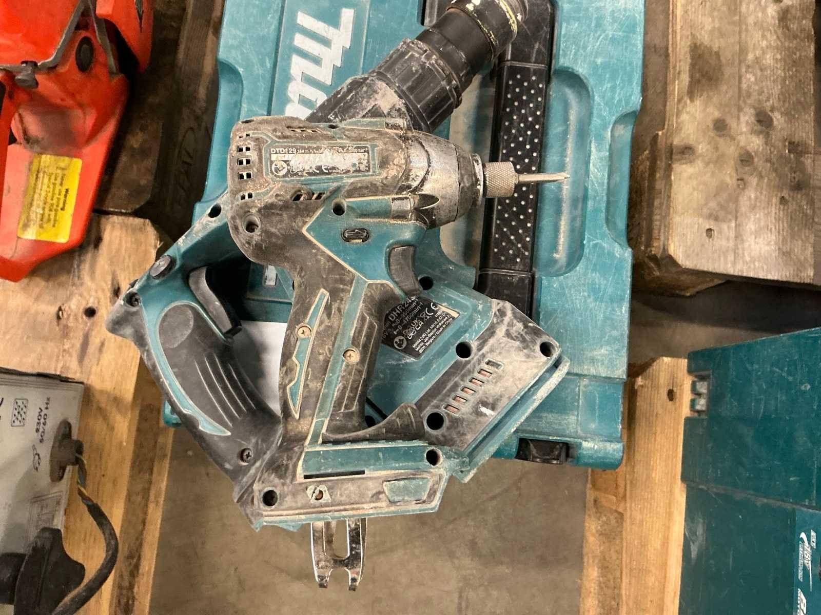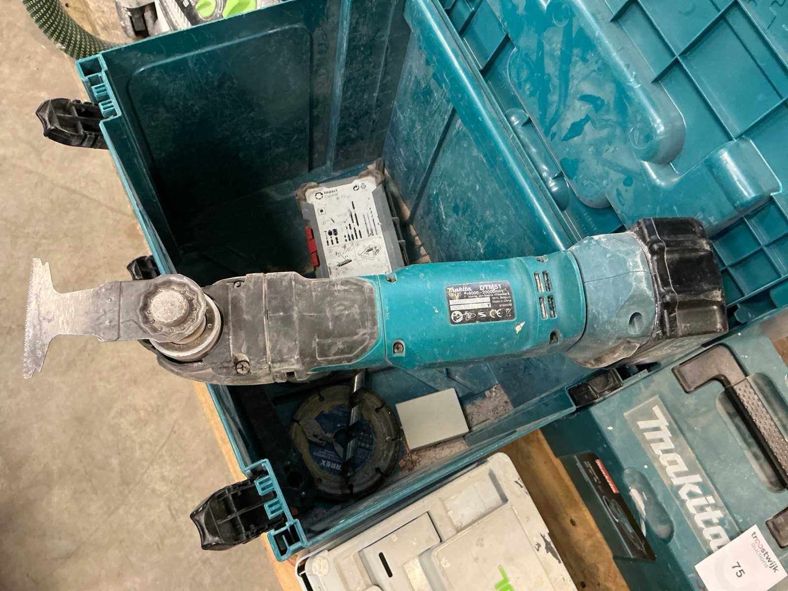 Zijnde multitool type DTM51, klopboormachine DHR243, slagschroevendraaier DTD129, haakse slijper DGA506. Met totaal 1 accu en 1 acculader. Merk: Makita