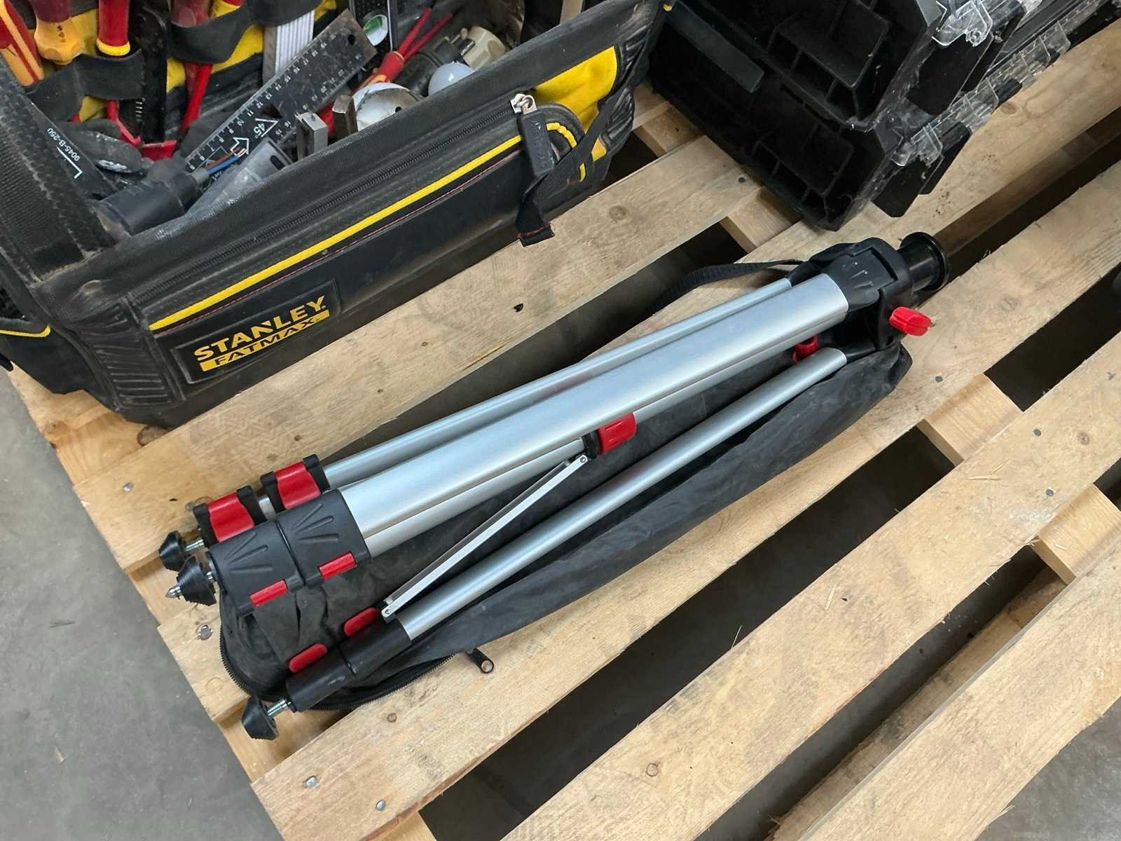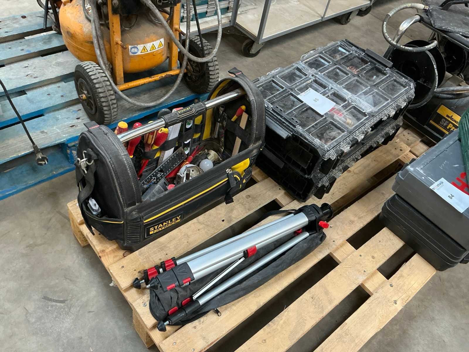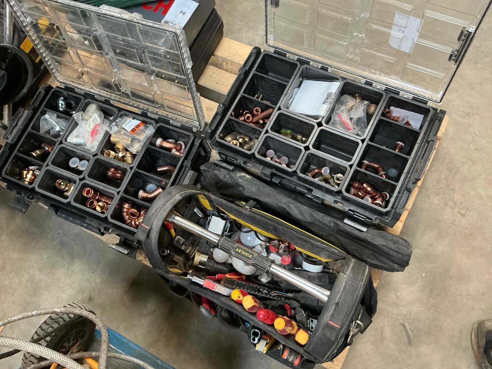 Zijnde: - 2 materiaalkoffers met koperen buiskoppelingstukken - Stanley gereedschapskoffer met diverse handgereedschappen - driepootstatief