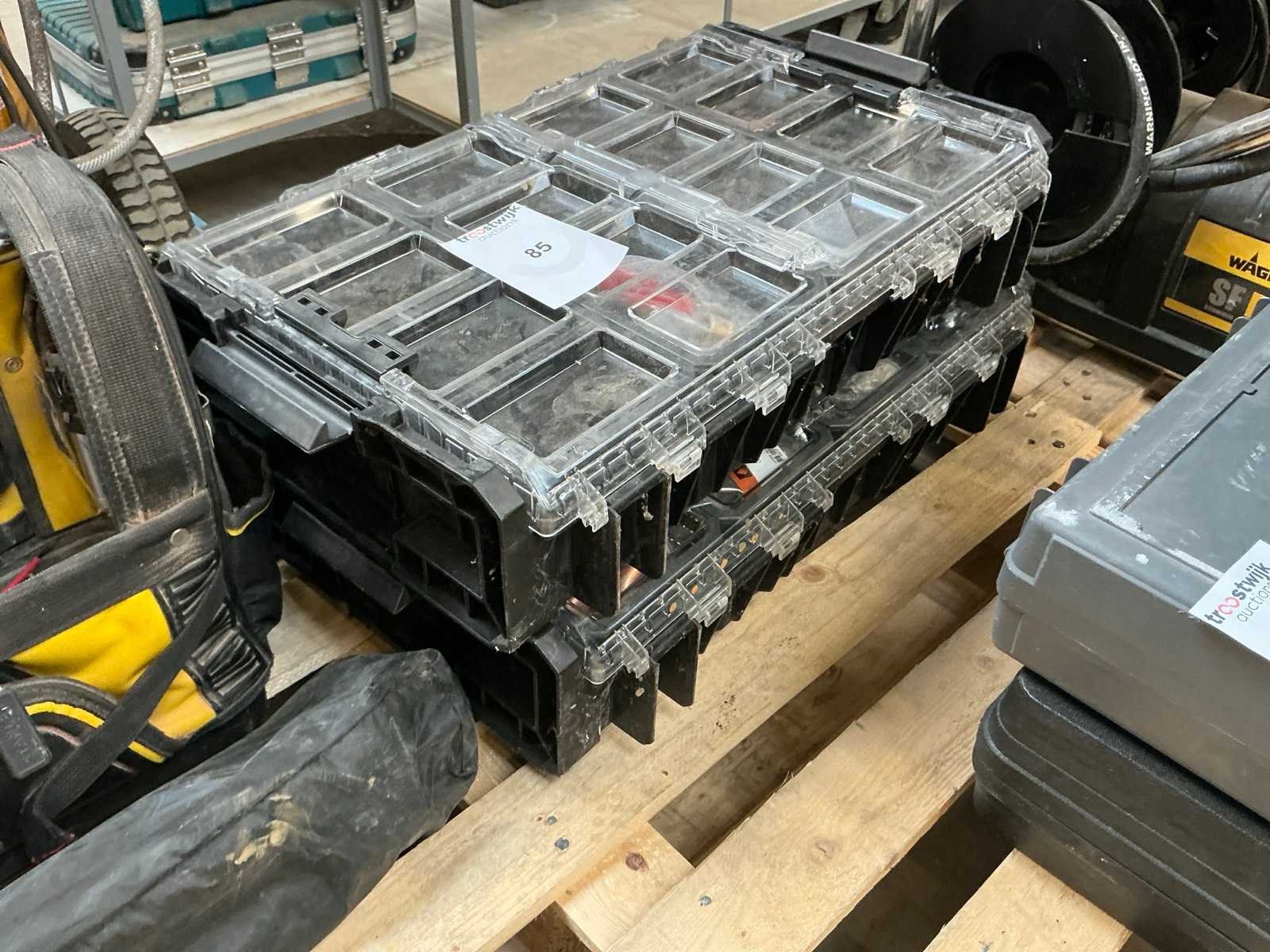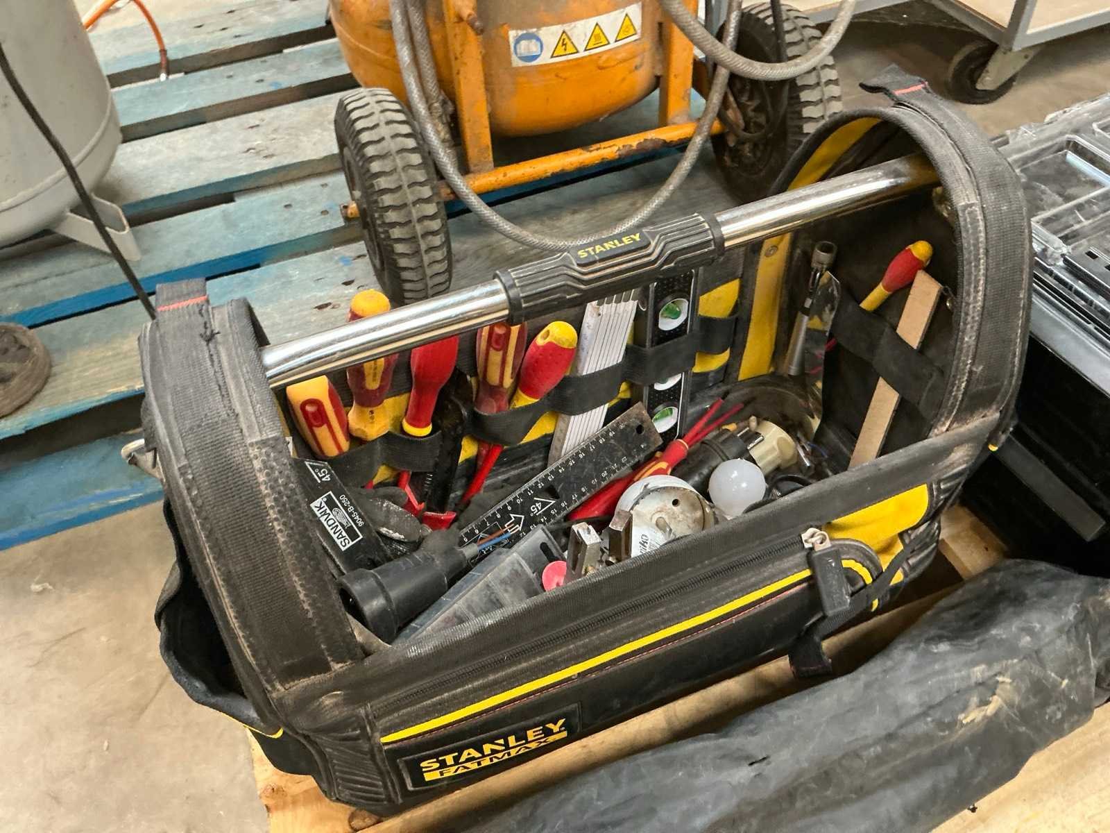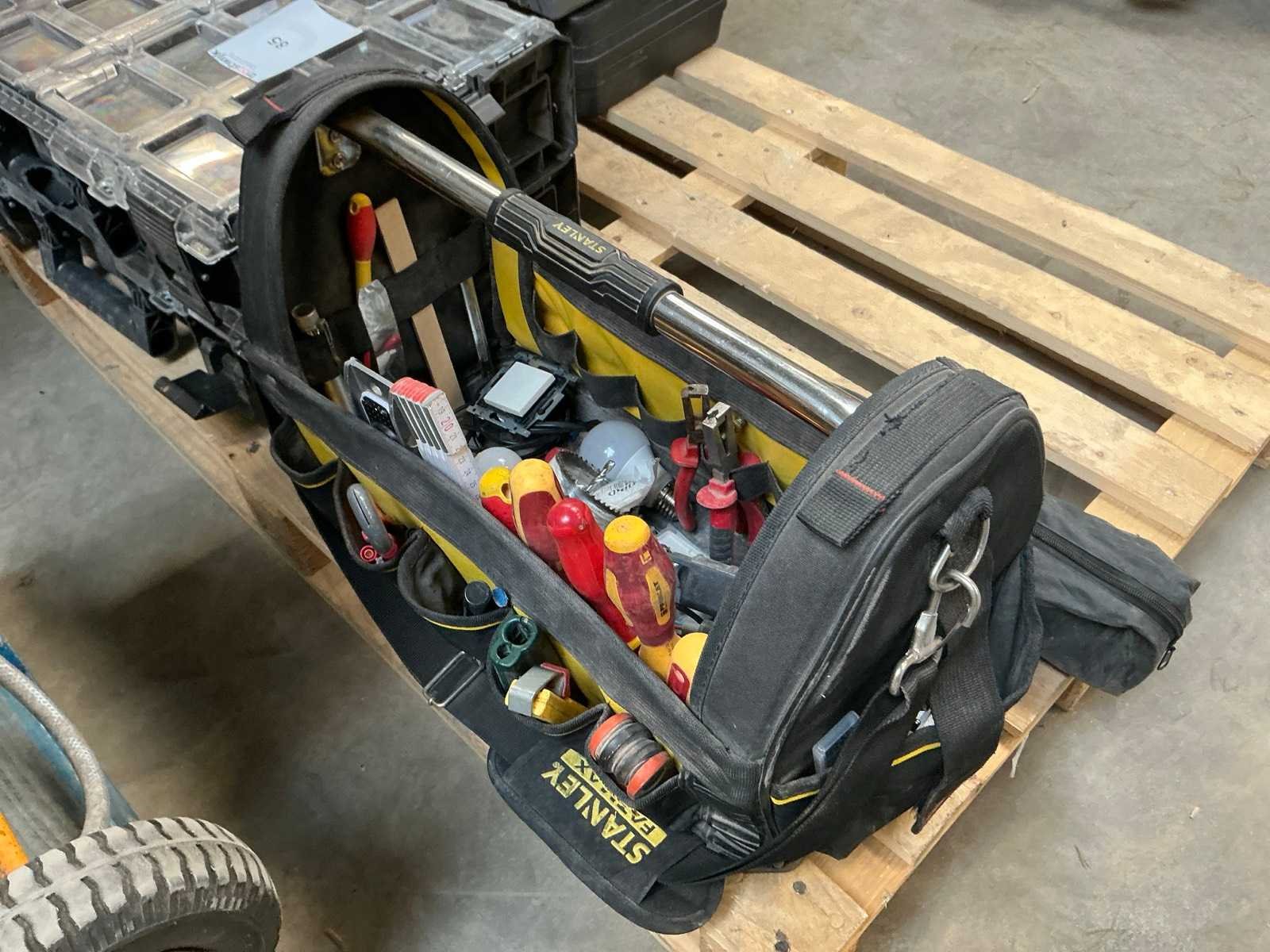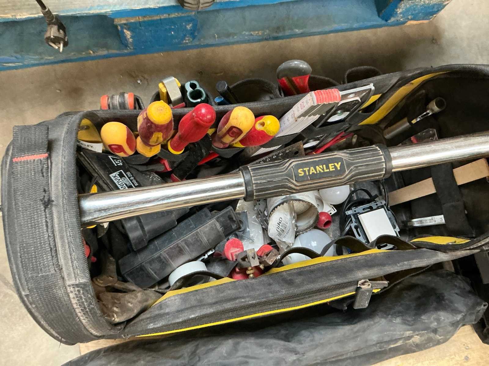 Zijnde: - 2 materiaalkoffers met koperen buiskoppelingstukken - Stanley gereedschapskoffer met diverse handgereedschappen - driepootstatief