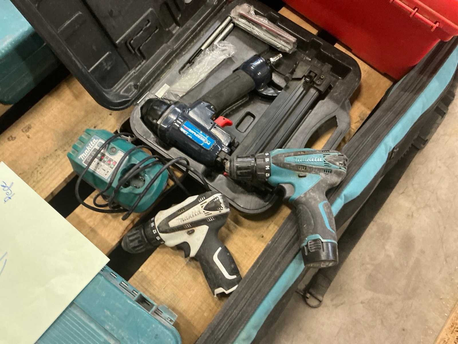 Zijnde: - Powerplus pneumatische tacker, in koffer - 2x Makita DF330D accu-schroefmachine, in totaal met 1 accu en lader