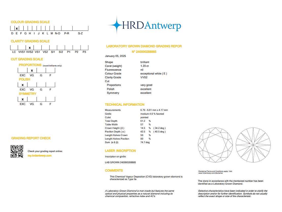 De kwaliteit is overgenomen uit het bijhorende certificaat. De ringmaat wordt naar wens aangepast, hiervoor wordt contact opgenomen na betaling. Within 7 days Voornaamste diamant: Lagrown diamant (CVD) Kleur diamant: E Gewicht diamant: 1.20ct Slijpvorm diamant: rond Zuiverheidsgraad diamant: VVS2 Certificaat: 240000288885 Materiaal: 18 karaat goud Leveringsvoorwaarden: Per koerier