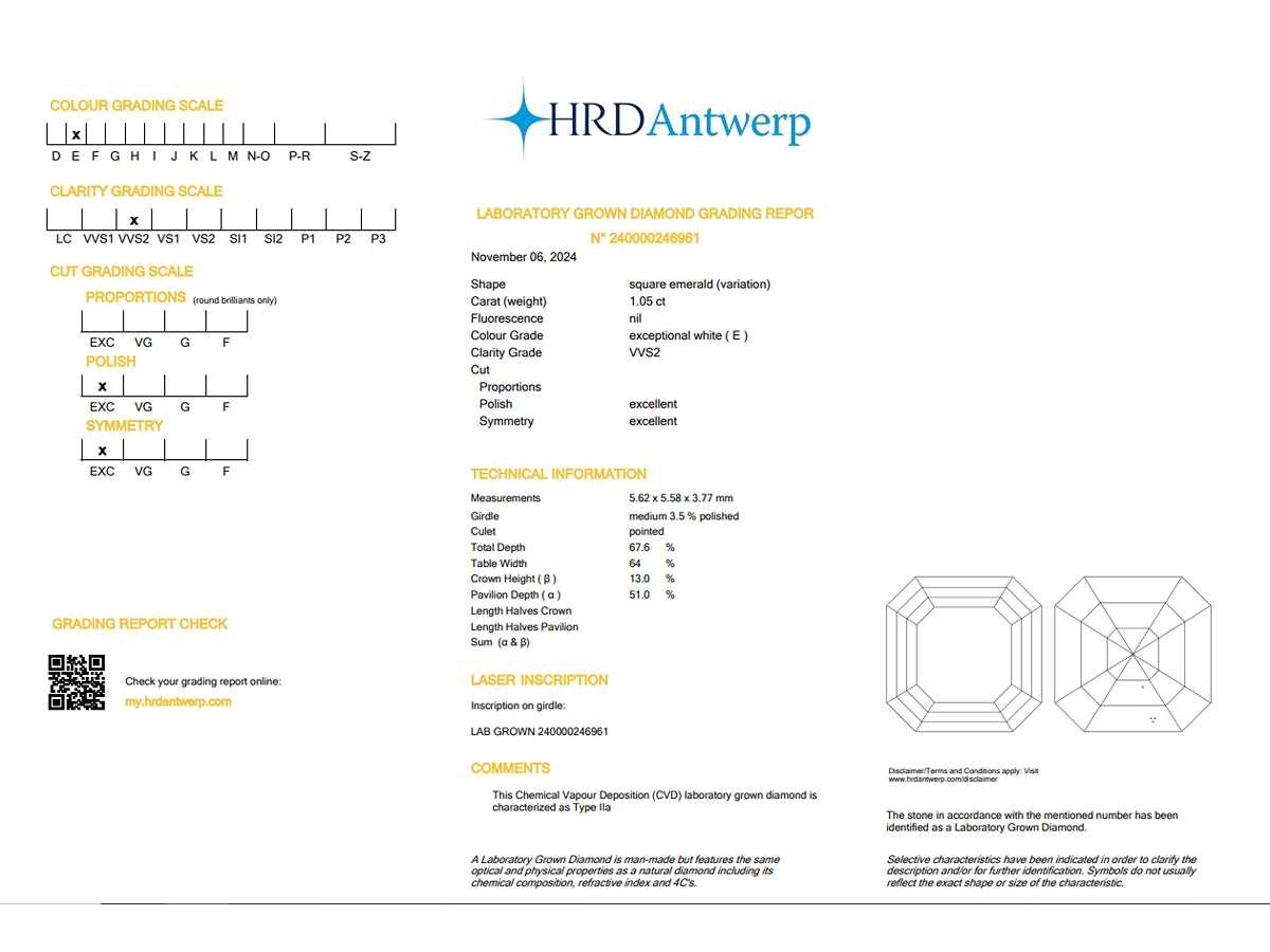 Alle diamanten hebben een gegraveerde laser-inscriptie. De kwaliteit is overgenomen uit het bijhorende certificaat. Within 3 days Datering: 06-11-2024 Karaat: 1.05 Certificaat: 240000246961 - HRD Voornaamste diamant: Labgrown Diamant (CVD) Kleur diamant: E Slijpvorm diamant: Square Emerald Slijpkwaliteit diamant: Emerald Zuiverheidsgraad diamant: VVS2 Leveringsvoorwaarden: Per koerier