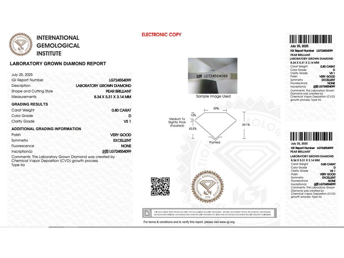 Alle diamanten hebben een gegraveerde laser-inscriptie. De kwaliteit is overgenomen uit het bijhorende certificaat. Within 3 days Datering: 25-07-2025 Karaat: 0.80 Certificaat: LG724554099 - IGI Voornaamste diamant: Labgrown Diamant (CVD) Kleur diamant: D Slijpvorm diamant: Pear Slijpkwaliteit diamant: Very Good Zuiverheidsgraad diamant: VS1 Leveringsvoorwaarden: Per koerier