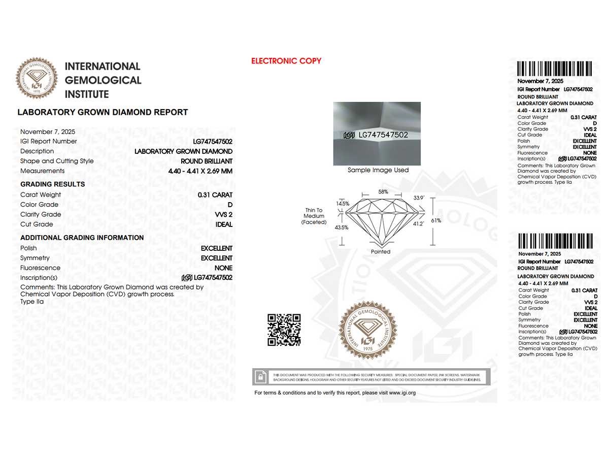 Alle diamanten hebben een gegraveerde laser-inscriptie. De kwaliteit is overgenomen uit het bijhorende certificaat. Within 3 days Datering: 07-11-2025 Karaat: 0.31 Certificaat: LG747547502 IGI Voornaamste diamant: Labgrown Diamant (CVD) Kleur diamant: D Slijpvorm diamant: Round Slijpkwaliteit diamant: Ideal Zuiverheidsgraad diamant: VVS2 Leveringsvoorwaarden: Per koerier
