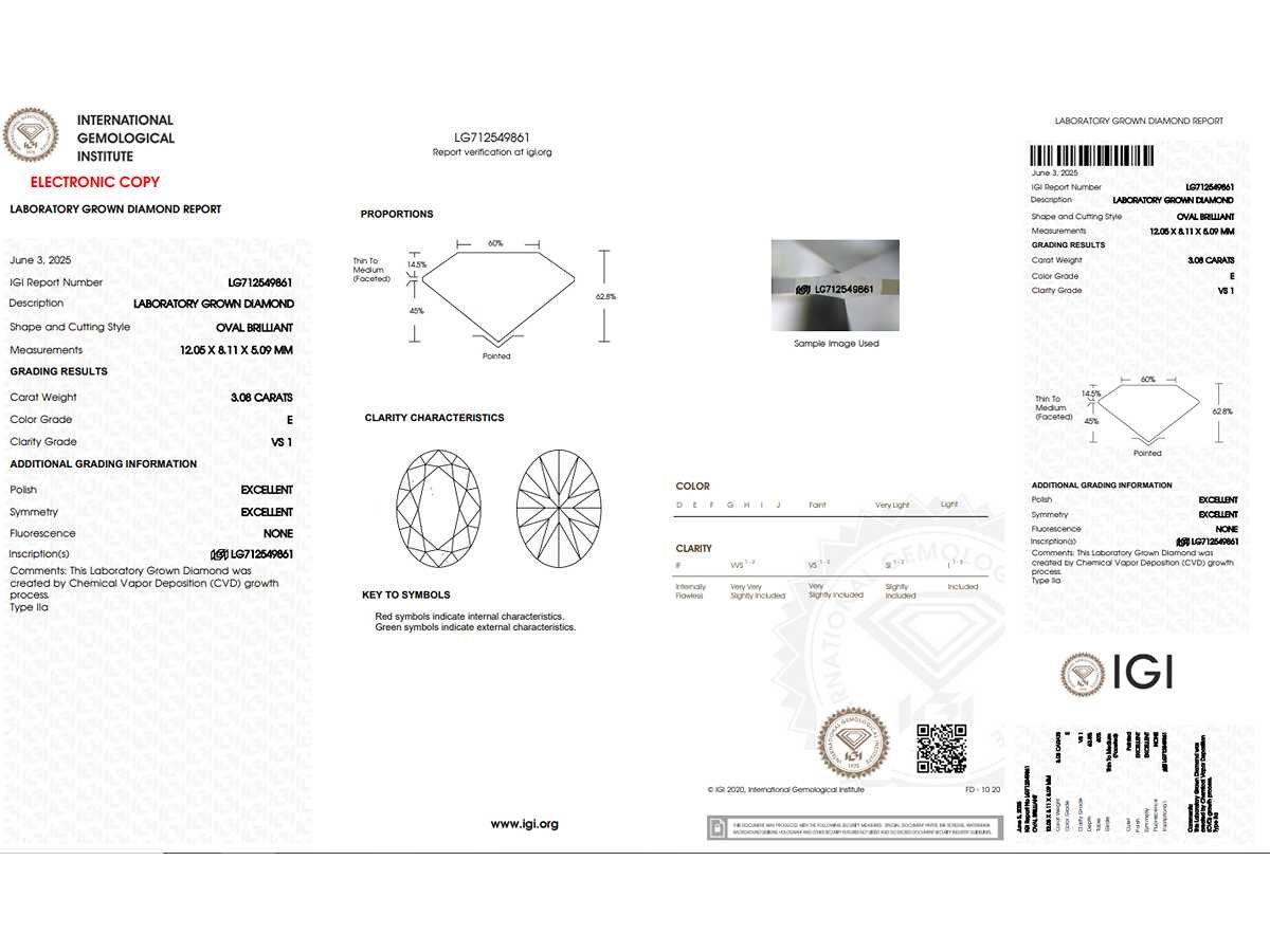 Alle diamanten hebben een gegraveerde laser-inscriptie. De kwaliteit is overgenomen uit het bijhorende certificaat. Within 3 days Datering: 03-06-2025 Karaat: 3.08 Certificaat: LG712549861 - IGI Voornaamste diamant: Labgrown Diamant (CVD) Kleur diamant: E Slijpvorm diamant: Ovaal Slijpkwaliteit diamant: Excellent Zuiverheidsgraad diamant: VS1 Leveringsvoorwaarden: Per koerier