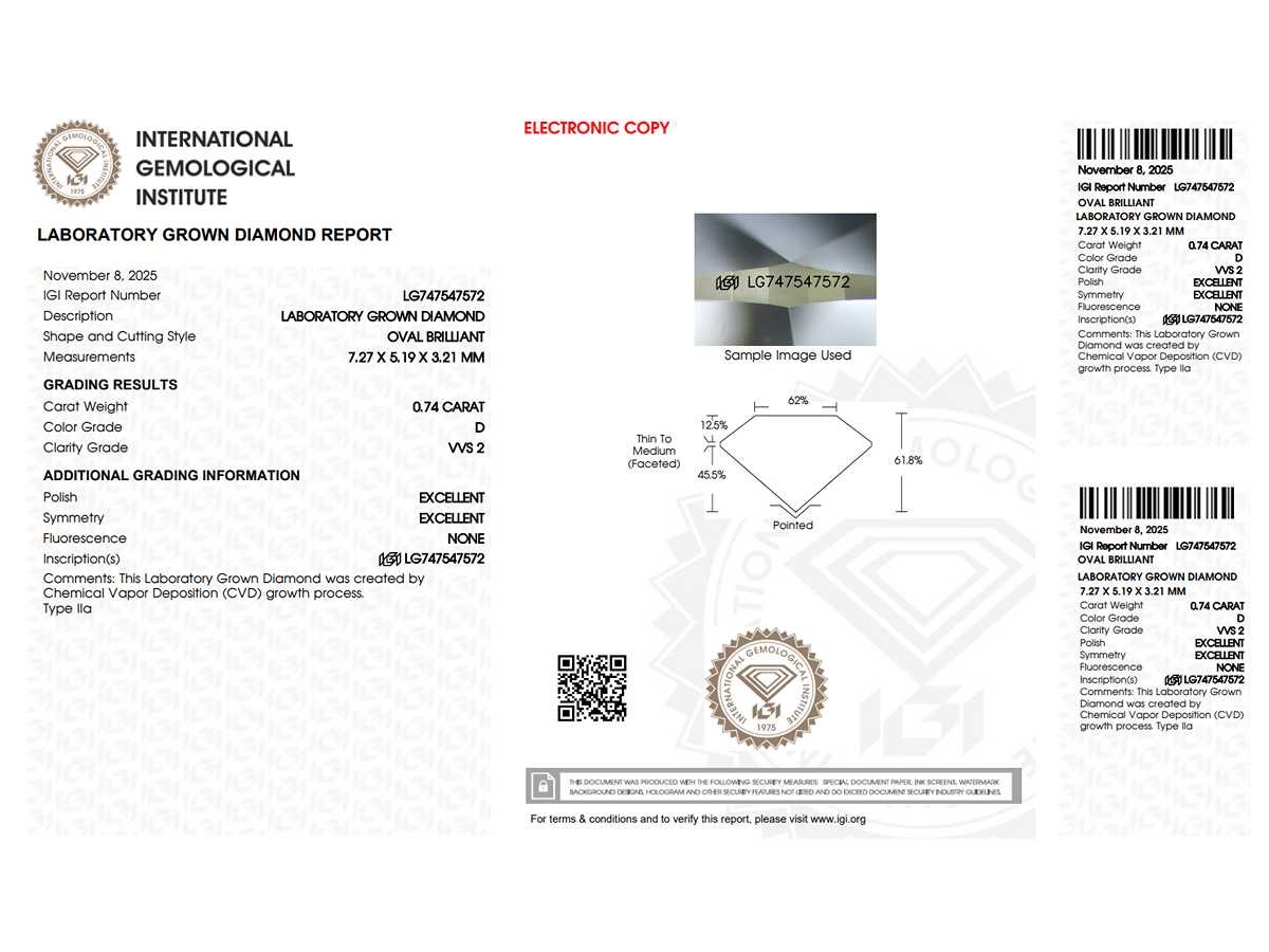 Alle diamanten hebben een gegraveerde laser-inscriptie. De kwaliteit is overgenomen uit het bijhorende certificaat. Within 3 days Datering: 08-11-2025 Karaat: 0.74 Certificaat: LG747547572 - IGI Voornaamste diamant: Labgrown Diamant (CVD) Kleur diamant: D Slijpvorm diamant: Ovaal Slijpkwaliteit diamant: Excellent Zuiverheidsgraad diamant: VVS2 Leveringsvoorwaarden: Per koerier