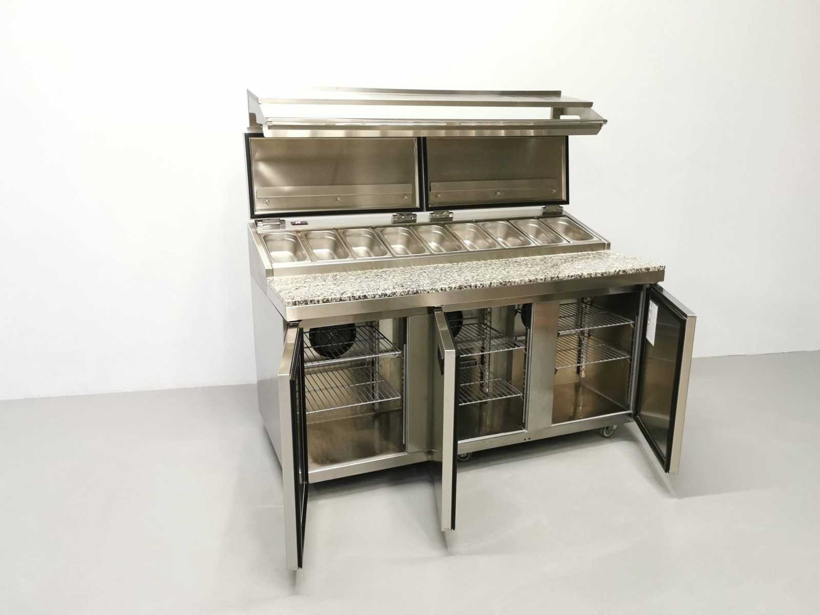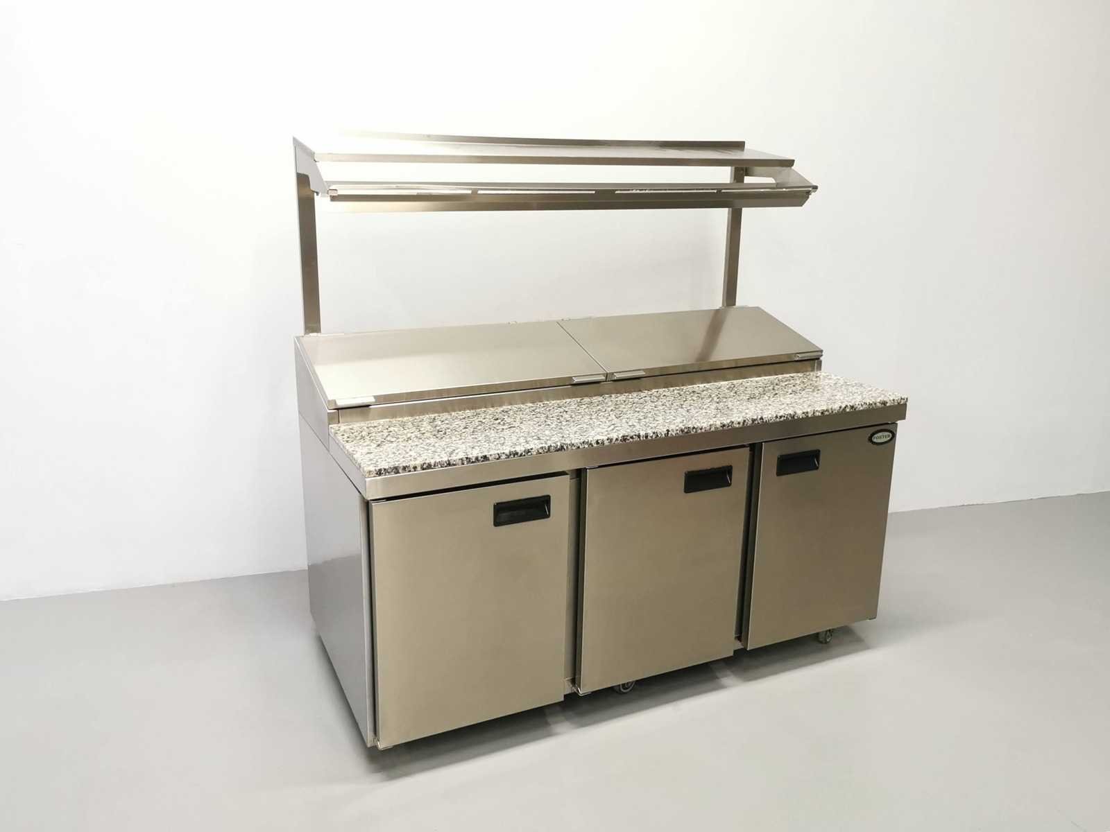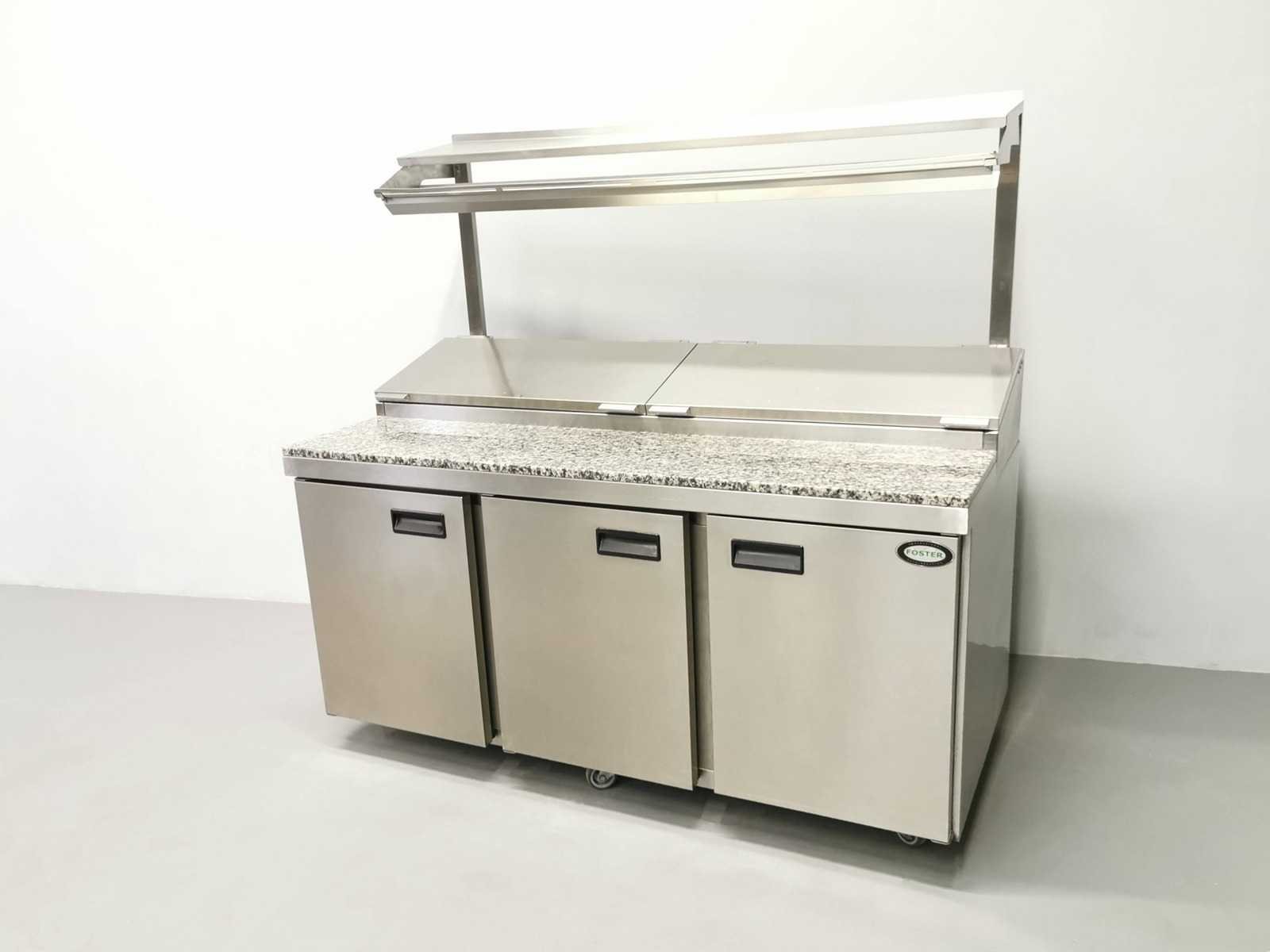 Uitgerust met roestvrijstalen schalen, een marmeren aanrechtblad, bovenste plank en bovenste opbergruimte Merk: Foster Type: FPS3GR Totale afmeting L: 173cm Totale afmeting Breedte: 85cm Totale afmeting Hoogte: 165cm Digitale uitlezing: true Ingebouwde koelcompressor: true Rvs: true Aansluiting: 230V Mobiel: true