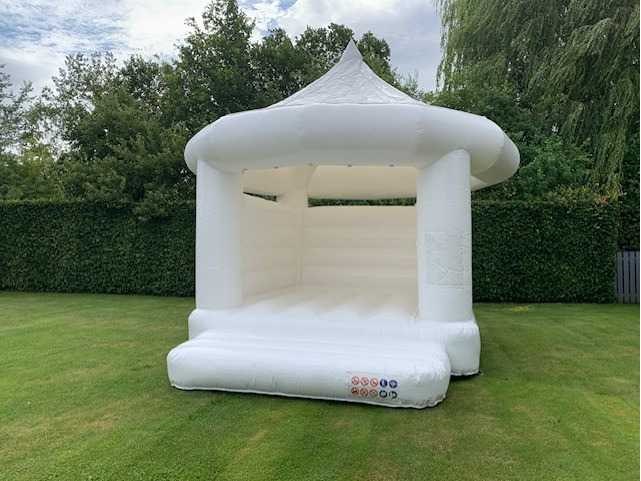 Mooi wit springkasteel, voor zowel een trouw, communie, .. Speciaal voor jouw klanten die op zoek zijn naar een unieke activiteit op hun bruiloft, is er het sprookjesachtige carrousel trouwkasteel. Dit springkasteel is de ideale en leuke manier om kinderen te vermaken tijdens een trouwfeest. Doordat het kussen volledig wit is, past het goed bij elk thema en iedere locatie. Dit springkasteel in carrousel vorm is een waar sprookje om op te springen en bezorgt jouw klanten de dag van hun leven. Iedereen zegt ‘ja’ tegen dit fantastische springkasteel! Incl 1 blower Merk: JB INFLATABLE Model: Springkasteel Gewicht: 110kg Lengte: 500cm Breedte: 500cm Hoogte: 490cm