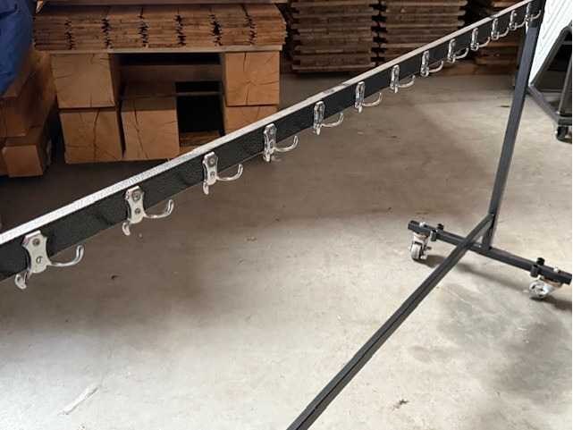 Vestiare rek voorzien van haakjes en leggers voor kapstokken. Combo van beide systemen zoals op de foto. 2 steunen met wieltjes 2 leggers met haakjes 3 leggers voor kledinghangers Lengte: 200 Materiaal: Metaal