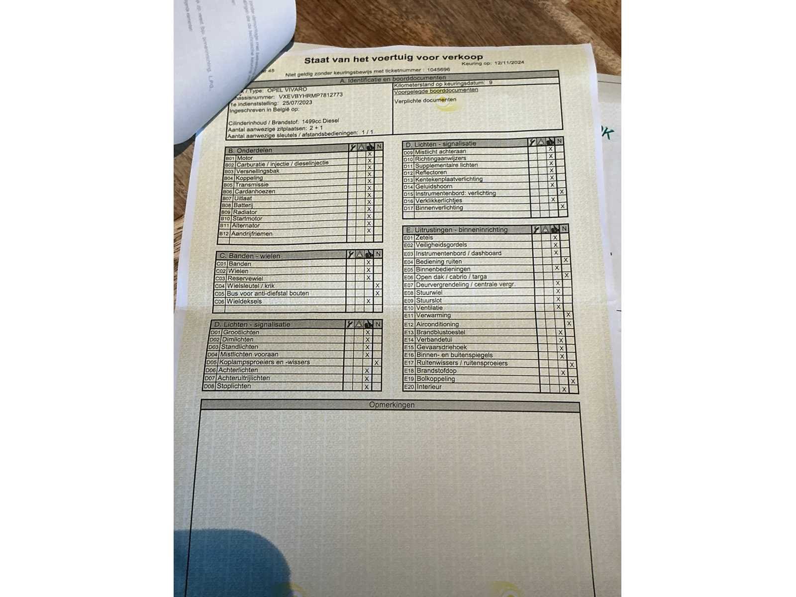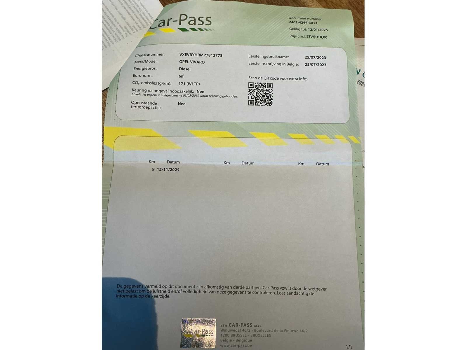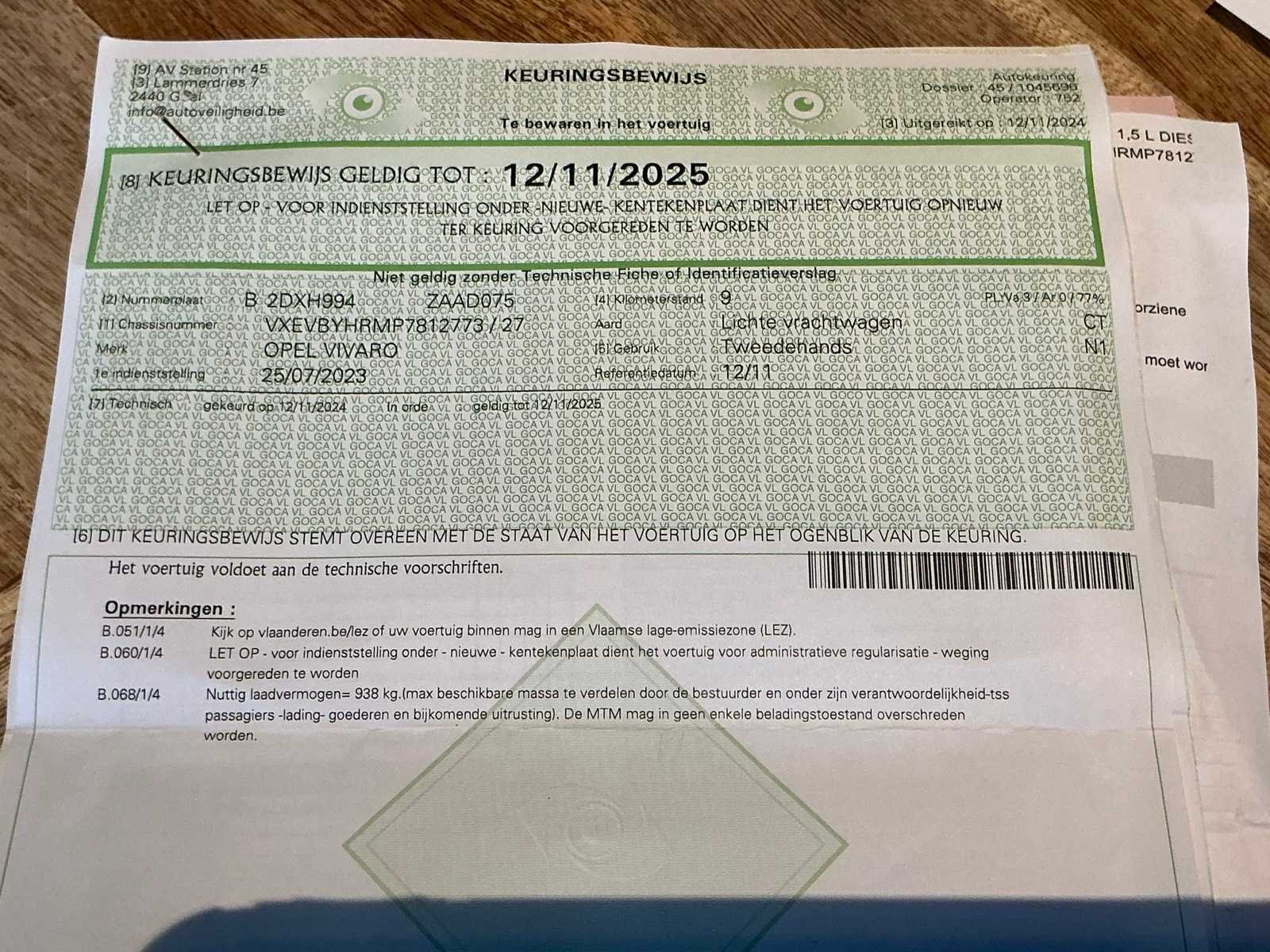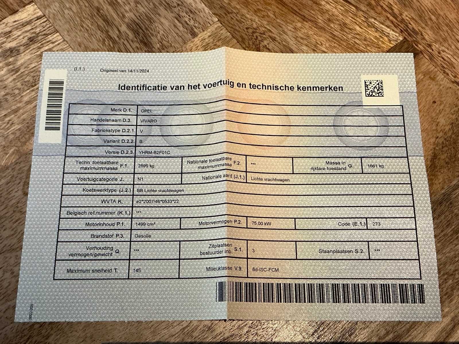 Voorzien van cruise control, achteruitrijcamera, parkeersensoren, airco, elektrische ruiten en spiegels, Aanwezige boorddocumenten: inschrijvingsbewijs deel 1, gelijkvormigheidsattest, keuringsbewijs geldig tot 12/11/2025 en carpass Kenteken: 2-GEJ-232 Merk: Opel Type: Vivaro Model: BB Bouwjaar: 2023 Chassisnummer: VXEVBYHRMP7812773 Afgelezen kilometerstand: 27028km Cilinderinhoud: 1499cc Vermogen (kW): 75kW Brandstof: diesel Datum eerste toelating: 25/07/2023 Transmissie: Manueel Aantal zitplaatsen: 3 Kleur: Wit Nationaliteit documenten: Belgisch Aantal sleutels: 2 Emissieklasse: 6d Boorddocumenten aanwezig?: true Startinformatie: Start en rijdt