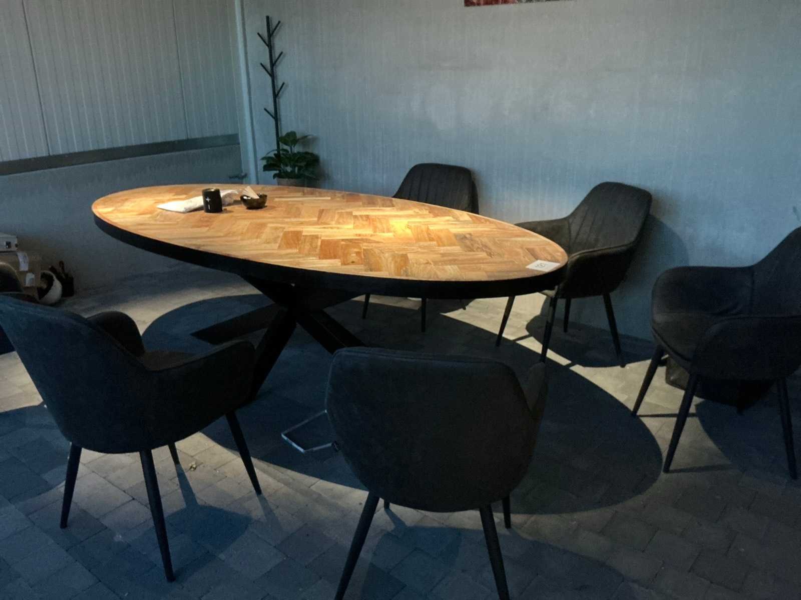 Waaronder bestaande uit 1 houten vergadertafel 260 x 120cm, 6 metalen design bijzetstoelen Colenis voorzien van stoffen bekleding, 1 bijzetrekje met staande kapstok en 1 kunstlederen 2-persoons zitbank, Uitgezonderd eigendomsvoorbehoud, Afgifte volgens aanwijzing