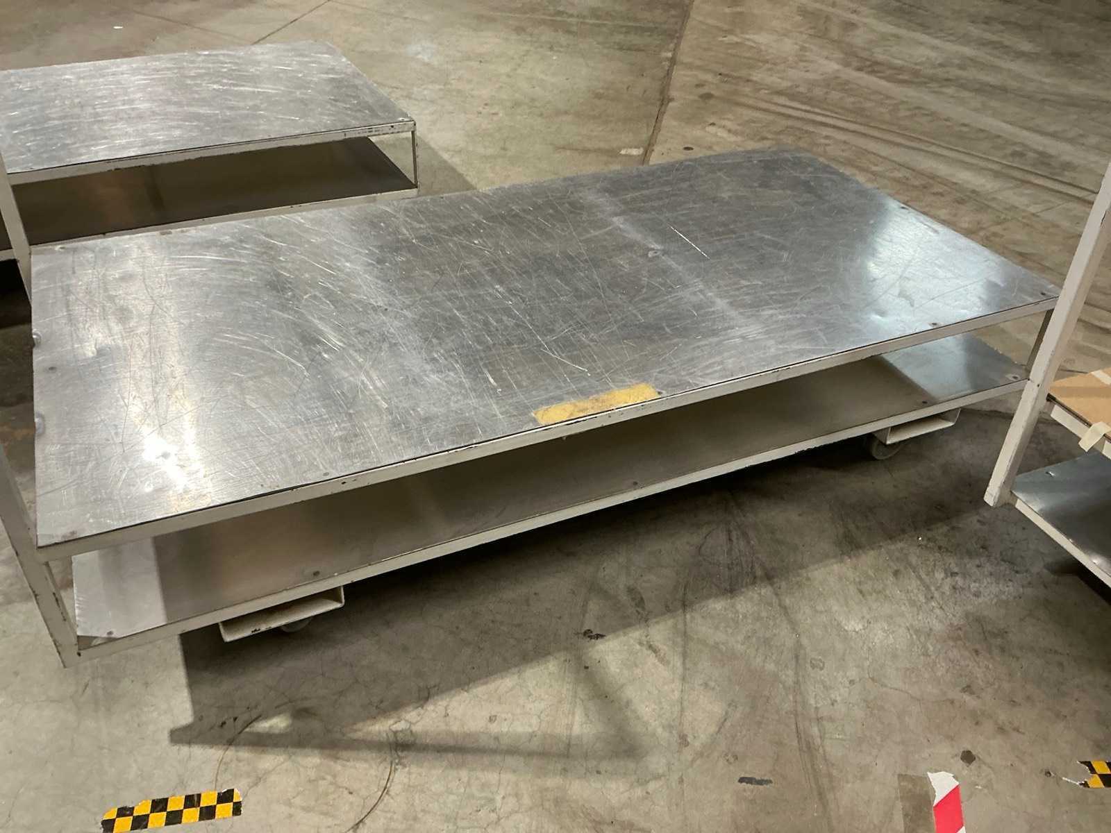 Plateauhoogte = 21 en 42cm; voorzien van 2 vaste wielen en 2 zwenkwielen met rem; uit metaal Totale afmeting L: 2030mm Totale afmeting Breedte: 1000mm Totale afmeting Hoogte: 1070mm