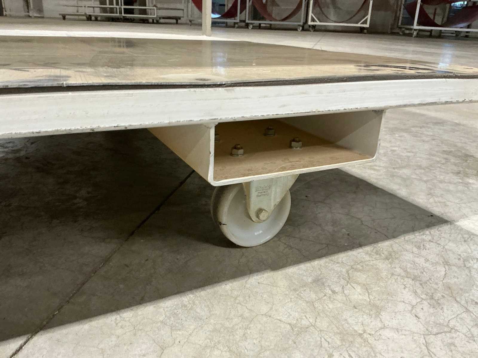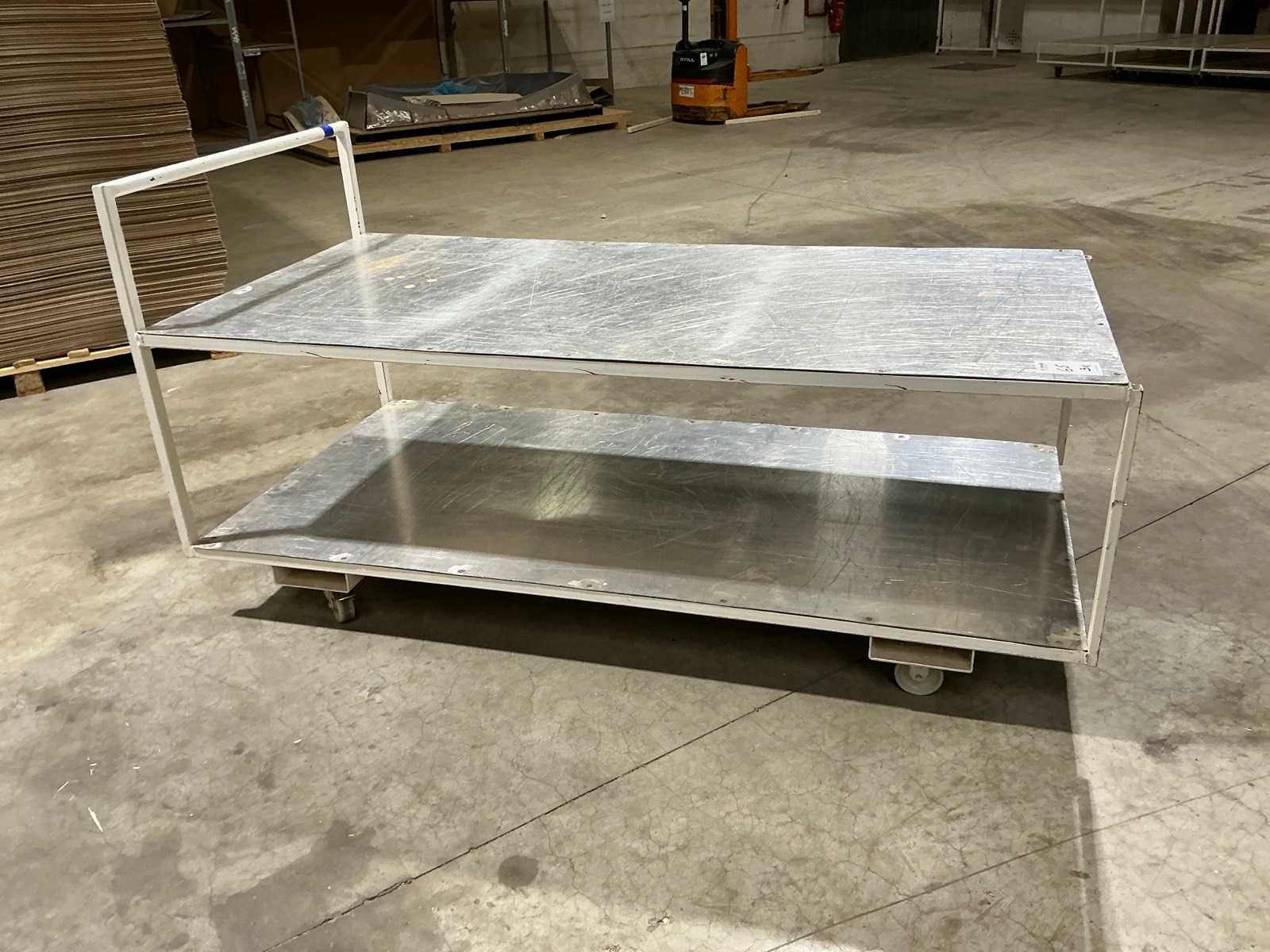 Plateauhoogte = 21 en 74cm; voorzien van 2 vaste wielen en 2 zwenkwielen met rem; uit metaal Totale afmeting L: 2060mm Totale afmeting Breedte: 1000mm Totale afmeting Hoogte: 1070mm