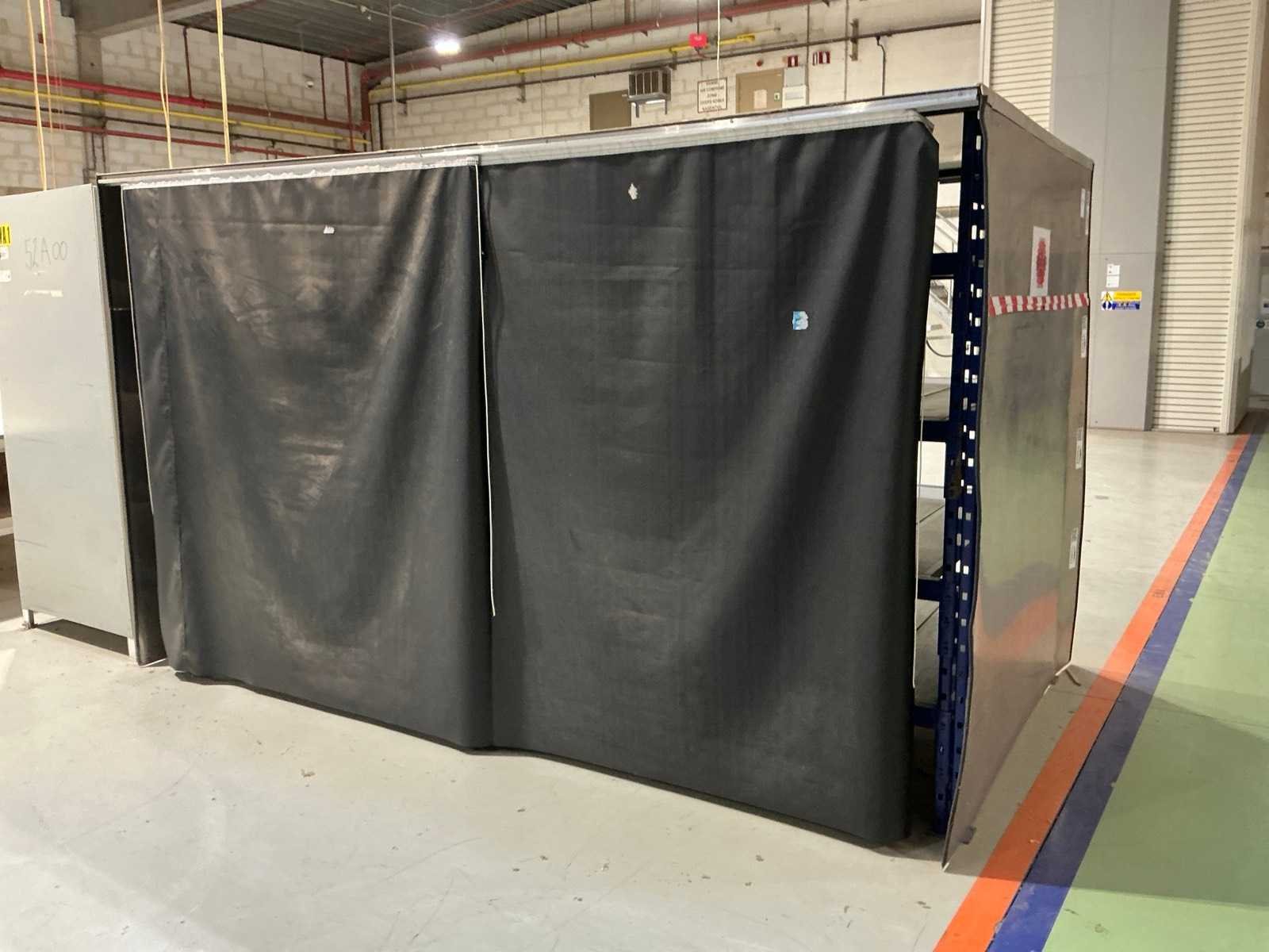Voorzien van opbouw rondom; 1x schuifgordijn aan voor- en achterzijde en 1x schuifgordijn voorzijde Aantal secties: 1 Sectie afm. b: 3200mm Sectie diepte: 1500mm Sectie afm. h: 2050mm Aantal staanders: 2 Aantal liggers: 8 Aantal legborden: 4 Demontabel: true Materiaal: Staal