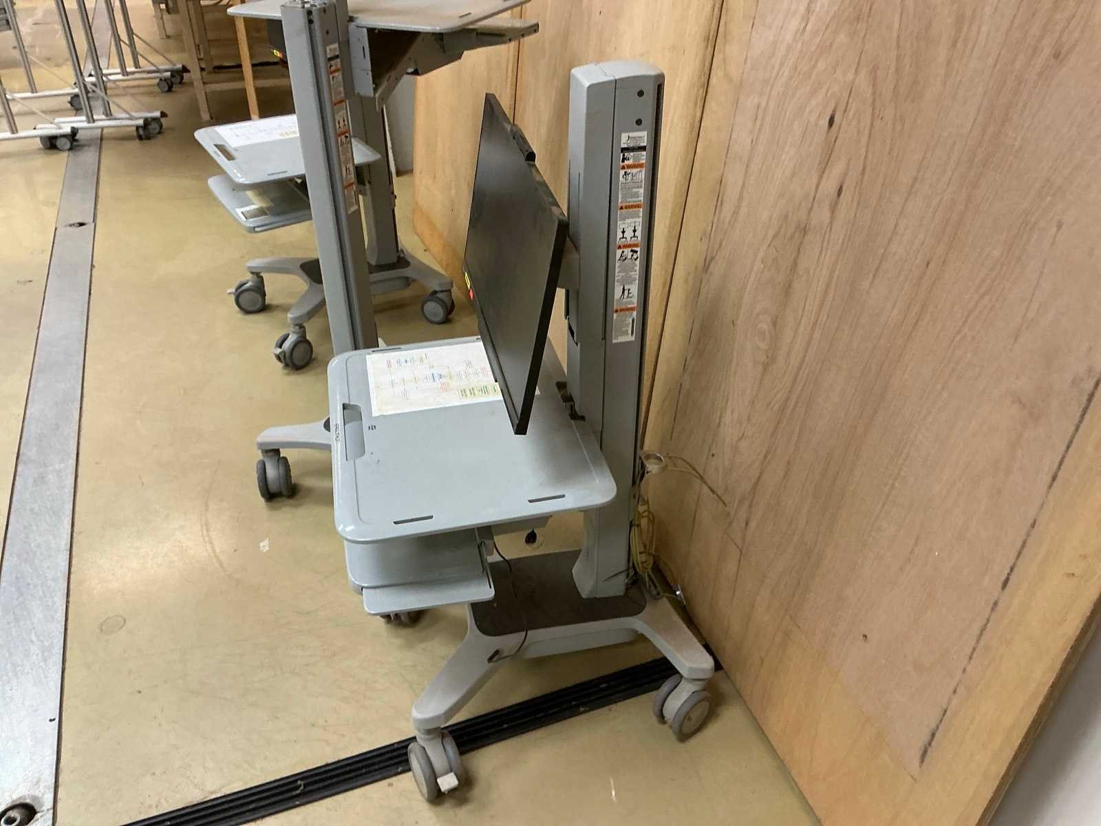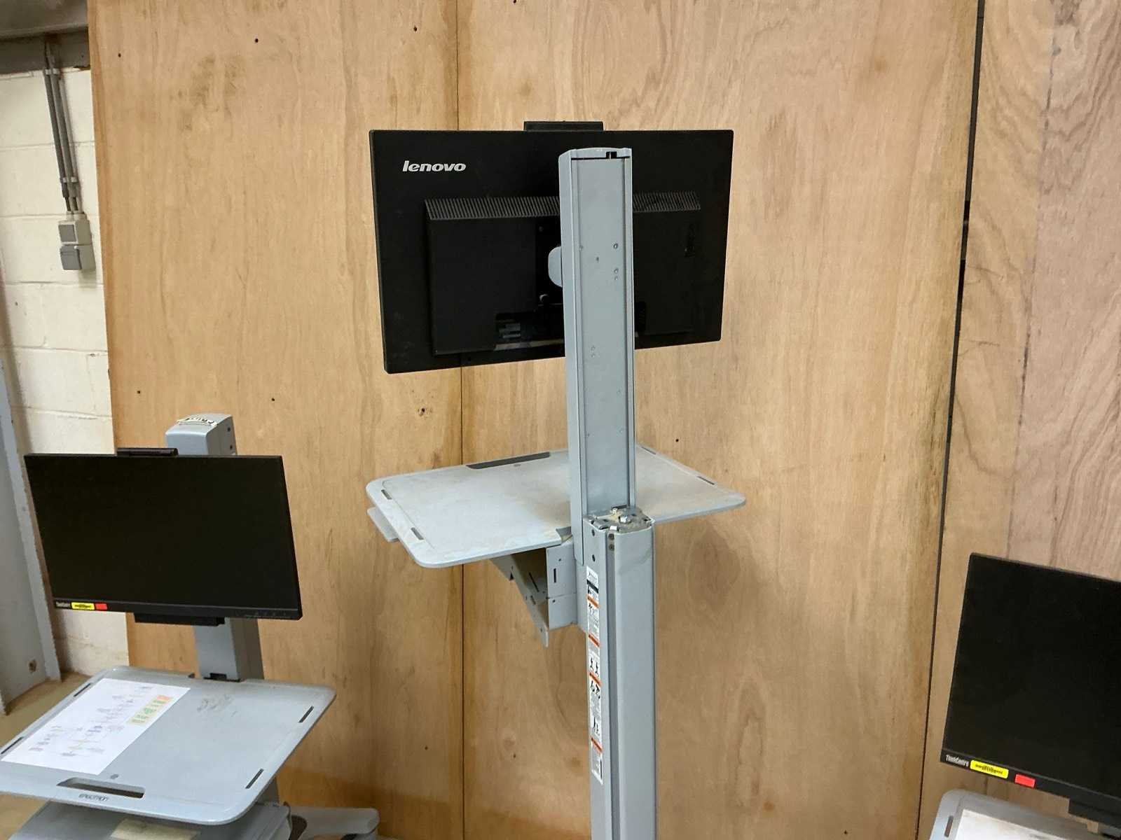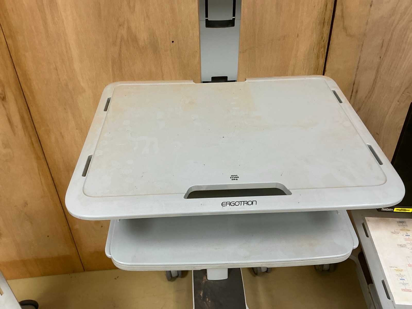 Verstelbaar in hoogte van 65 tot 115cm werkbladhoogte; toestenbord is schuifbaar en voorzien Lenovo Thinkvision scherm T2424zA; voorzien van 4 zwenkwielen waarvan 2 met rem Merk: ERGOTRON Kleur: Grijs Lengte: 56cm Breedte: 65cm Hoogte: 120cm