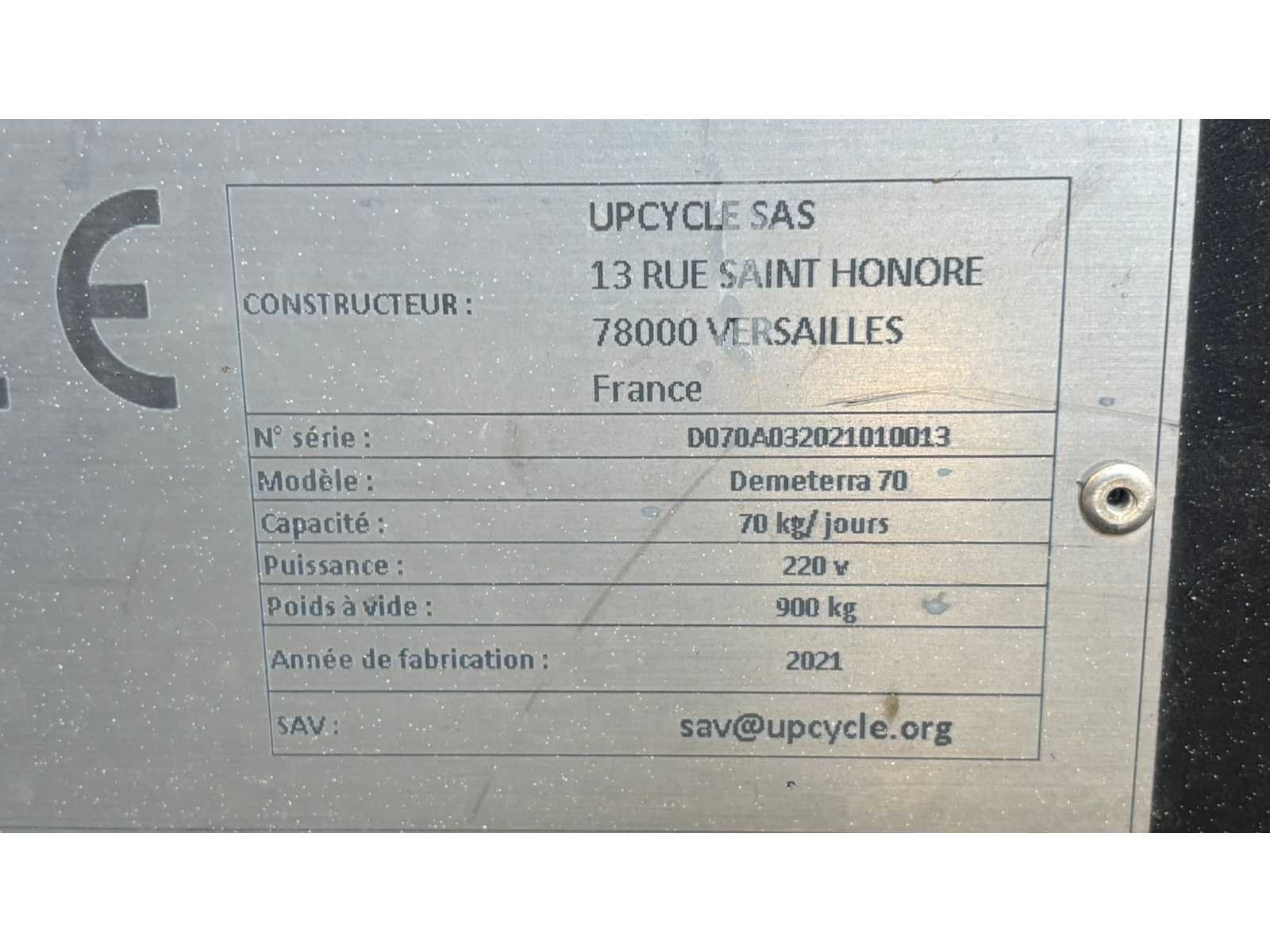 Capaciteit 70 kg/dag, 220 V Merk: Upcycle Gewicht: 900kg Type: Demetterra 70 Bouwjaar: 2021 Serienummer: D070A032021010013 Totale afmeting L: 3900mm Totale afmeting Breedte: 1250mm Totale afmeting Hoogte: 1670mm
