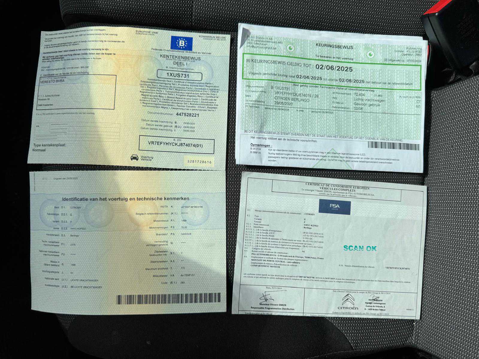Merk: Citroën Type: Berlingo Chassisnummer: VR7EFYHYCKJ874074 Afgelezen kilometerstand: 93241km Cilinderinhoud: 1499cc Vermogen (kW): 75kW Brandstof: diesel Datum eerste inschrijving: 29/05/2020 Transmissie: Handgeschakeld Aantal zitplaatsen: 2 Aantal sleutels: 1 Laadvermogen: 650kg Emissieklasse: Euro6 Kentekenpapieren compleet?: true Boorddocumenten aanwezig?: true