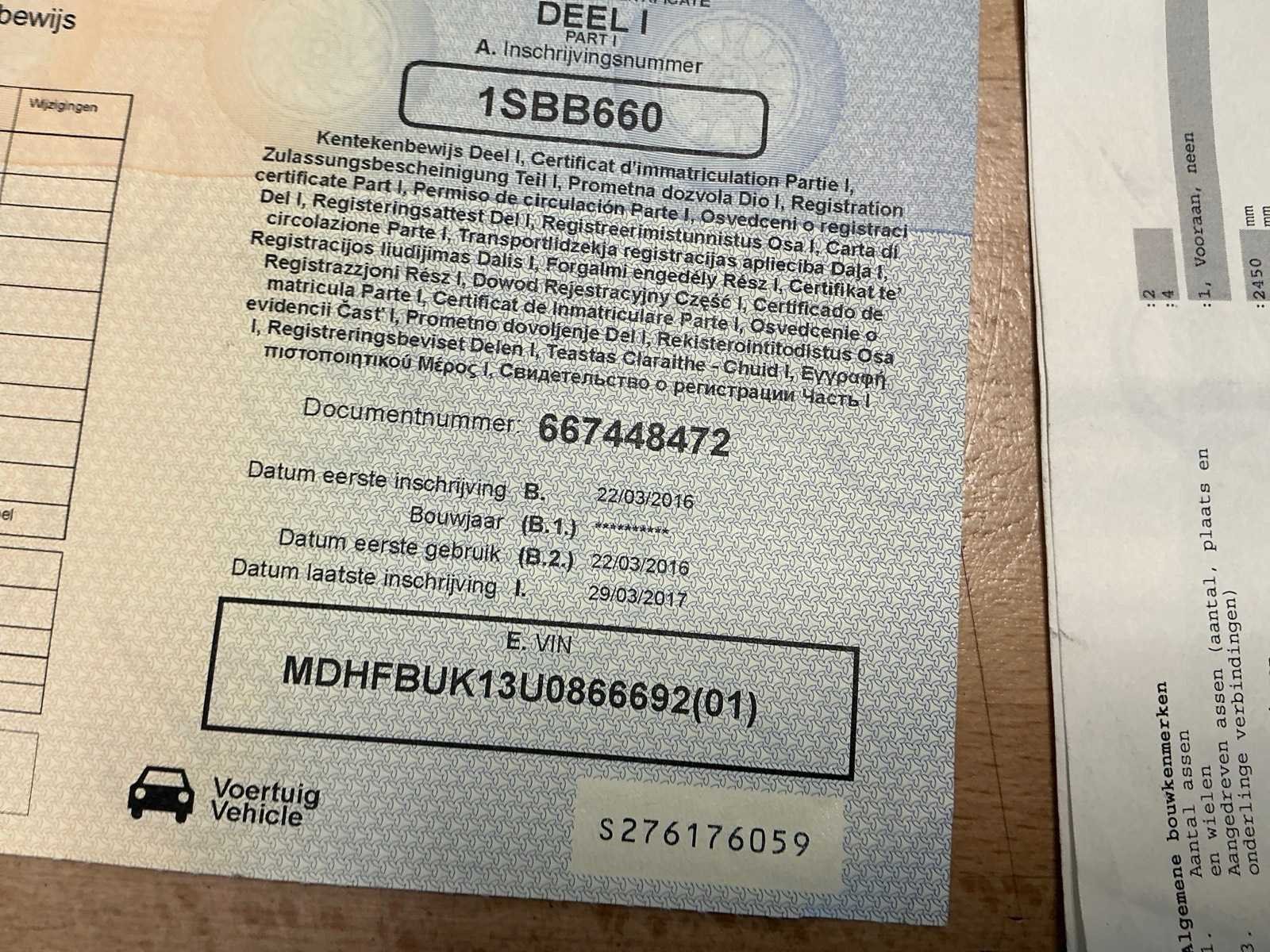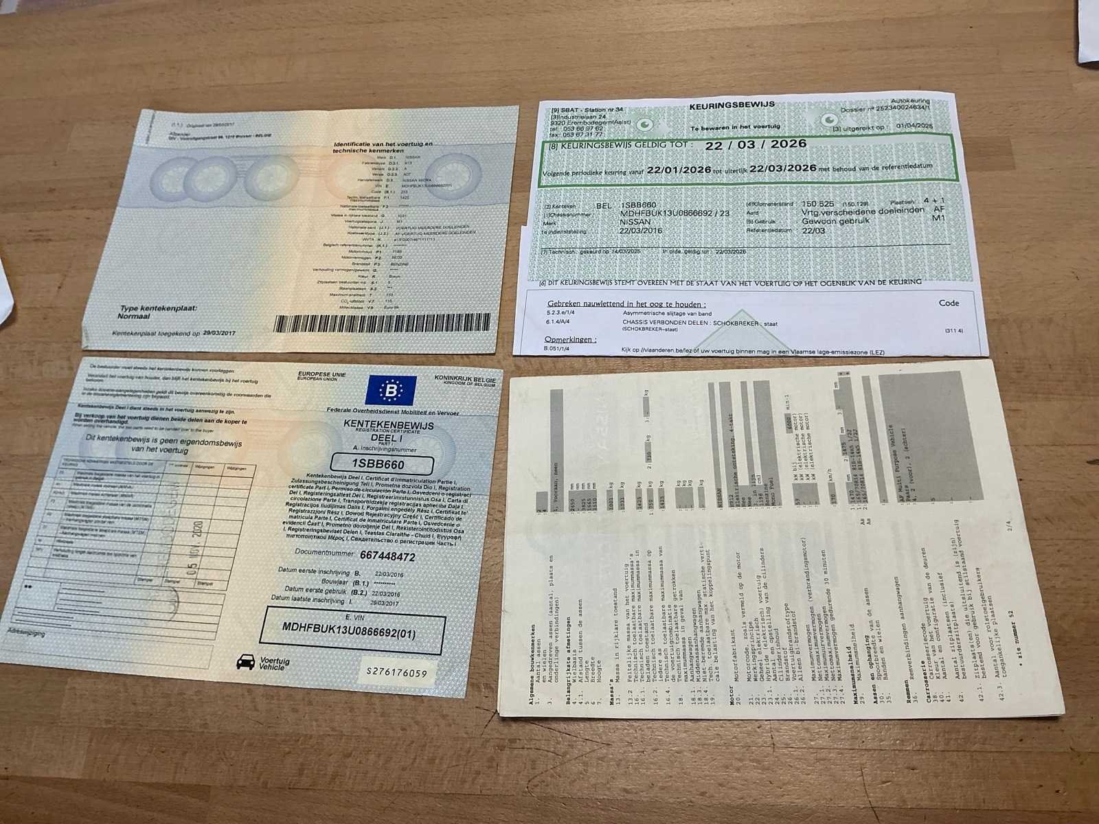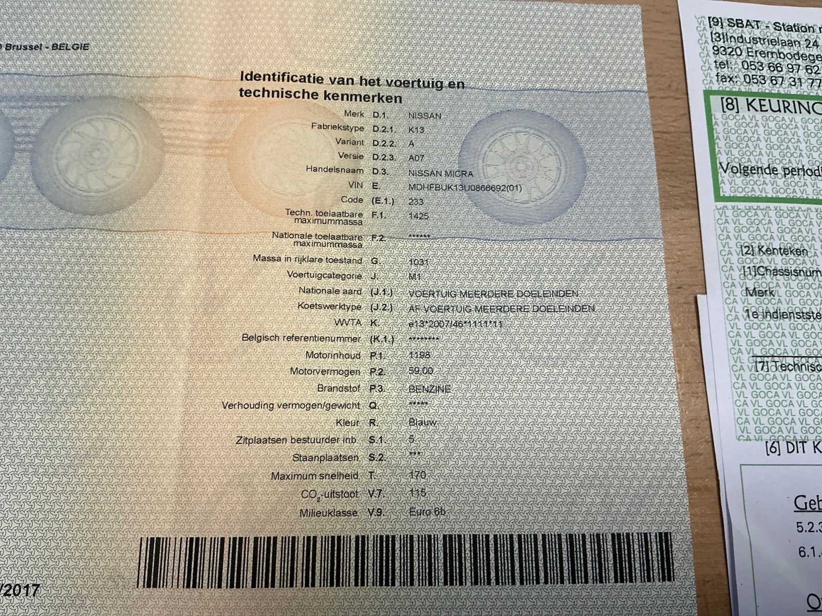 Kenteken: 1SBB660 Merk: Nissan Type: Micra Afgelezen kilometerstand: 158533km Cilinderinhoud: 1198cc Vermogen (kW): 59kW Brandstof: benzine Chassisnummer: MDHFBUK13U0866692 Datum eerste toelating: 22/03/2016 Aantal zitplaatsen: 5 Transmissie: Handgeschakeld Emissieklasse: Euro6b Aantal deuren: 4 Aantal sleutels: 1 Nationaliteit documenten: Belgisch Gelijkvormigheidsattest aanwezig: true Inschrijvingsbewijs - deel 1 : Aanwezig Inschrijvingsbewijs - deel 2: Aanwezig