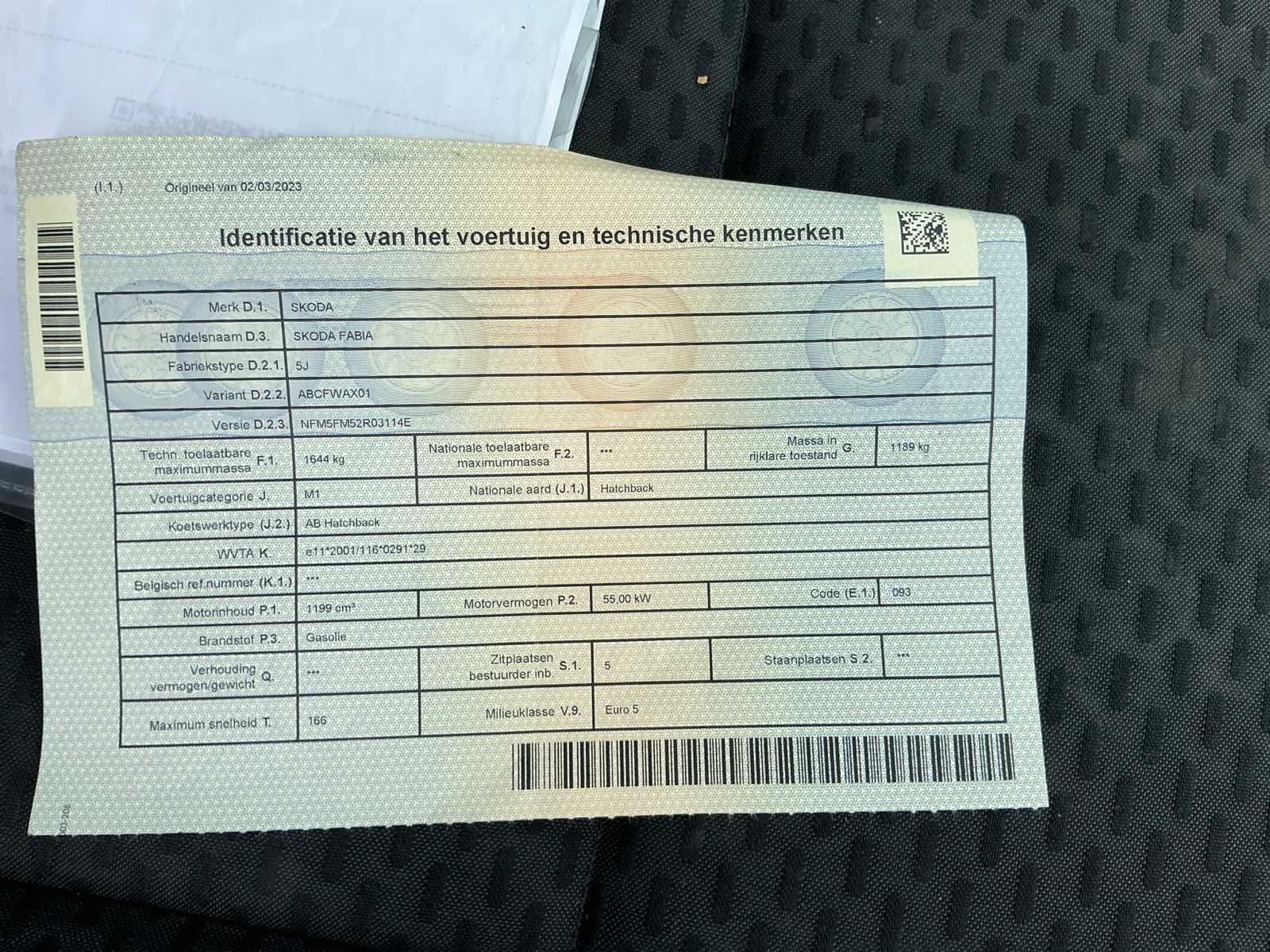 Kilometerstand niet gekend, bevat carroserieschade, Geen sleutel, inschrijvingsbewijs deel 1 aanwezig, deel 2 ontbreekt, gelijkvormigheidsattest niet aanwezig ( 2DFL834) Merk: Skoda Type: Fabia Cilinderinhoud: 1199cc Vermogen (kW): 55kW Brandstof: diesel Chassisnummer: TMBEK25J7B3135040 Datum eerste toelating: 21/03/2011 Aantal zitplaatsen: 5 Transmissie: Handgeschakeld Emissieklasse: Euro5 Nationaliteit documenten: Belgisch