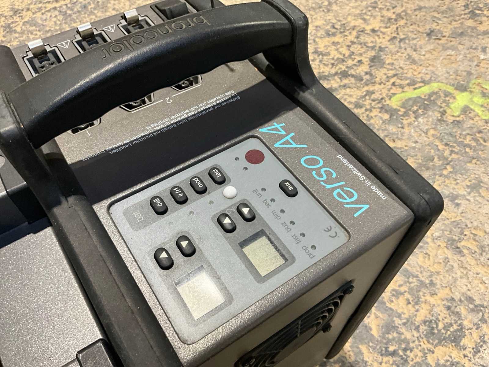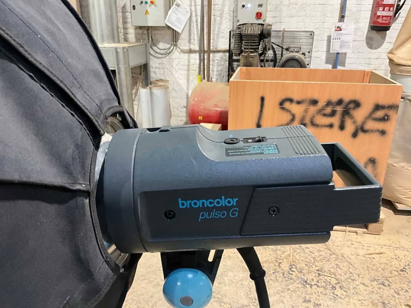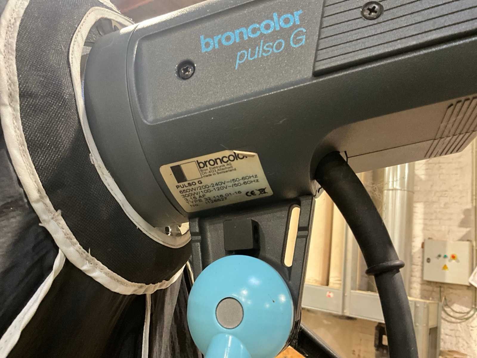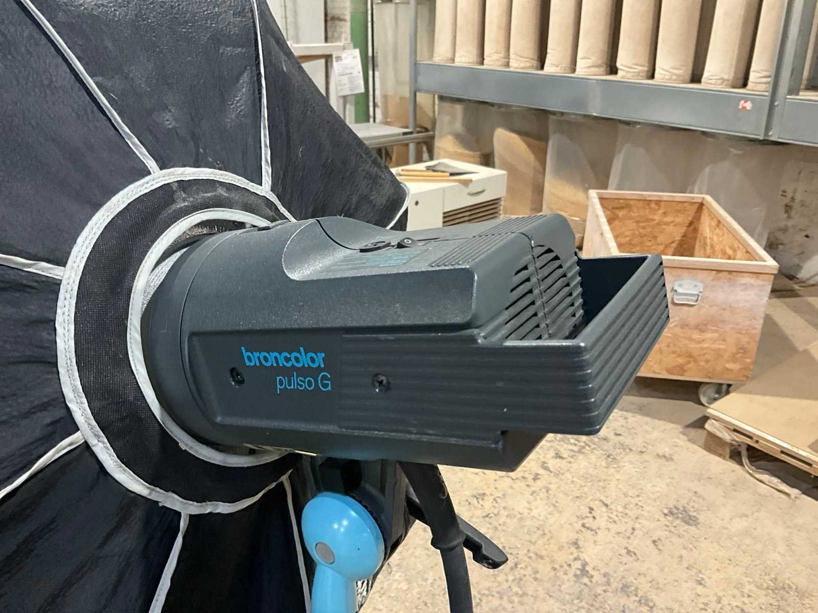 Bestaande uit generator verso A4, power Dock, 3x spotlight BRONCOLOR PULSO G, 5 diverse koepels waaronder octabox 75, Rotalux, verlengkabel, en verrijdbare trolley met accessoires Merk: Broncolor