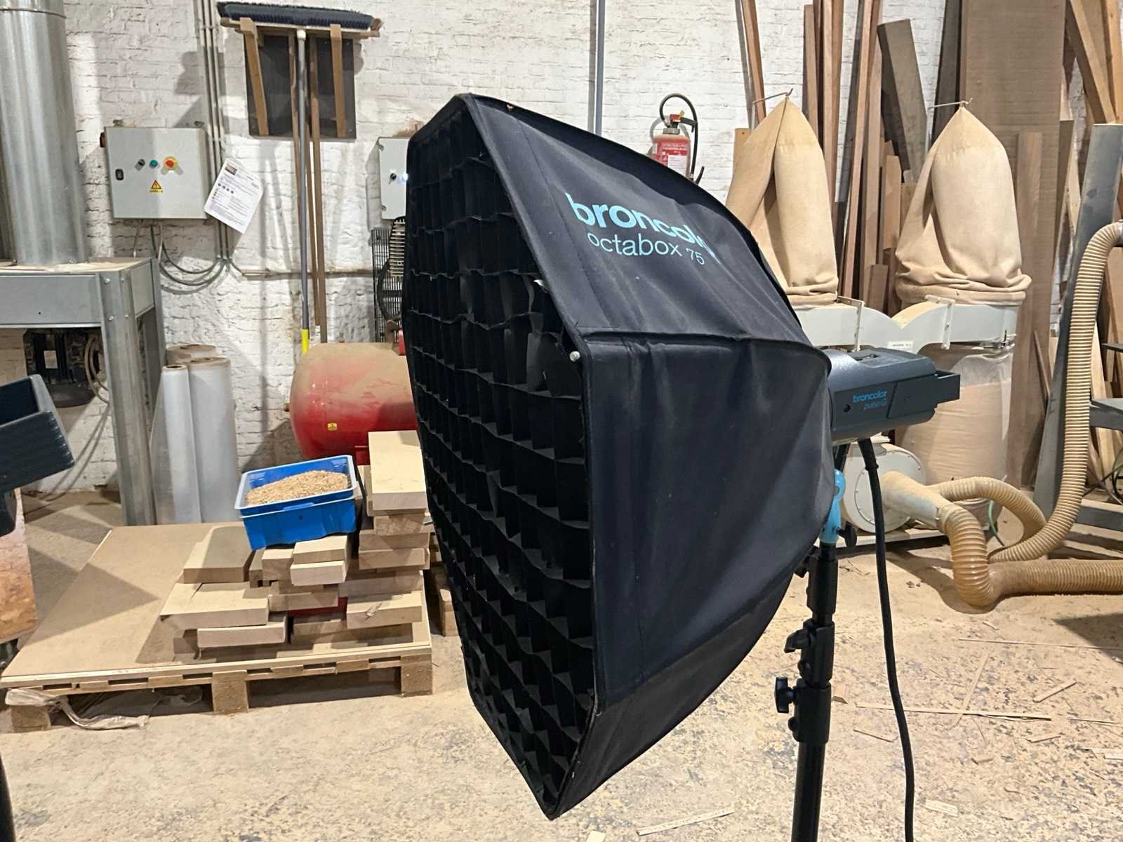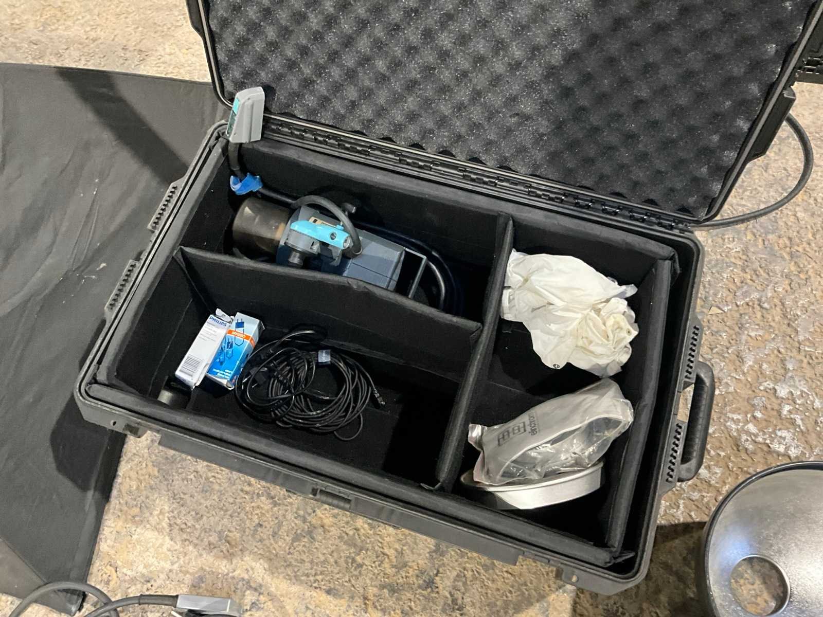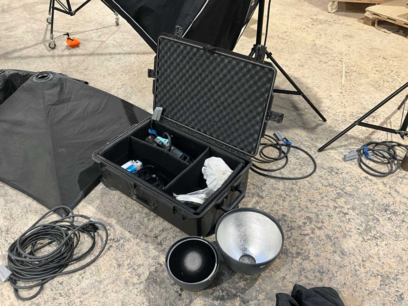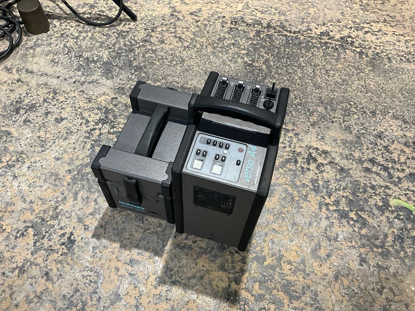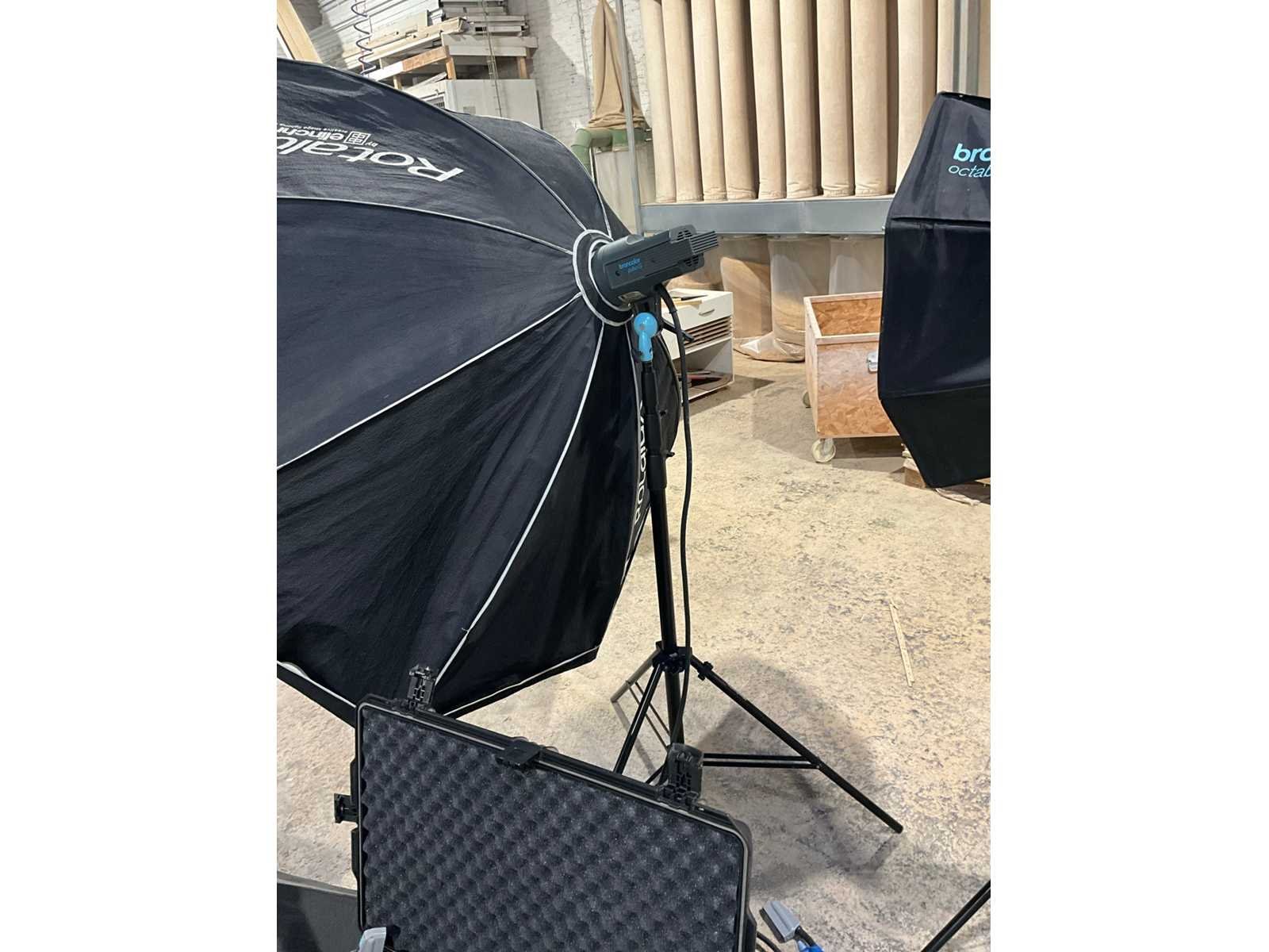 Bestaande uit generator verso A4, power Dock, 3x spotlight BRONCOLOR PULSO G, 5 diverse koepels waaronder octabox 75, Rotalux, verlengkabel, en verrijdbare trolley met accessoires Merk: Broncolor