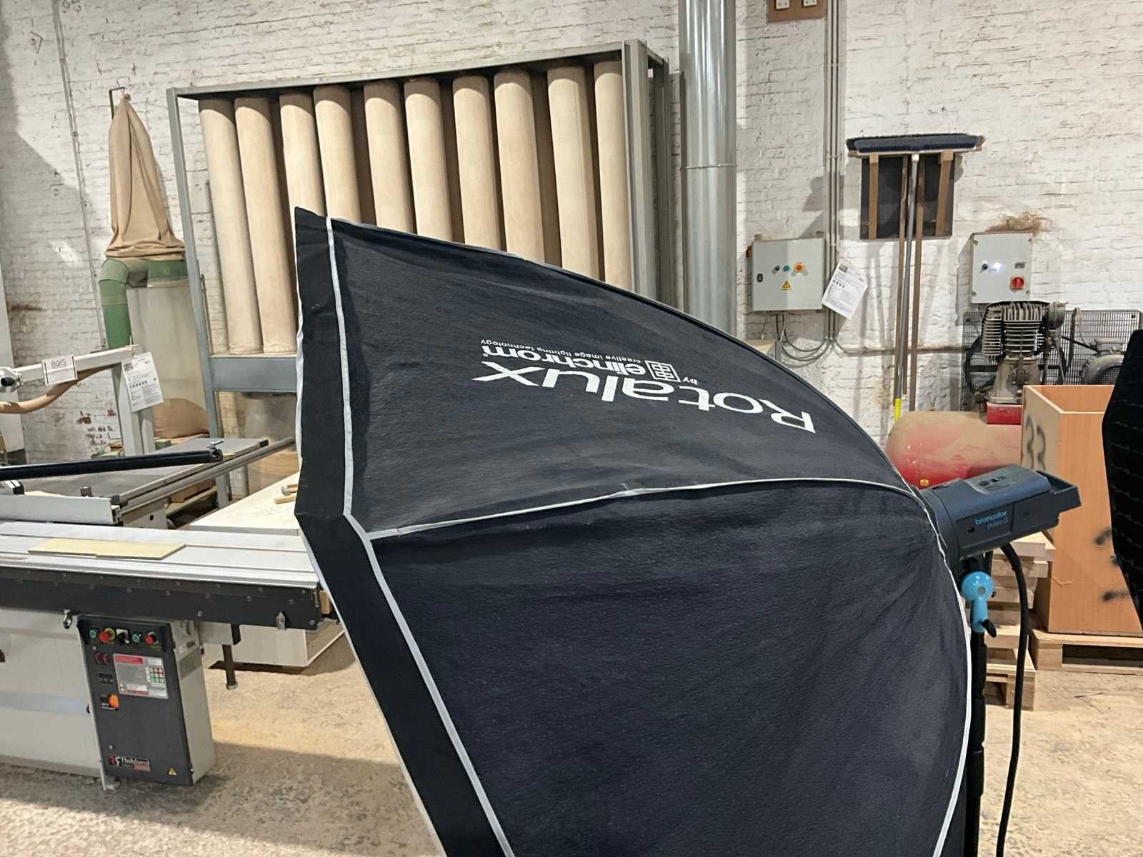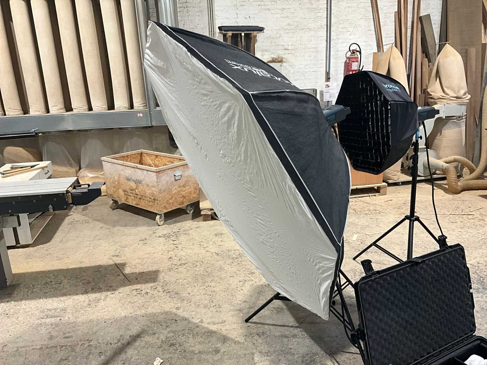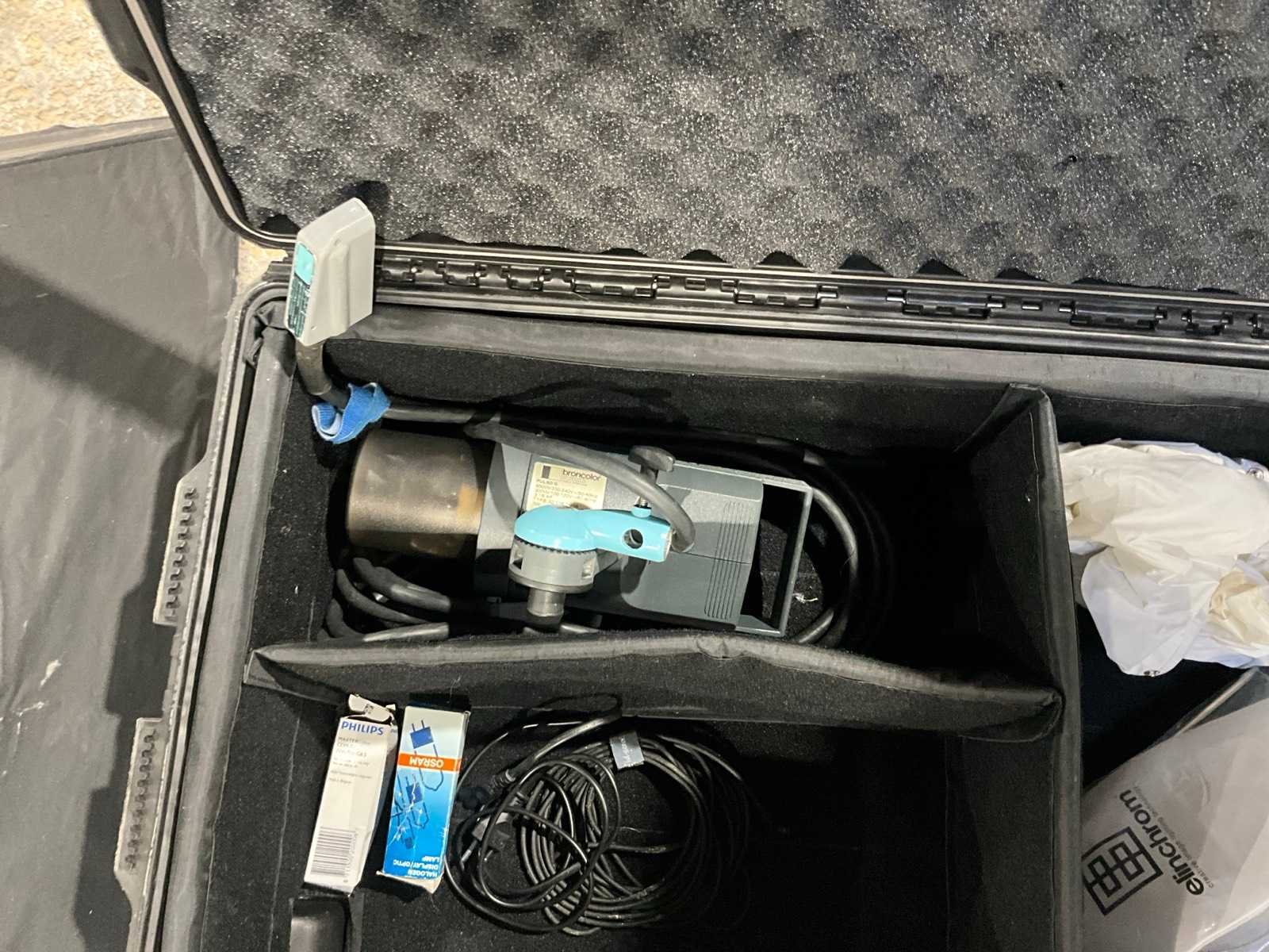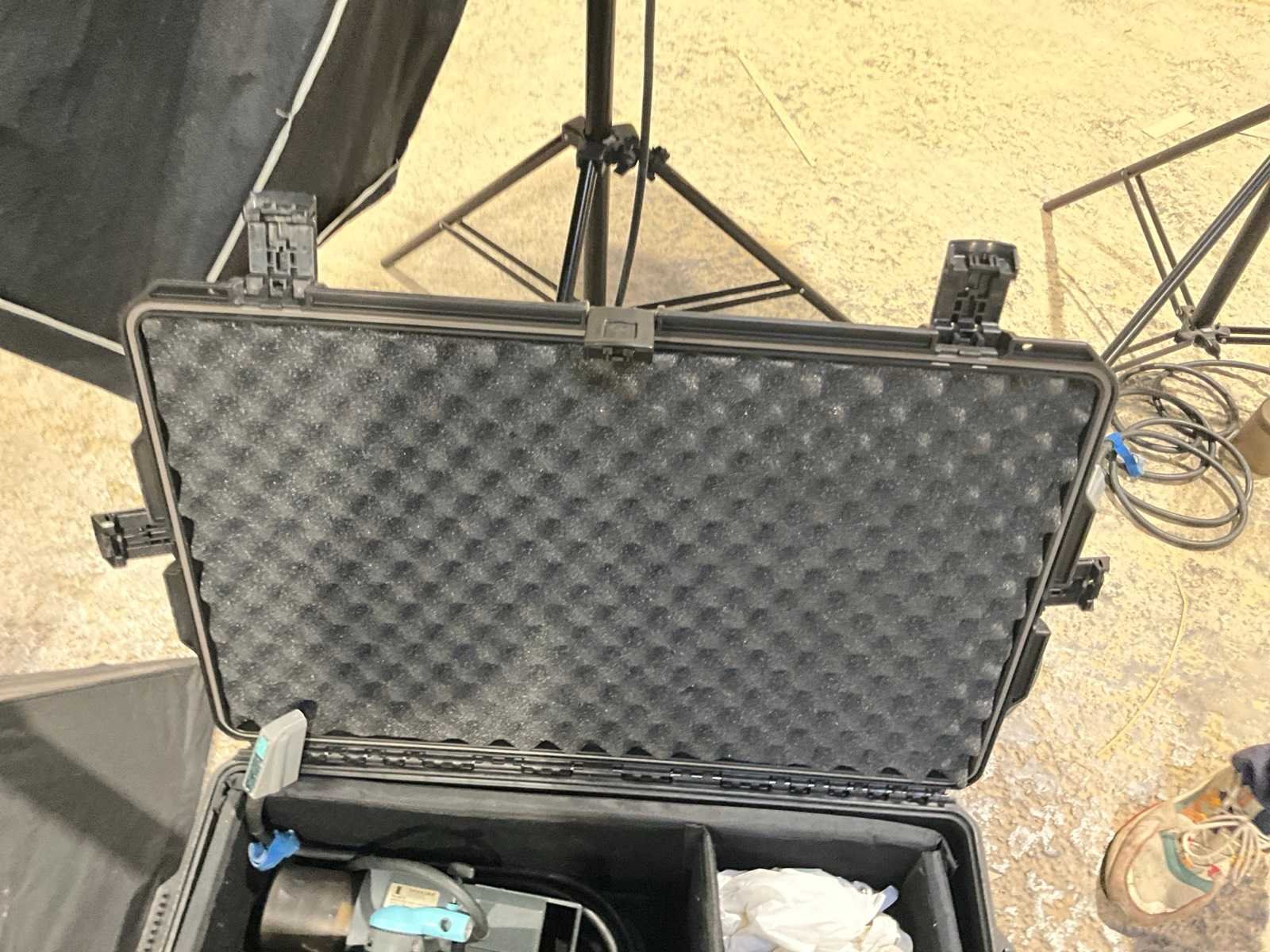 Bestaande uit generator verso A4, power Dock, 3x spotlight BRONCOLOR PULSO G, 5 diverse koepels waaronder octabox 75, Rotalux, verlengkabel, en verrijdbare trolley met accessoires Merk: Broncolor