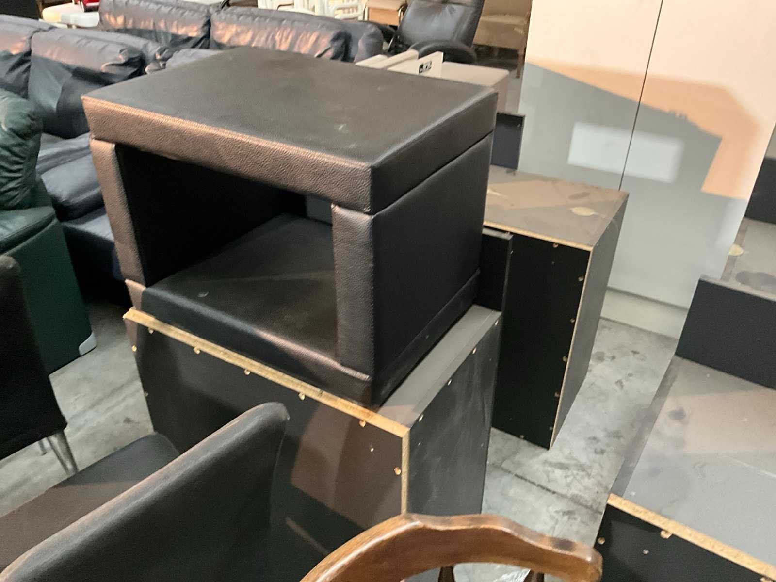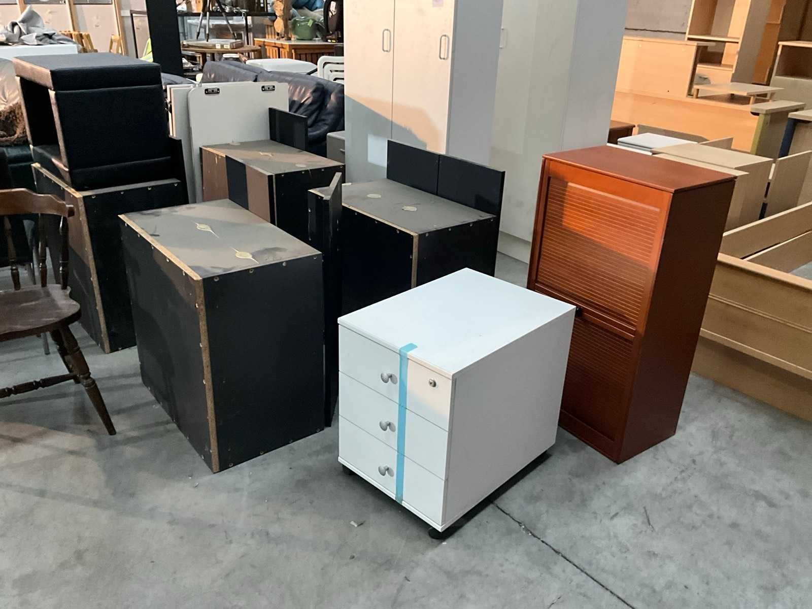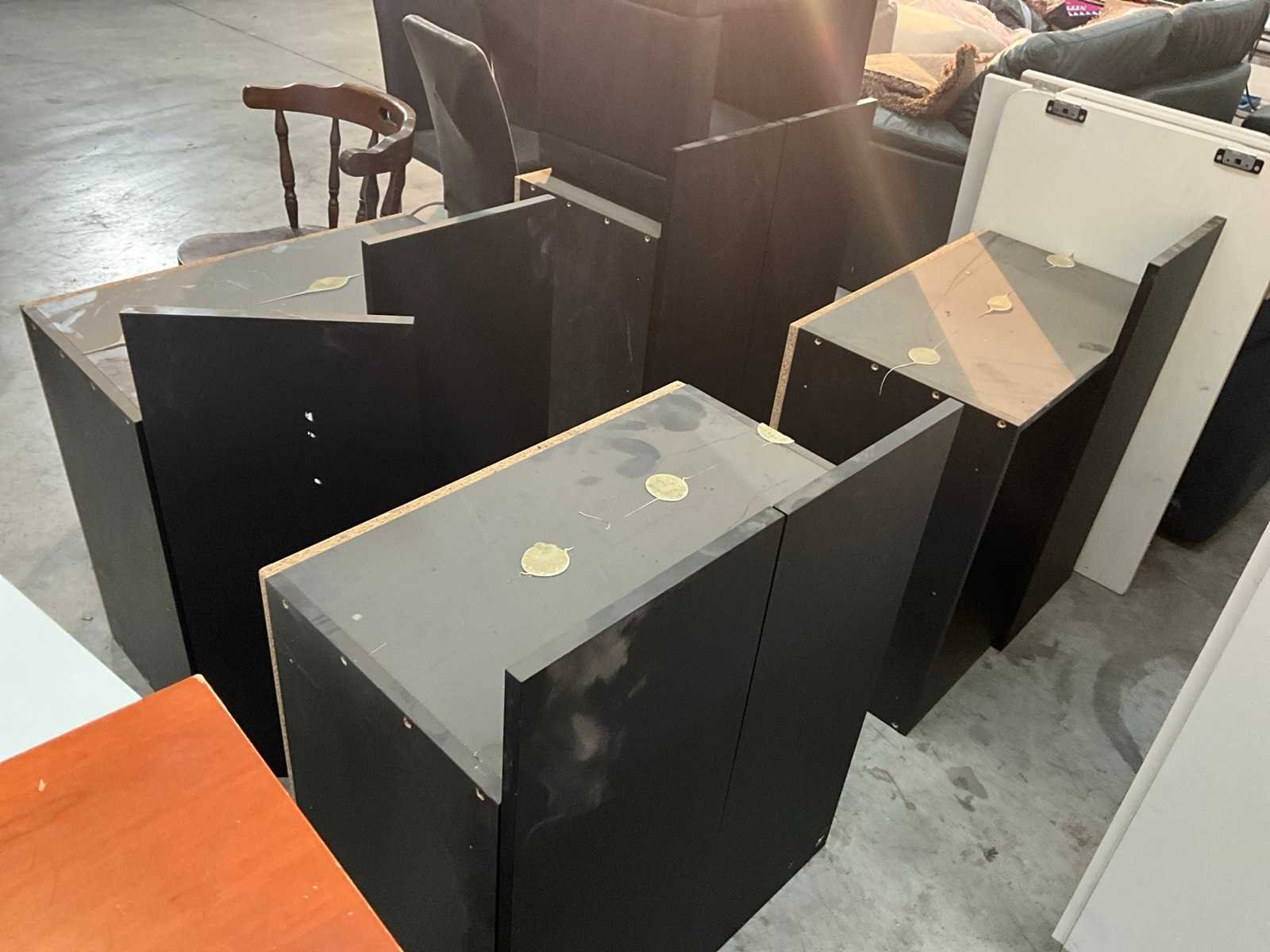 Bestaand uit 4x 2-deurs kast zwart fineer, 1x 3-ladekast wit fineer + rolluikkast massief + zitbankje