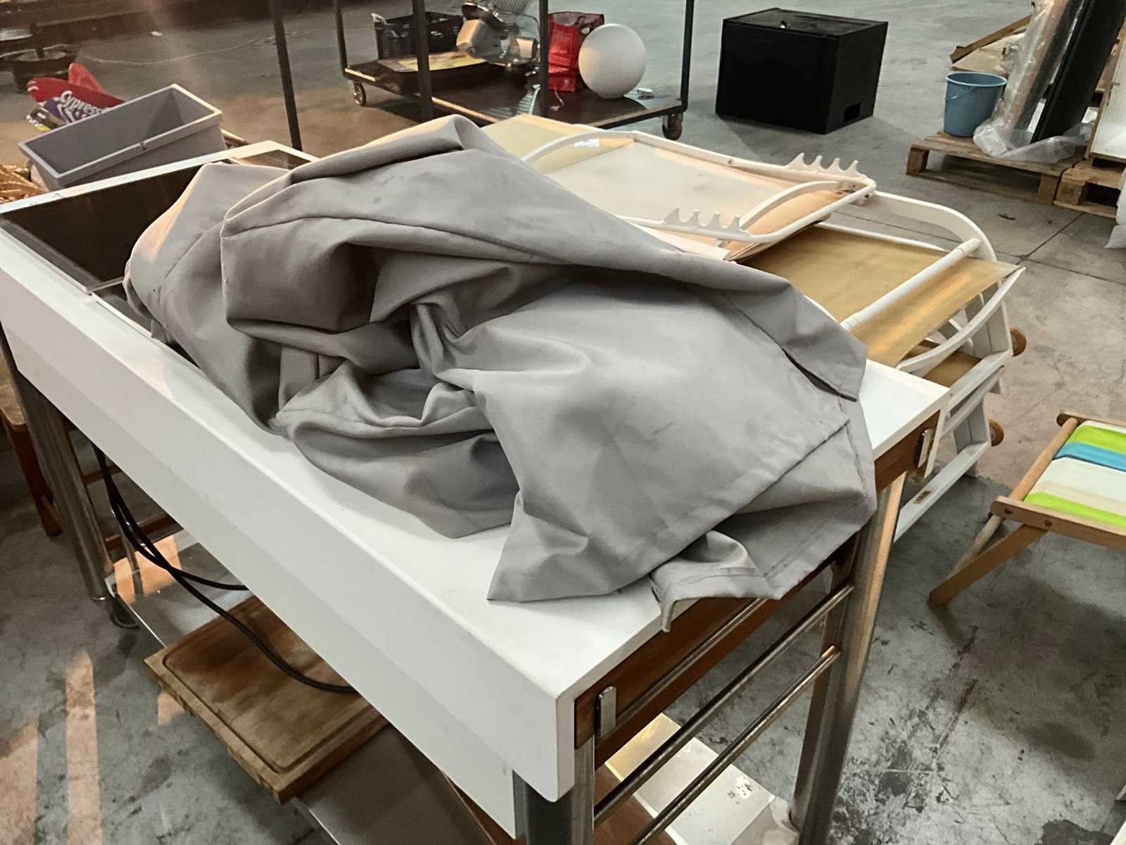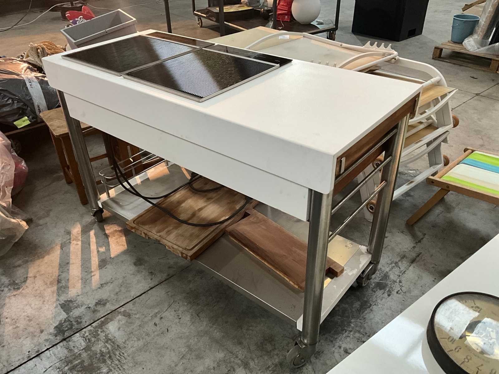 Voorzien van 2x bak-grilplaat afmeting per stuk 52x40 cm, RVS mobiel onderstel, houten snijplank, afdekhoes Merk: Indu+ Lengte: 60cm Breedte: 140cm Hoogte: 90cm Aansluiting: 220