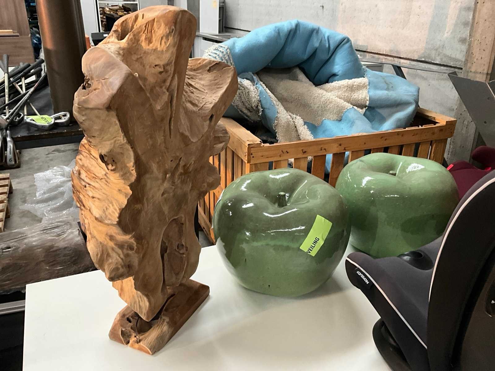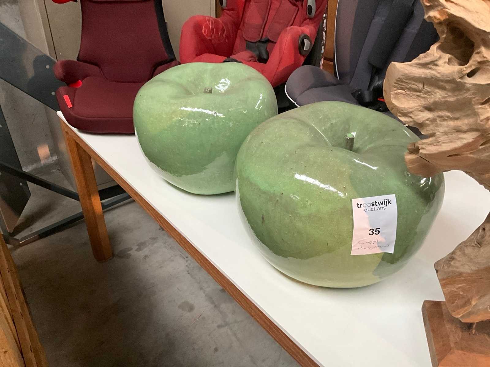Bestaand uit 2x stenen geëmailleerde appel groen diameter 40 cm, + 1x houten stuk op voet afmeting 25x50x80 cm