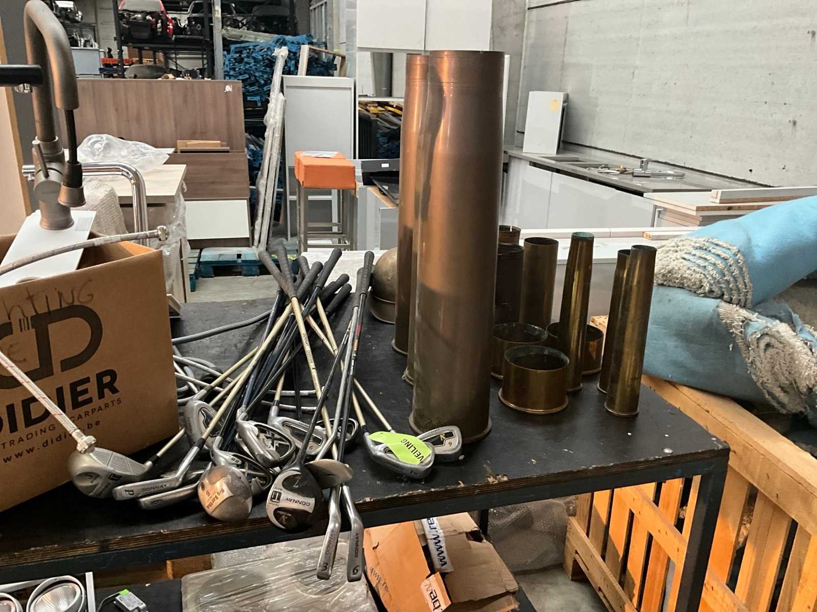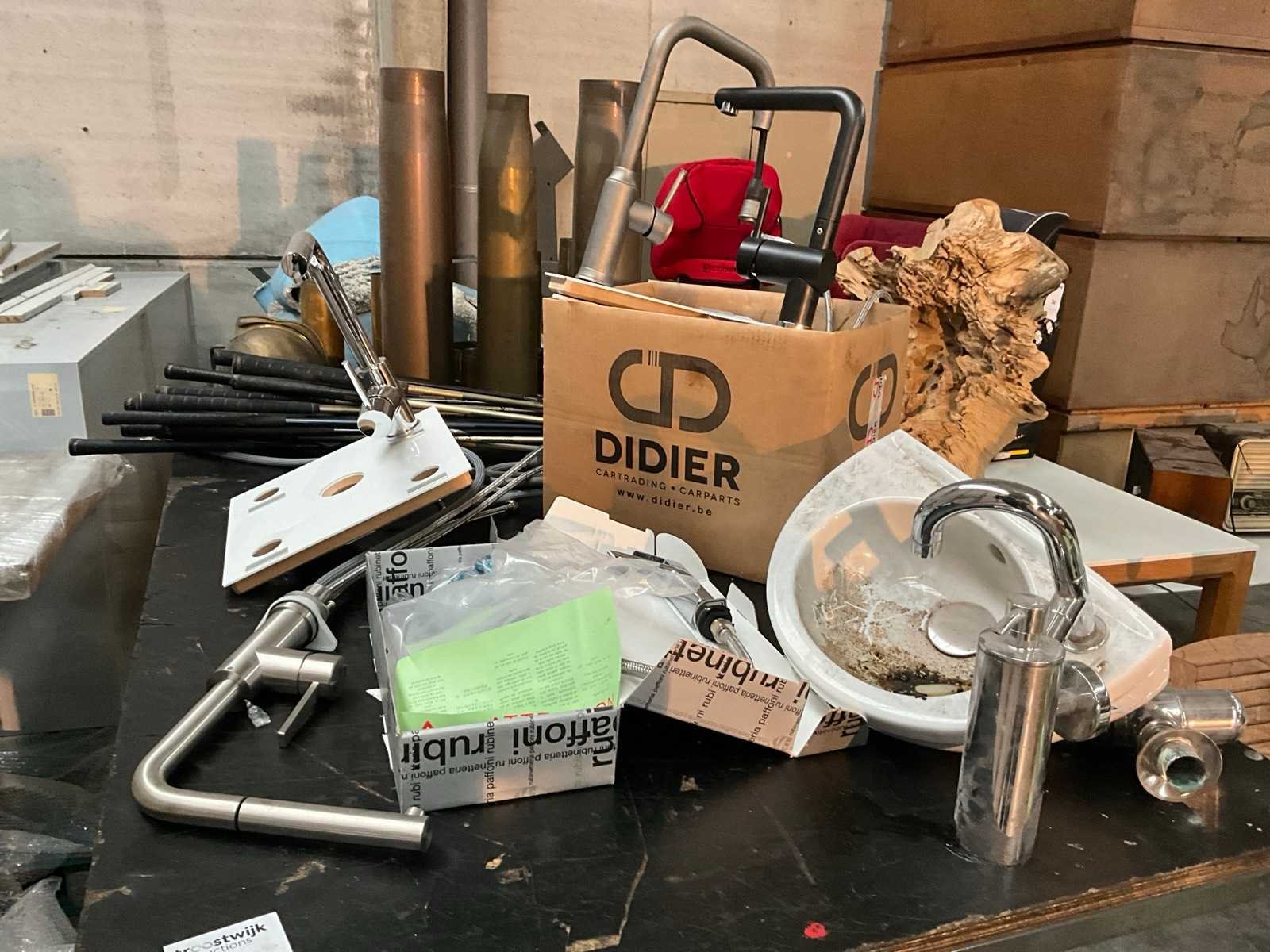 Bestaand uit 6x dubbele inbouwspot afmetingen 33x18 cm, partij diverse kranen en spoelkoppen + wasbakje, + circa 20 golfstokken + partij koper bomhulzen diverse hoogtes 8-62 cm + koperen helm, +1x 4-spits electrische kookplaat, kortom alles op en in de kar