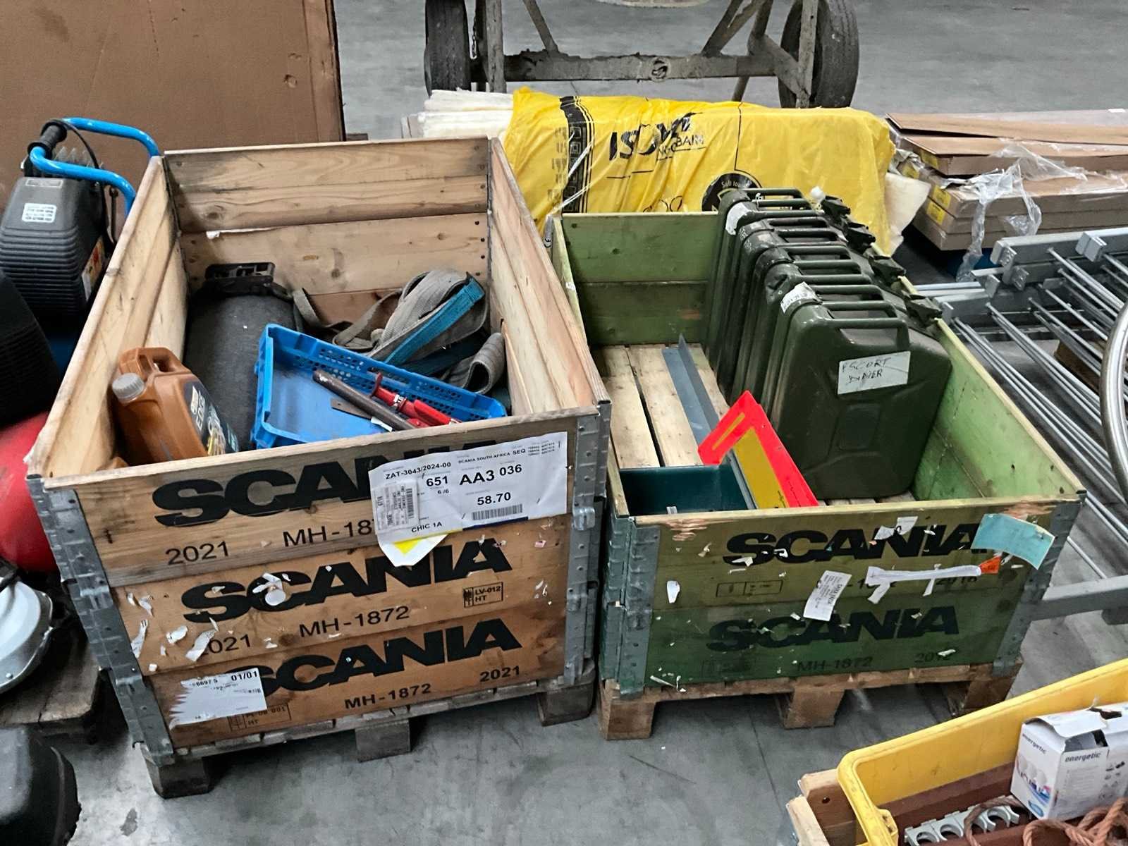 Bestaand uit 4x 20 liter plaatstalen jerrycans, zwenkwieltjes, diverse oliën ongebruikt, riemen en tools, in 2x palletbox