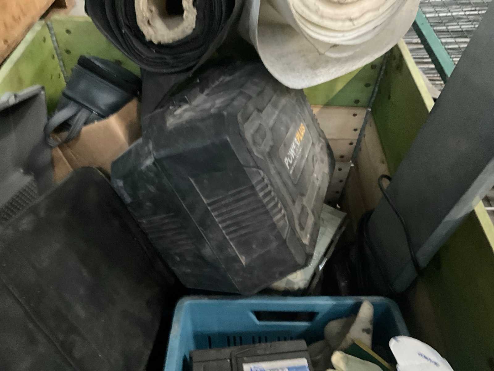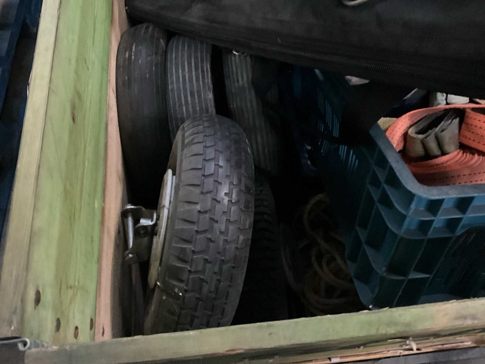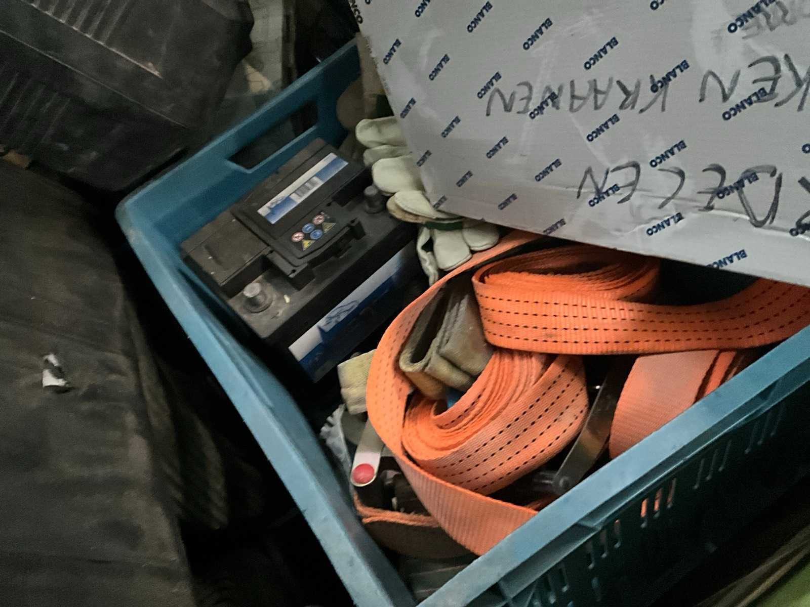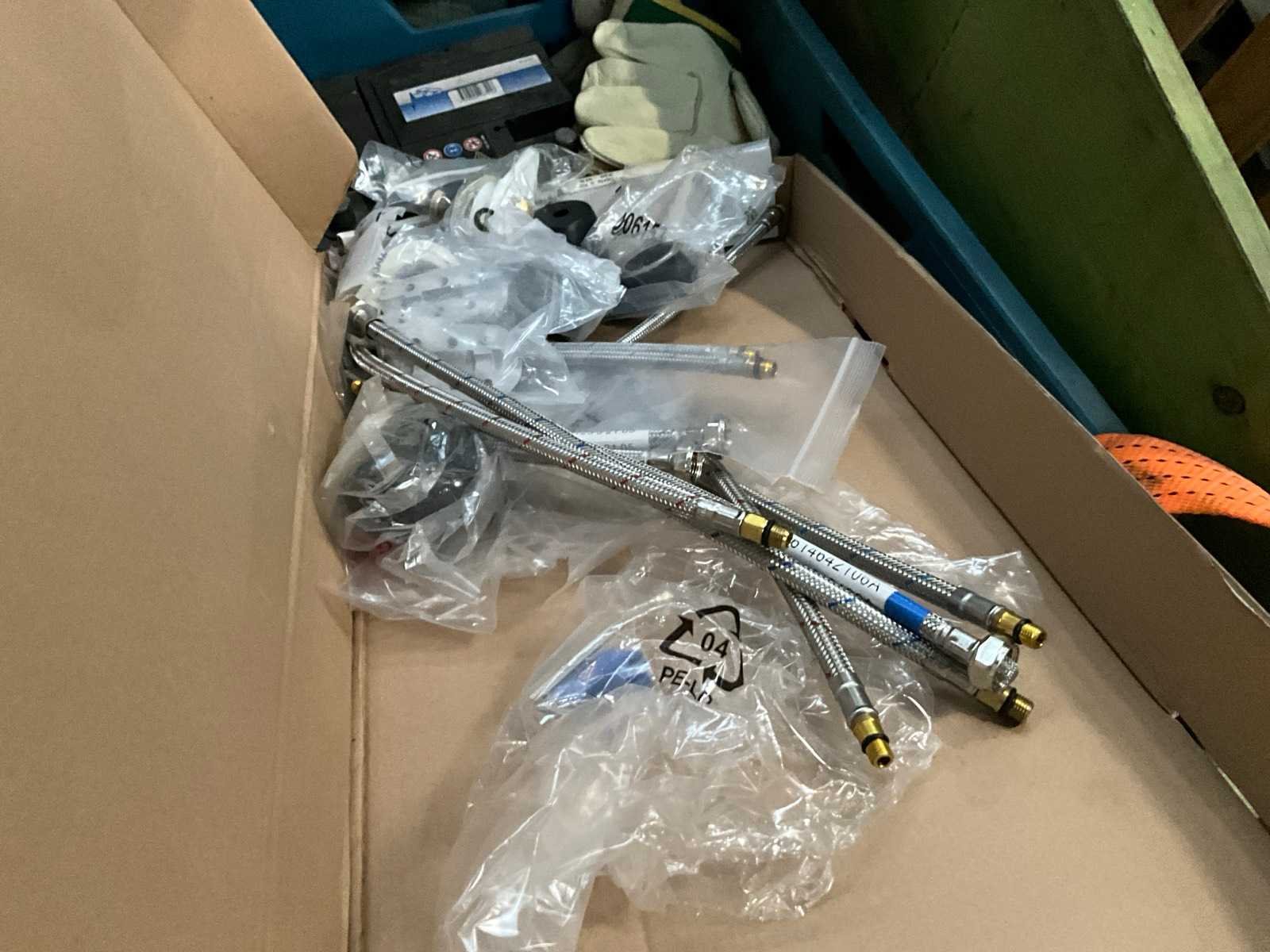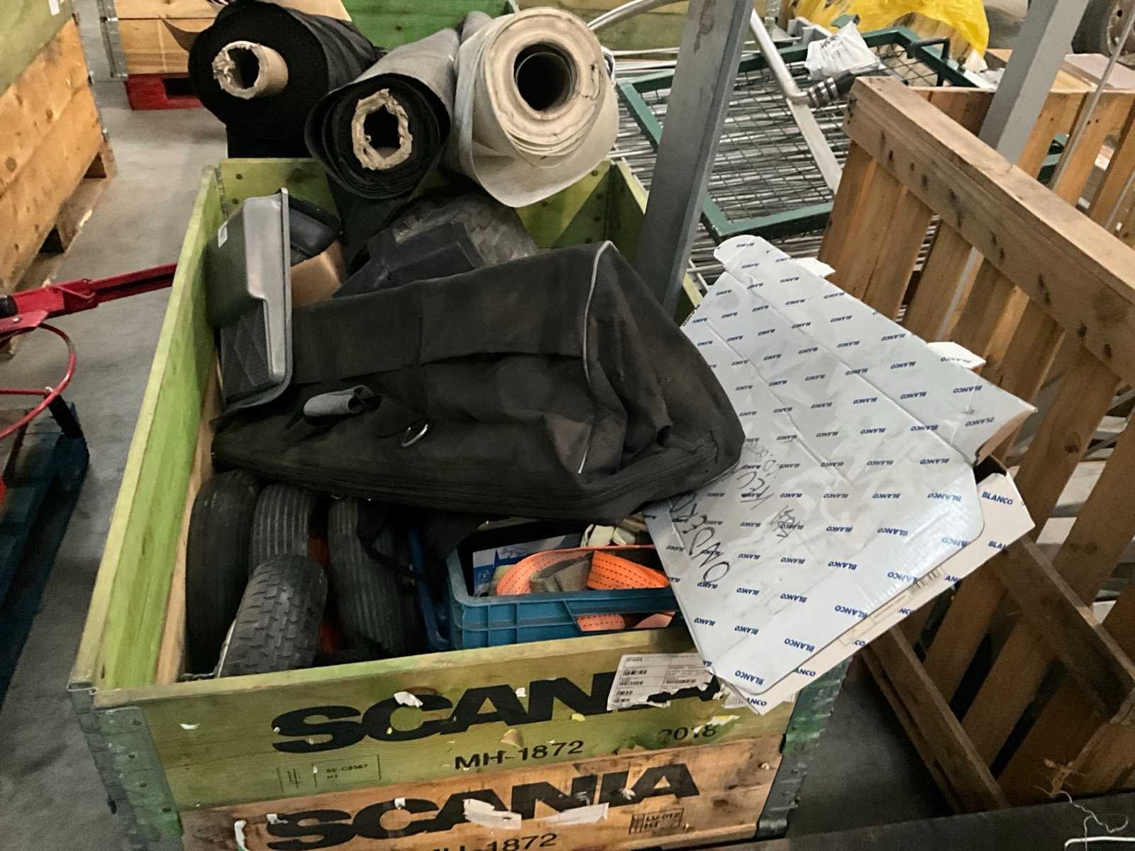 In palletbox, bestaande uit koppelstukken sanitair, startbatterij, spanriem, kruiwagenwielen, verlichting, afkort cirkelzaag enz..