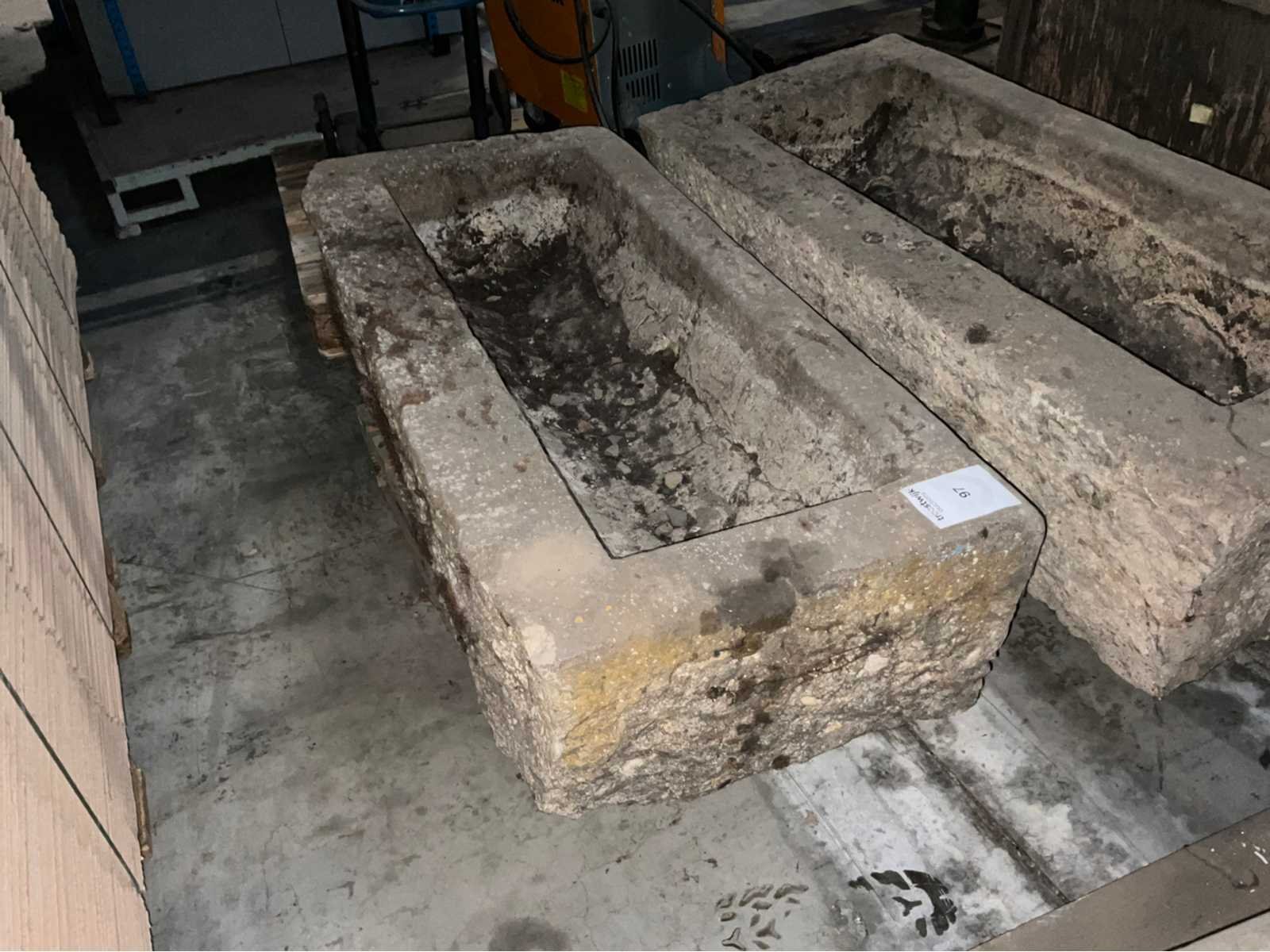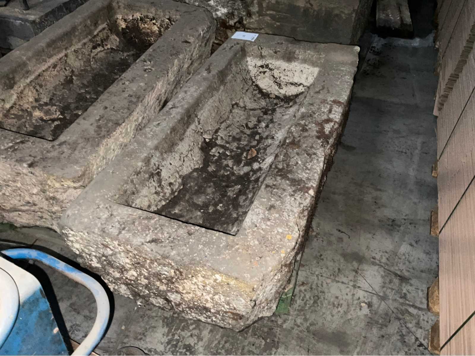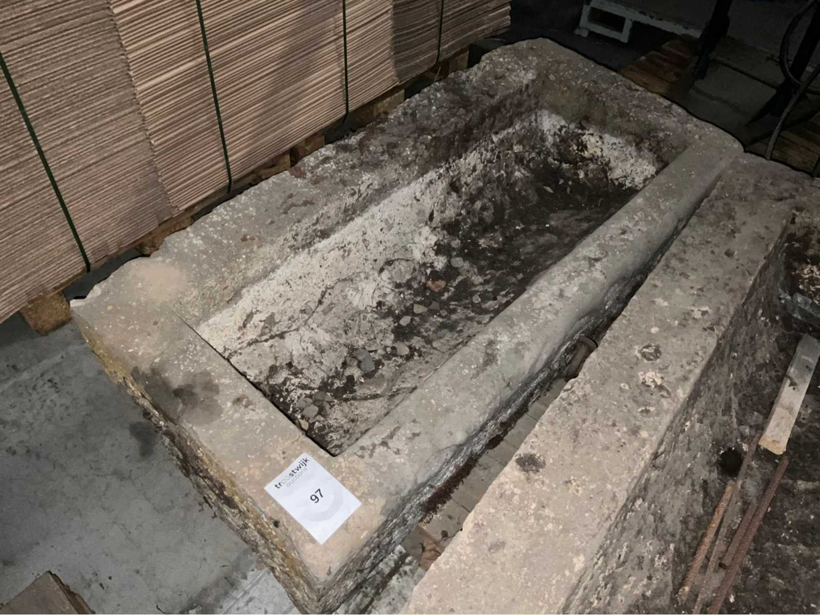 Bestaand uit uitgehauwde blauwsteen voederbak met bindring, gewicht circa 500 kg Totale afmeting L: 60cm Totale afmeting Breedte: 122cm Totale afmeting Hoogte: 40cm