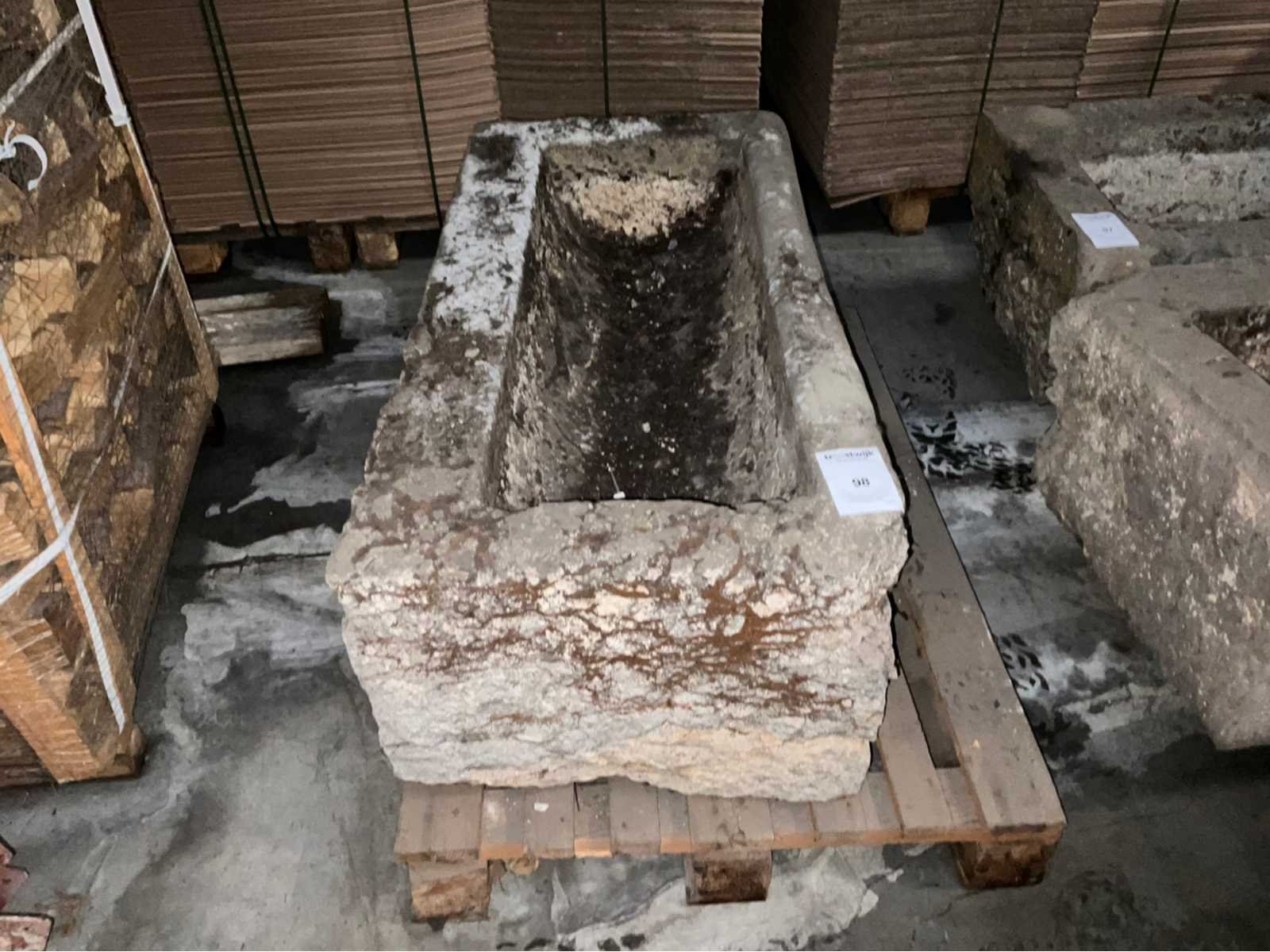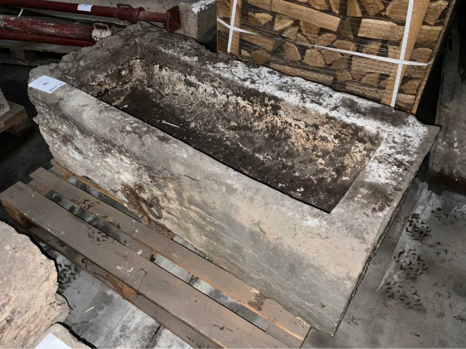 Bestaand uit uitgehauwde blauwsteen voederbak met bindring, gewicht circa 500 kg Totale afmeting L: 60cm Totale afmeting Breedte: 122cm Totale afmeting Hoogte: 40cm