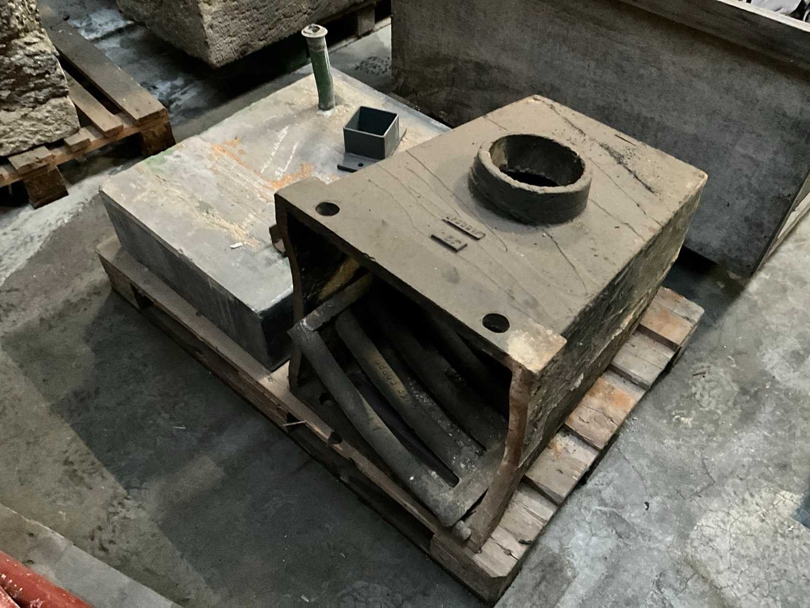 Bestaand uit betonnen voederbak afmetingen 46x200x20 cm, + 7x bouwschoor lengte in rust 165 cm, + gietijzeren straat verzamelpunt afvalwater afmeting 50x50x65 cm, op 2x pallet Totale afmeting L: 60cm Totale afmeting Breedte: 122cm Totale afmeting Hoogte: 40cm