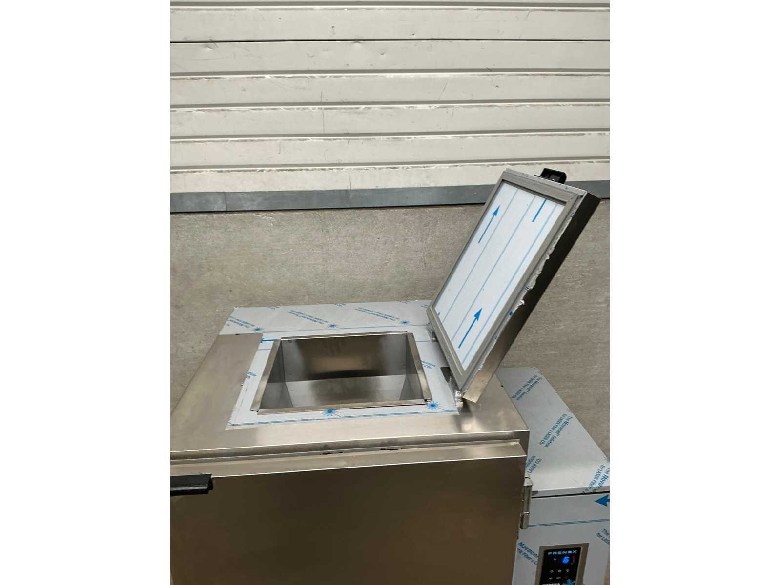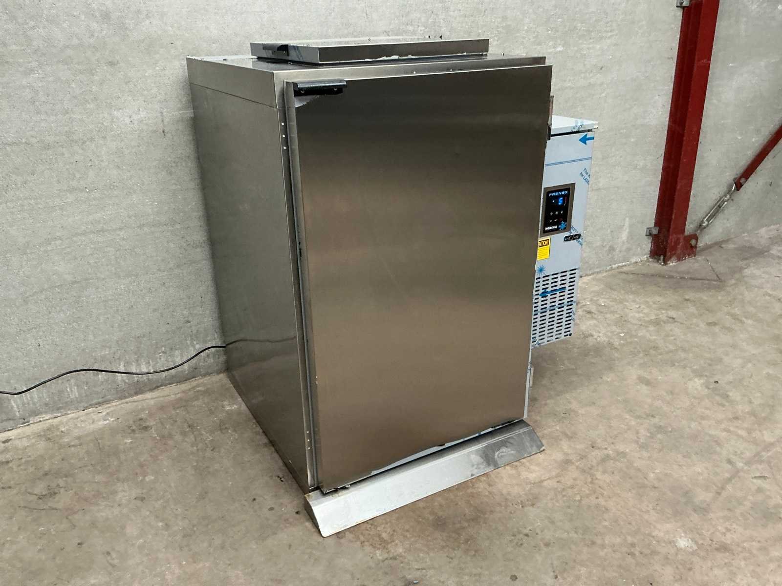 Afvalcontainer met capaciteit van 120 liter voorzien van koelsysteem, ongebruikt Merk: Frenox Type: PWT1-WP-R290 Rvs: true Met deksel: true Totale afmeting L: 1090mm Totale afmeting Breedte: 970mm Totale afmeting Hoogte: 1230mm