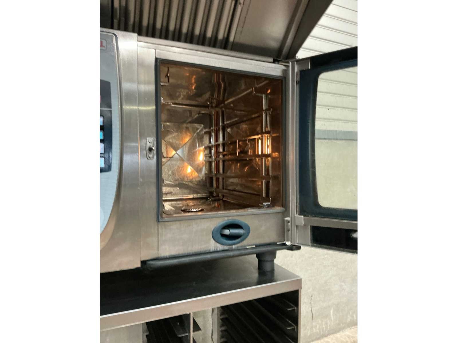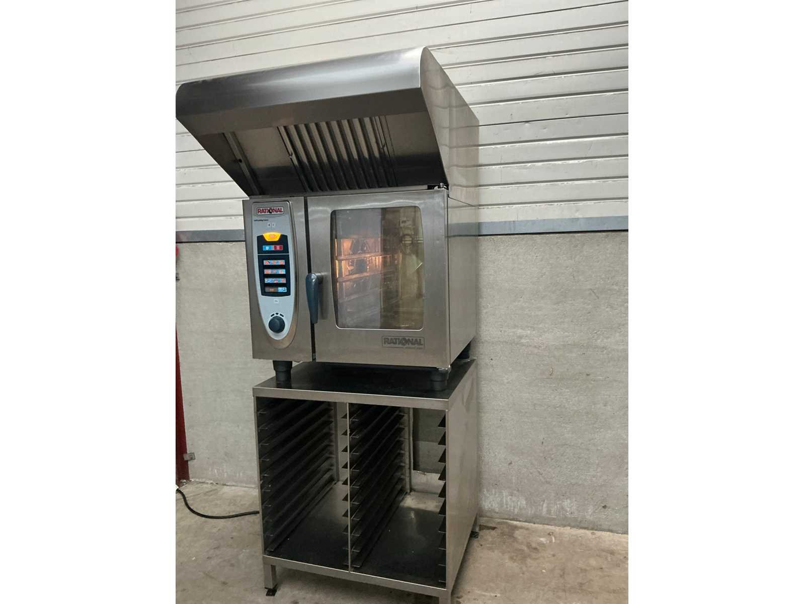 RVS combisteamer met 6 niveaus, op rvs onderstel met 20 regalen en afzuigkap Merk: Rational Type: SCC 61E Aantal niveau's: 6 Aansluiting: 400V Digitale besturing: true Elektrisch: true Rvs: true Totale afmeting L: 85cm Totale afmeting Breedte: 83cm Totale afmeting Hoogte: 110cm