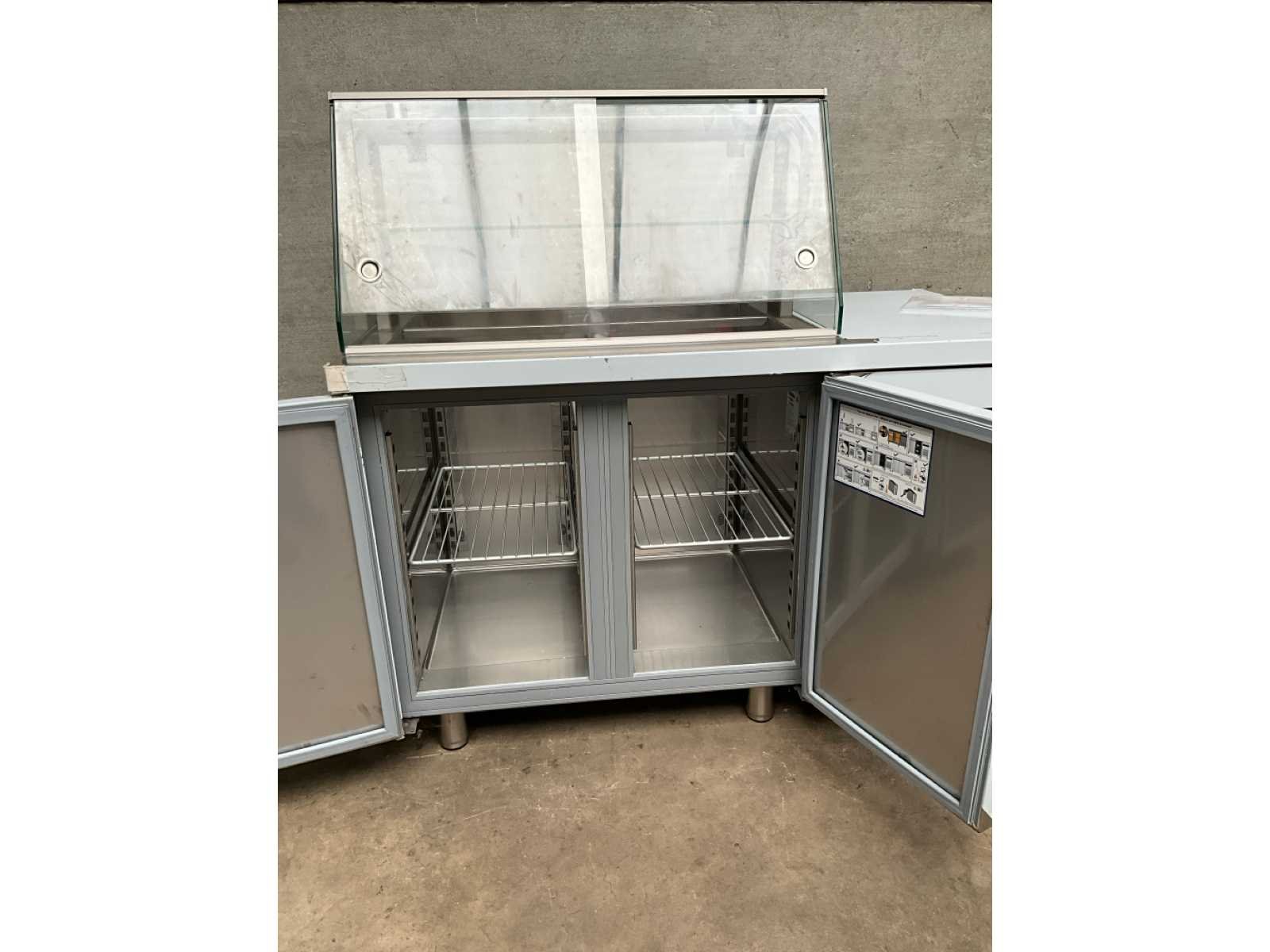 Rvs saldette, geschikt voor gastronorm bakken, met glasopbouw voorzien van 2 kunststof schuifdeuren, 2 klapdeuren met in hoogte verstelbare roosters, ongebruikt Merk: Inomak Type: ZQRP99 Ingebouwde koelcompressor: true Digitale uitlezing: true Rvs: true Aansluiting: 230V Totale afmeting L: 1360cm Totale afmeting Breedte: 700cm Totale afmeting Hoogte: 1310cm
